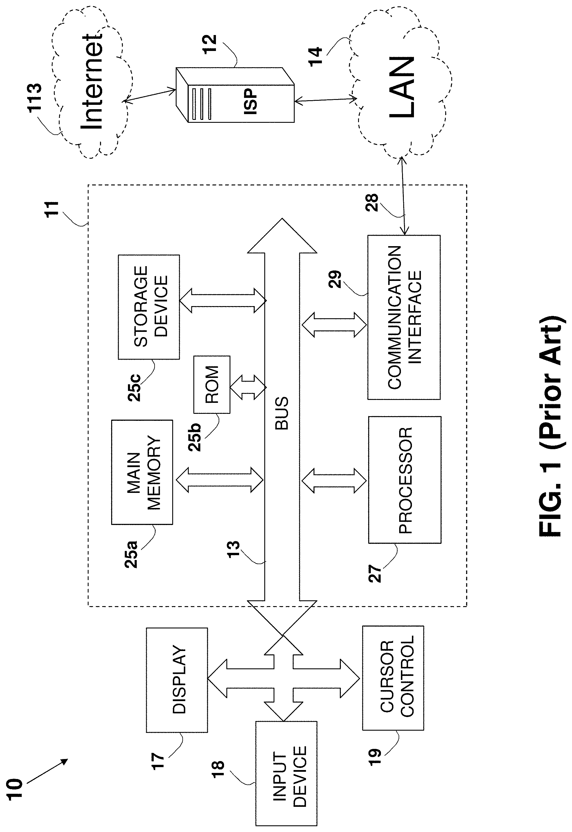 FIG. 1 shows a block diagram that illustrates a system 10 including a computer system 11 and an associated Internet 113 connection. Such configuration is typically used for computers (hosts) connected to the Internet 113 and executing a server or a client (or a combination) software. The system 11 may be used as a portable electronic device such as a notebook/laptop computer, a media player (e.g., MP3 based or video player), a desktop computer, a laptop computer, a cellular phone, a Personal Digital Assistant (PDA), an image processing device (e.g., a digital camera or video recorder), and/or any other handheld or fixed location computing devices, or a combination of any of these devices. Note that while FIG. 1 illustrates various components of a computer system, it is not intended to represent any particular architecture or manner of interconnecting the components; as such details are not germane. It will also be appreciated that network computers, handheld computers, cell phones and other data processing systems which have fewer components or perhaps more components may also be used. The computer system of FIG. 1 may, for example, be an Apple Macintosh computer or Power Book, or an IBM compatible PC. The computer system 11 includes a bus 13, an interconnect, or other communication mechanism for communicating information, and the processor 27, commonly in the form of an integrated circuit, coupled to the bus 13 for processing information and for executing the computer executable instructions. Computer system 11 also includes a main memory 25a, such as a Random Access Memory (RAM) or other dynamic storage device, coupled to bus 13 for storing information and instructions to be executed by the processor 27. Main memory 25a also may be used for storing temporary variables or other intermediate information during execution of instructions to be executed by processor 27. The computer system 11 further includes a Read Only Memory (ROM) 25b (or other non-volatile memory) or other static storage device coupled to the bus 13 for storing static information and instructions for the processor 27. A storage device 25c, such as a magnetic disk or optical disk, a hard disk drive (HDD) for reading from and writing to a hard disk, a magnetic disk drive for reading from and writing to a magnetic disk, and/or an optical disk drive (such as DVD) for reading from and writing to a removable optical disk, is coupled to bus 13 for storing information and instructions. The hard disk drive, magnetic disk drive, and optical disk drive may be connected to the system bus by a hard disk drive interface, a magnetic disk drive interface, and an optical disk drive interface, respectively. The drives and their associated computer-readable media provide non-volatile storage of computer readable instructions, data structures, program modules and other data for the general purpose computing devices. Typically, the computer system 11 includes an Operating System (OS) stored in a non-volatile storage for managing the computer resources and provides the applications and programs with an access to the computer resources and interfaces. An operating system commonly processes system data and user input, and responds by allocating and managing tasks and internal system resources, such as controlling and allocating memory, prioritizing system requests, controlling input and output devices, facilitating networking and managing files. Non-limiting examples of operating systems are Microsoft Windows, Mac OS X, and Linux.