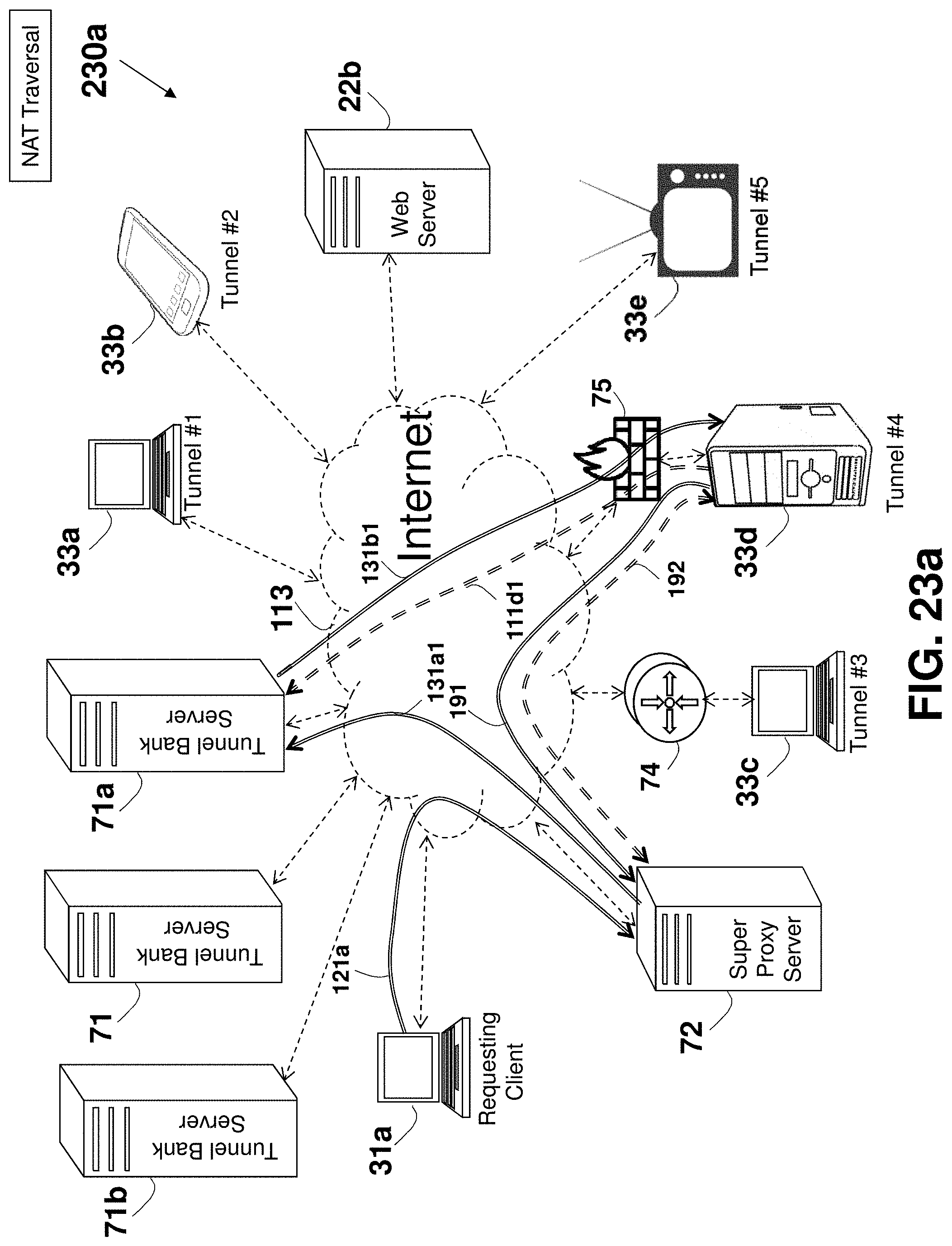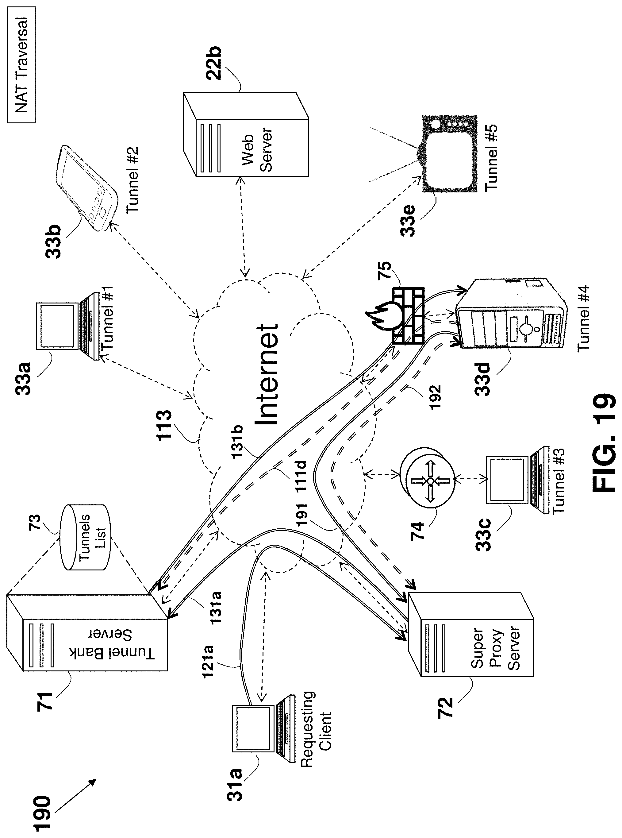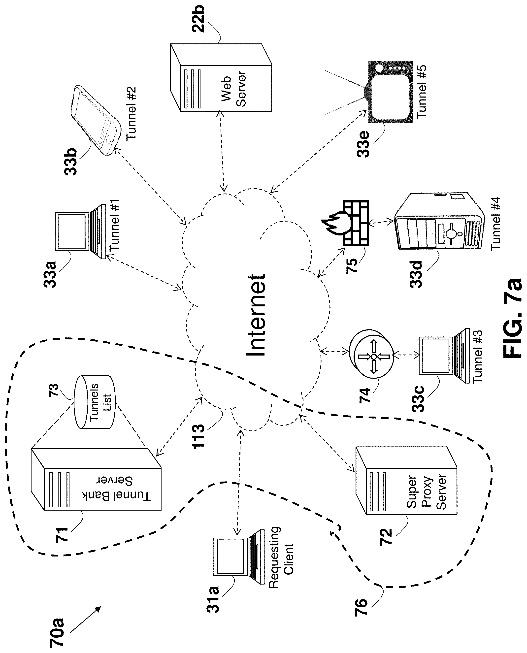 While the communication sessions between the elements herein, such as between servers and clients, are exampled to be over the Internet 113 using Internet Protocol (IP) or TCP/IP, any other communication protocols may be equally used, such as a Local Area Network (LAN), a Wireless LAN (WLAN), a Metropolitan Area Network (MAN), a Wireless MAN (WMAN), a Wide Area Network (WAN), a Wireless WAN (WWAN), a Personal Area Network (PAN), a Wireless PAN (WPAN), devices and/or networks operating substantially in accordance with existing IEEE 802.11, 802.11a, 802.11b, 802.11g, 802.11k, 802.11n, 802.11r, 802.16, 802.16d, 802.16e, 802.20, 802.21 standards. For example, each of, or all of, the communication path 111a between the tunnel device #1 33a and the TB server 71, the communication path 111b between the tunnel device #2 33b and the TB server 71, the communication path 111c between the tunnel device #3 33c and the TB server 71, the communication path 111d between the tunnel device #4 33d and the TB server 71, and the communication path 11e between the tunnel device #5 33e and the TB server 71, may use any one of the protocols associated with a Local Area Network (LAN), a Wireless LAN (WLAN), a Metropolitan Area Network (MAN), a Wireless MAN (WMAN), a Wide Area Network (WAN), a Wireless WAN (WWAN), a Personal Area Network (PAN), a Wireless PAN (WPAN), devices and/or networks operating substantially in accordance with existing IEEE 802.11, 802.11a, 802.11b, 802.11g, 802.11k, 802.11n, 802.11r, 802.16, 802.16d, 802.16e, 802.20, 802.21 standards. Similarly, each of, or all of, the communication path 121a between the client device 31a and the SP server 72, the communication path 131a between the SP server 72 and the TB server 71, the communication path 131c or 131d between the tunnel device #4 33d and the web server 22b, and the communication path 191 or 192 between the SP server 72 and the tunnel device #4 33d, may use a Local Area Network (LAN), a Wireless LAN (WLAN), a Metropolitan Area Network (MAN), a Wireless MAN (WMAN), a Wide Area Network (WAN), a Wireless WAN (WWAN), a Personal Area Network (PAN), a Wireless PAN (WPAN), devices and/or networks operating substantially in accordance with existing IEEE 802.11, 802.11a, 802.11b, 802.11g, 802.11k, 802.11n, 802.11r, 802.16, 802.16d, 802.16e, 802.20, 802.21 standards.