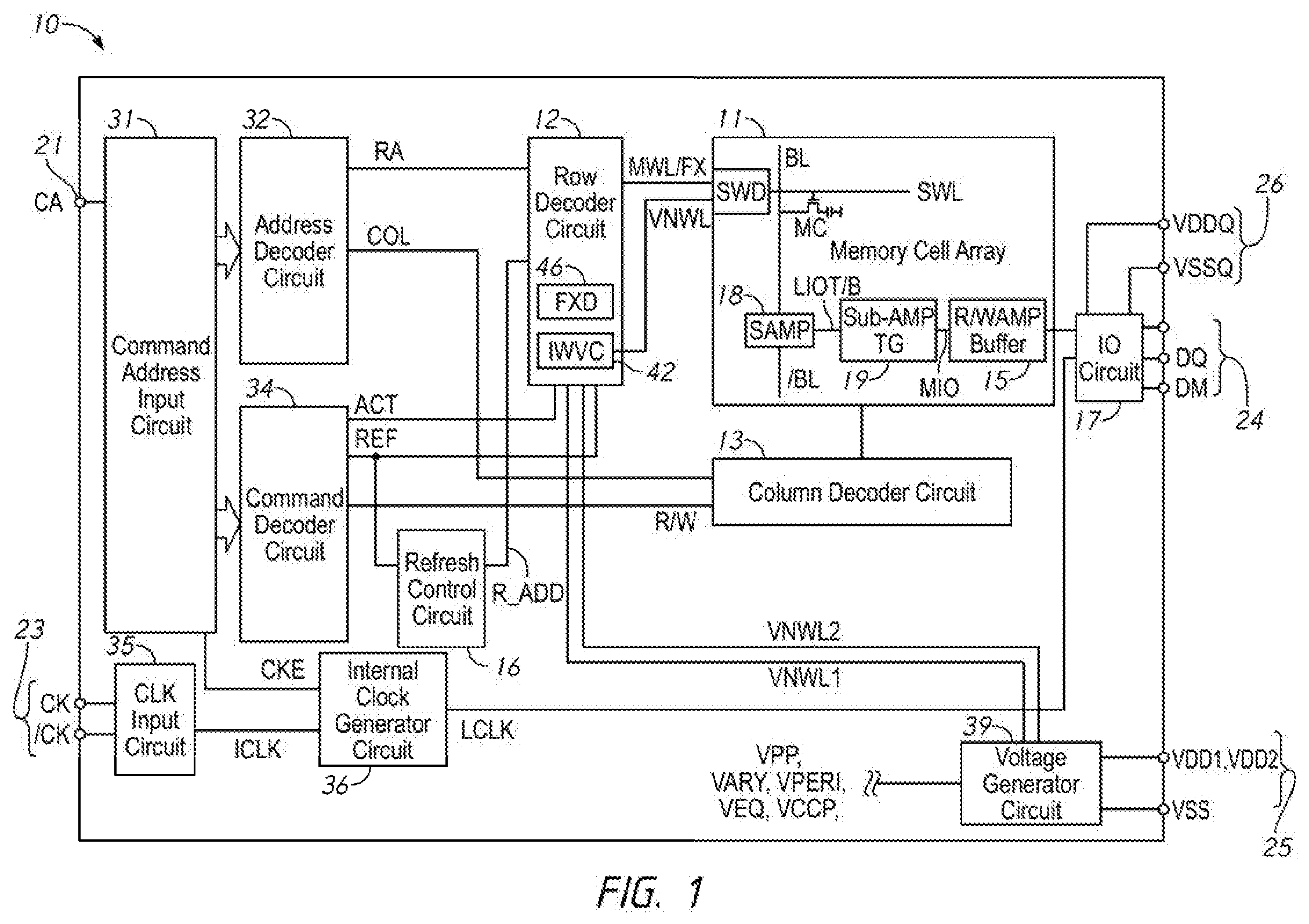 A semiconductor memory device, such as a DRAM (Dynamic Random Access Memory) includes a memory cell array, having memory cells disposed at intersections between word lines and bit lines. The semiconductor memory device may include hierarchically structured word lines and subword lines. The main word line is a word line positioned at an upper hierarchy, and is selected by a first portion of a row address. The subword line is a word line positioned at a lower hierarchy, and is selected based on a corresponding main word line (NIWL) and a word driver line (FX) selected by a second portion of the ro address, Due to the scaling down of array access desires in semiconductor fabrication, such as the pitch size of transistor circuits becoming smaller and the need for rebalancing of the doping of implants, the, inherent access device off-state leakage increases. This increased access device IOFF leakage may cause the memory device to be less reliable, For example, cells that are storing data of “1” may be affected when sense amplifiers are driving the bit lines to “0”. Such increased access device IOFF leakage has imposed limits on further scaling of, the memory cell. As such, reducing the access device lOFF leakage is desirable. Certain details are set forth below to provide a sufficient understanding of examples of various embodiments of the disclosure. However, it is appreciated that examples described herein may be practiced without these particular details, Moreover, the particular examples of the present disclosure described herein should not be construed to limit the scope of the disclosure to these particular examples. In other instances, well-known circuits, control signals, timing protocols, and software operations have not been shown in detail in order to avoid unnecessarily obscuring embodiments of the disclosure. Additionally, terms such as “couples” and “coupled” mean that two components may be directly or indirectly electrically. coupled. Indirectly coupled may imply that two components are coupled through one or more intermediate components. A semiconductor memory device may include hierarchically structured main word lines and subword lines. The main word line is a word line positioned at an upper hierarchy, and is selected by a first portion of a row address. The subword line is a word line positioned at a lower hierarchy, and is selected based on a corresponding main word line (MWL) and a word driver line (FX). which is selected by a second portion of the row address. The MWL may be driven by main word drivers (MWD) and the word driver line FX may be driven by word drivers (FXD). Both the MWL and FX must be driven to active states to select the desired subword line in the memory device. The subword lines are driven by subword drivers. When the subword line is driven to an active potential, the memory cell is connected to the corresponding bit line. On the other hand, during a period in which the subword line is driven to a non-active potential, the memory cell and the bit line are kept in a cut-off state. In driving subword lines to the active potential, relatively high voltages are provided to the subword drivers of a memory mat In contrast, in driving the sulnvord line to a non-active potential, relatively low voltages are provided to the subword drivers of the memory mat. When a memory bank has been activated, the access device IOFF leakage tends to increase. As such, a subword line being active for a longer time duration may have a higher risk than a subword line being active for a short time duration on corrupting an inactive subword line. In some examples, following a time duration after activation of a word line (to activate a bank), when an access device IOFF leakage in the activated bank may occur, the default (e.g., relatively low or a negative voltage) non-active potential is set a reduced voltage non-active potential. This reduced voltage non-active potential may decrease access device IOFF leakage associated with activation of the memory bank. Following deactivation of a row that had been involved in a page access operation, the non-active potential is restored to the default voltage. Providing the reduced voltage following a time duration after activation of the memory bank, may consume less power than, for example, providing the reduced voltage immediately when the memory bank is activated. That is, providing the reduced voltage for a portion of the time the memory bank is active may consume less power than providing the reduced voltage for the entire time the memory bank is active. In some examples, the row decoder circuit 12 may also include an inactive word line voltage control (IWVC) circuit 42 to supply the memory cell array with an off stave word line voltage (VNWL) as the non-active potential of the subword drivers. The VNWL may vary depending on the activation state of the memory cell array 11. For example, when a word line is held active after a time duration, the VNWL may switch/shift from a first VNWL, e.g., VNWL1, to a second VNWL, e.g., VNWL2. The VNWL1 may be a default non-active potential. In some embodiments of die disclosure, die default non-active potential is a negative voltage level. The VNWL2 may be a reduced voltage that is less than the default voltage VNWL1. When the memory cell array is pre-charged, the VNWL may switch/shift to the default negative voltage VNWL1. The reduced VNWL2 may result in a reduction of access device IOFF leakage, especially for memory cells that are being accessed. With further reference to The command and address terminals 21 are supplied with command and address signals CA. The CA signals provided to the command and address terminals 21 include commands and addresses. Addresses included in the CA signals are transferred via a command/address input circuit 31 to an address decoder circuit 32. The address decoder circuit 32 receives the addresses and supplies a decoded row address signal RA to the r