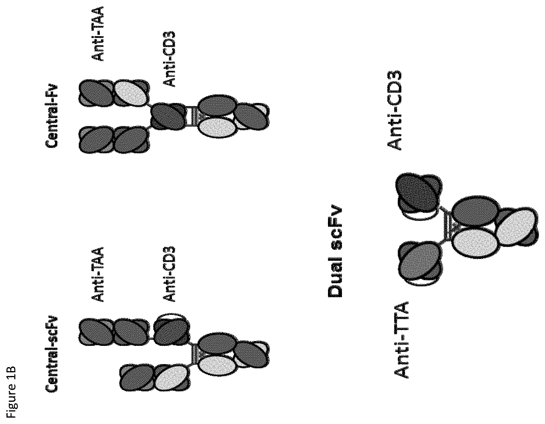 3) a scFv comprising a scFv variable light domain, an scFv linker and a scFv variable heavy domain; wherein said scFv is covalently attached between the C-terminus of said CH1 domain and the N-terminus of said first Fc domain using domain linkers;