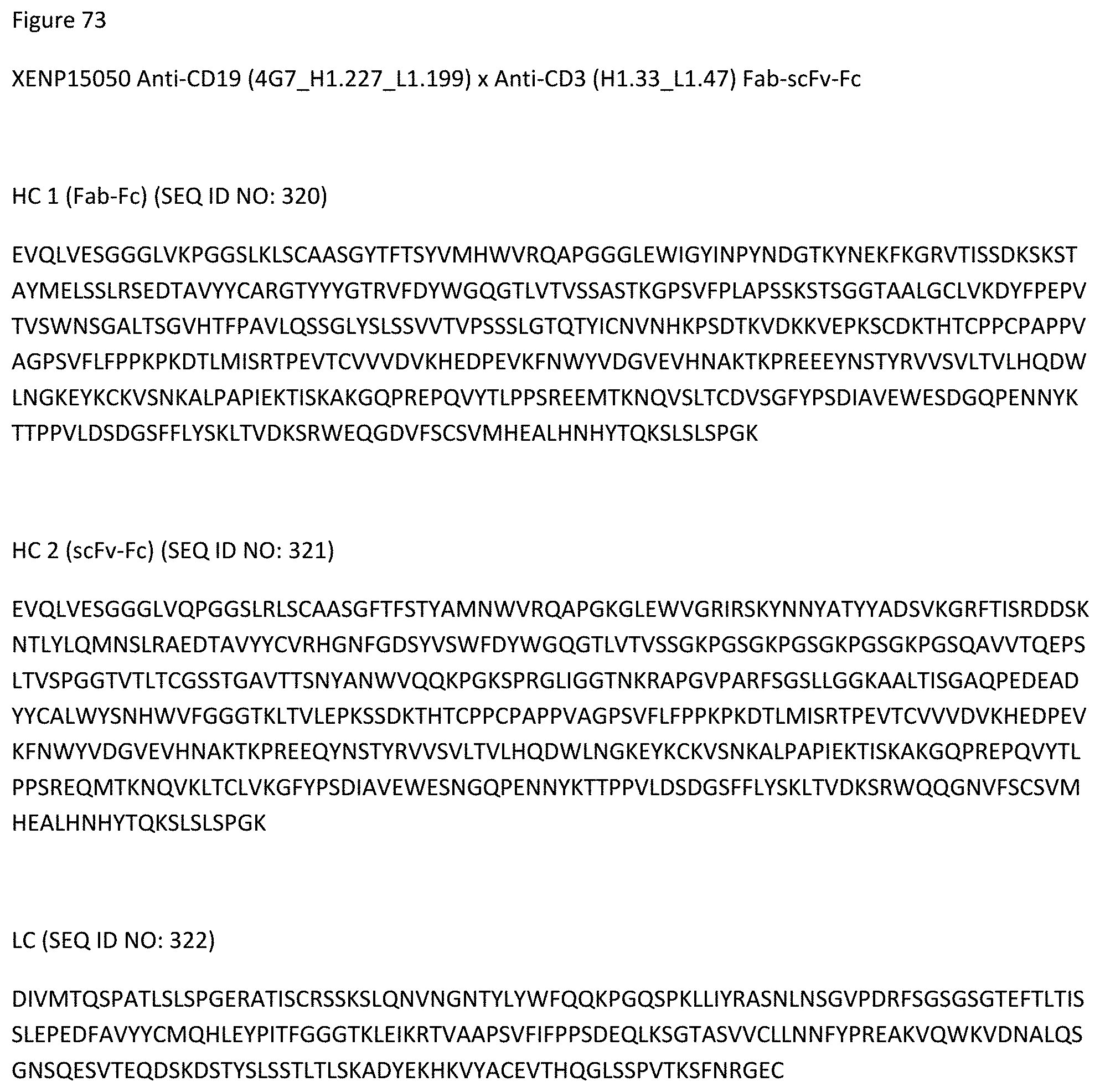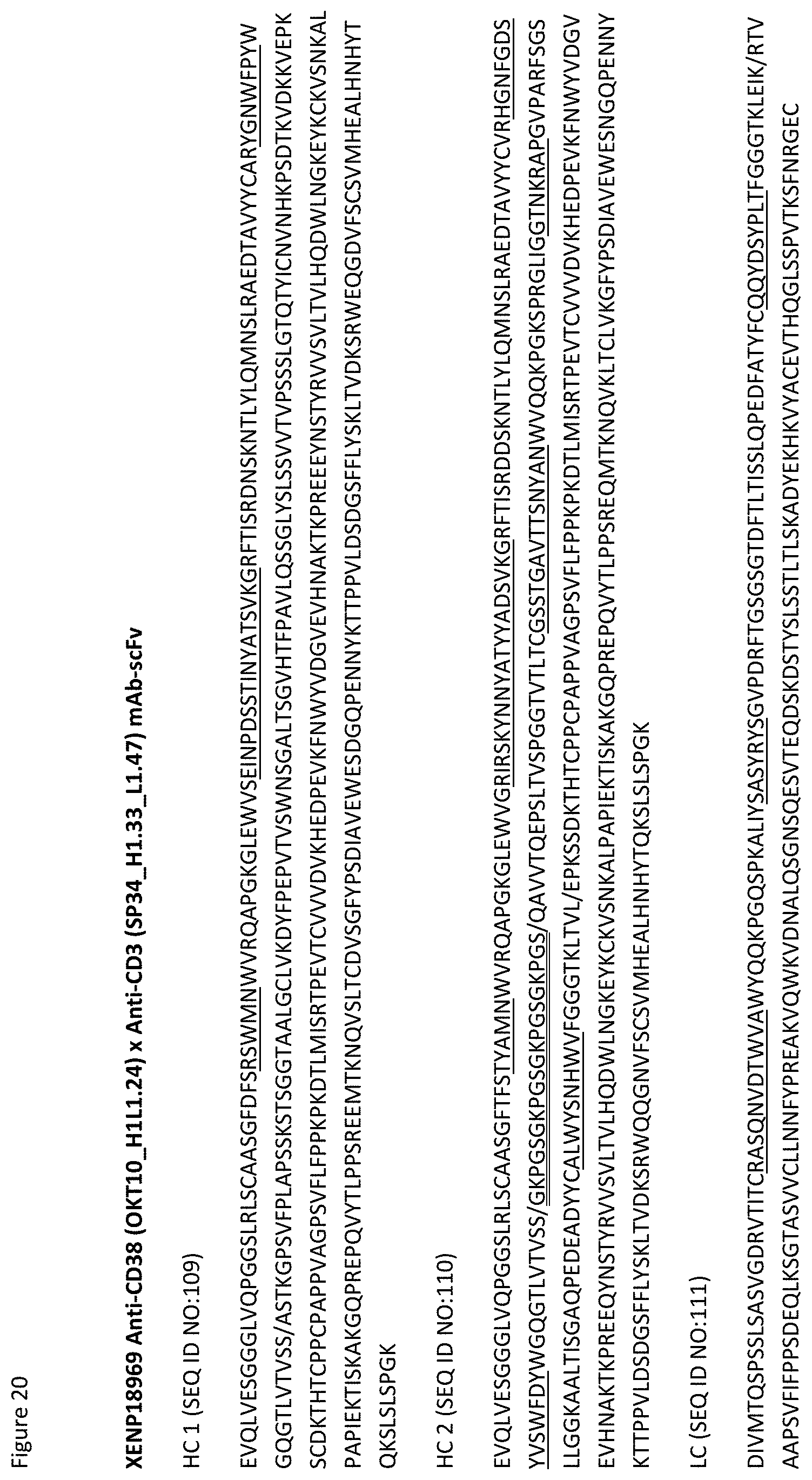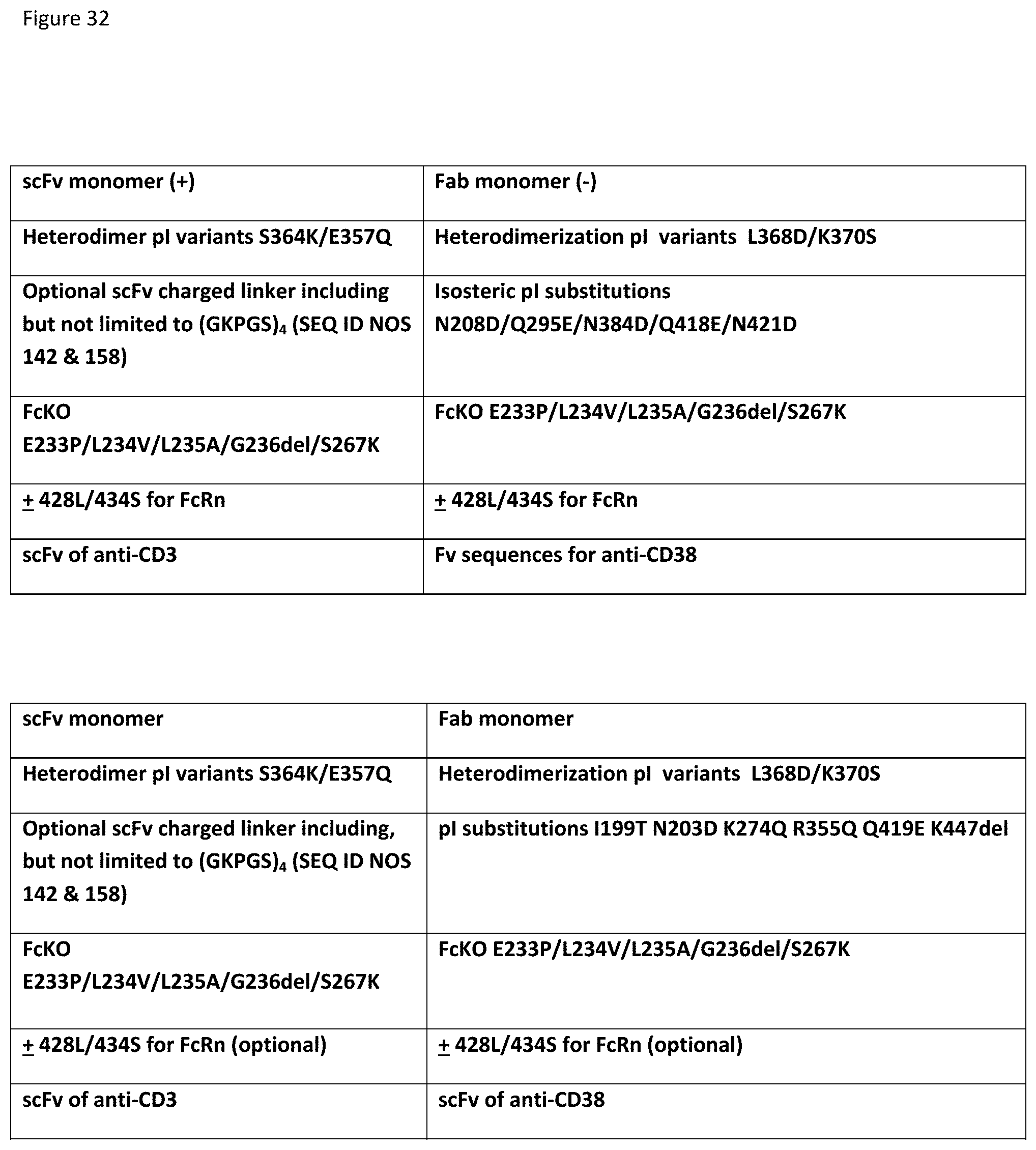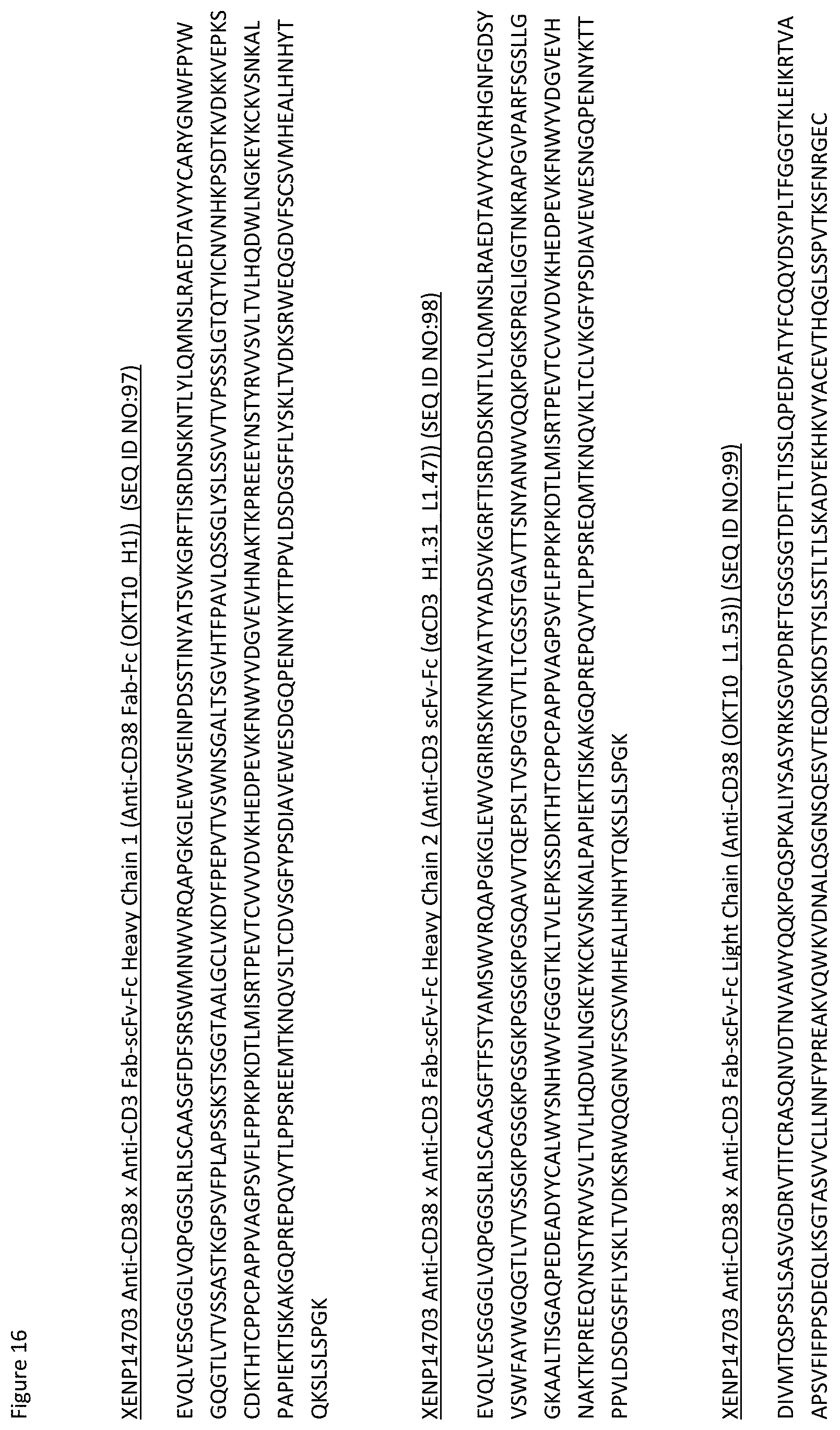 Cartoon schematics of anti-CD38×anti-CD3 bispecifics are shown in FIG. 1. Amino acid sequences for alternate format anti-CD38×anti-CD3 bispecifics are listed in FIG. 39 to FIG. 43. DNA encoding the three chains needed for bispecific expression were generated by gene synthesis (Blue Heron Biotechnology, Bothell, Wash.) and were subcloned using standard molecular biology techniques into the expression vector pTT5. Substitutions were introduced using either site-directed mutagenesis (QuikChange, Stratagene, Cedar Creek, Tex.) or additional gene synthesis and subcloning. DNA was transfected into HEK293E cells for expression and resulting proteins were purified from the supernatant using protein A affinity (GE Healthcare) and cation exchange chromatography. Yields following protein A affinity purification are shown in FIG. 35. Cation exchange chromatography purification was performed using a HiTrap SP HP column (GE Healthcare) with a wash/equilibration buffer of 50 mM MES, pH 6.0 and an elution buffer of 50 mM MES, pH 6.0+1 M NaCl linear gradient (see FIG. 36 for chromatograms).
