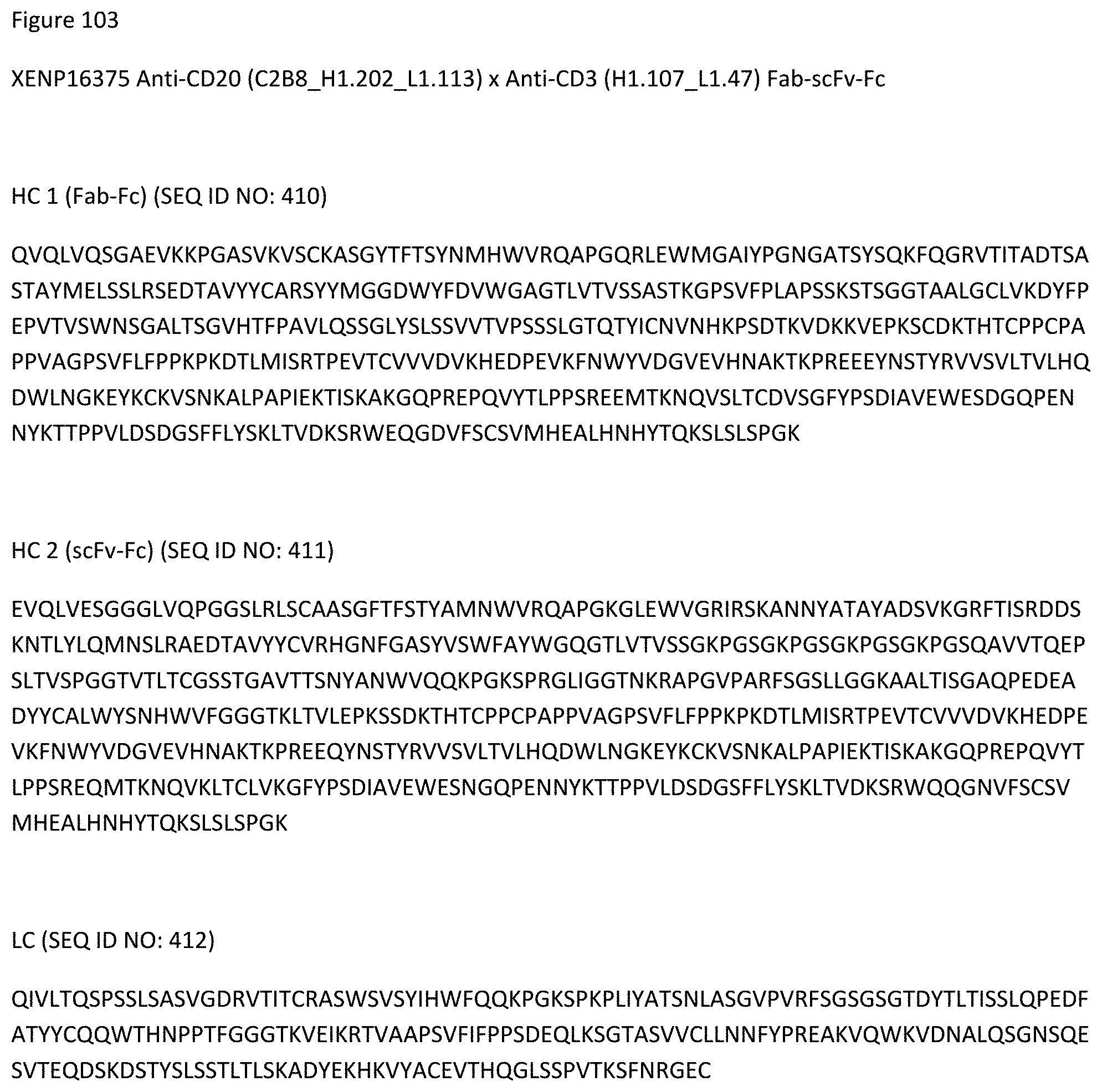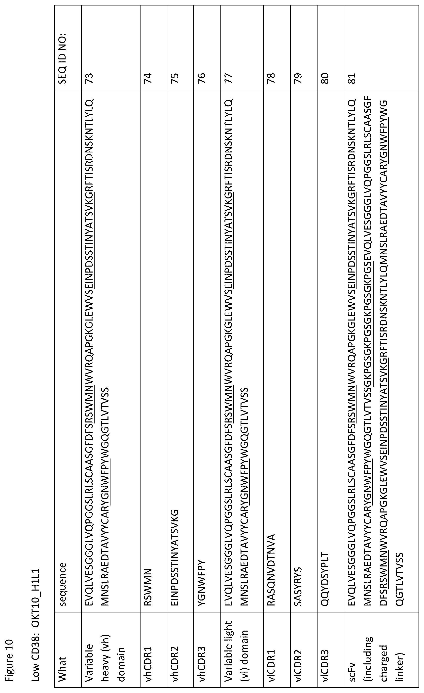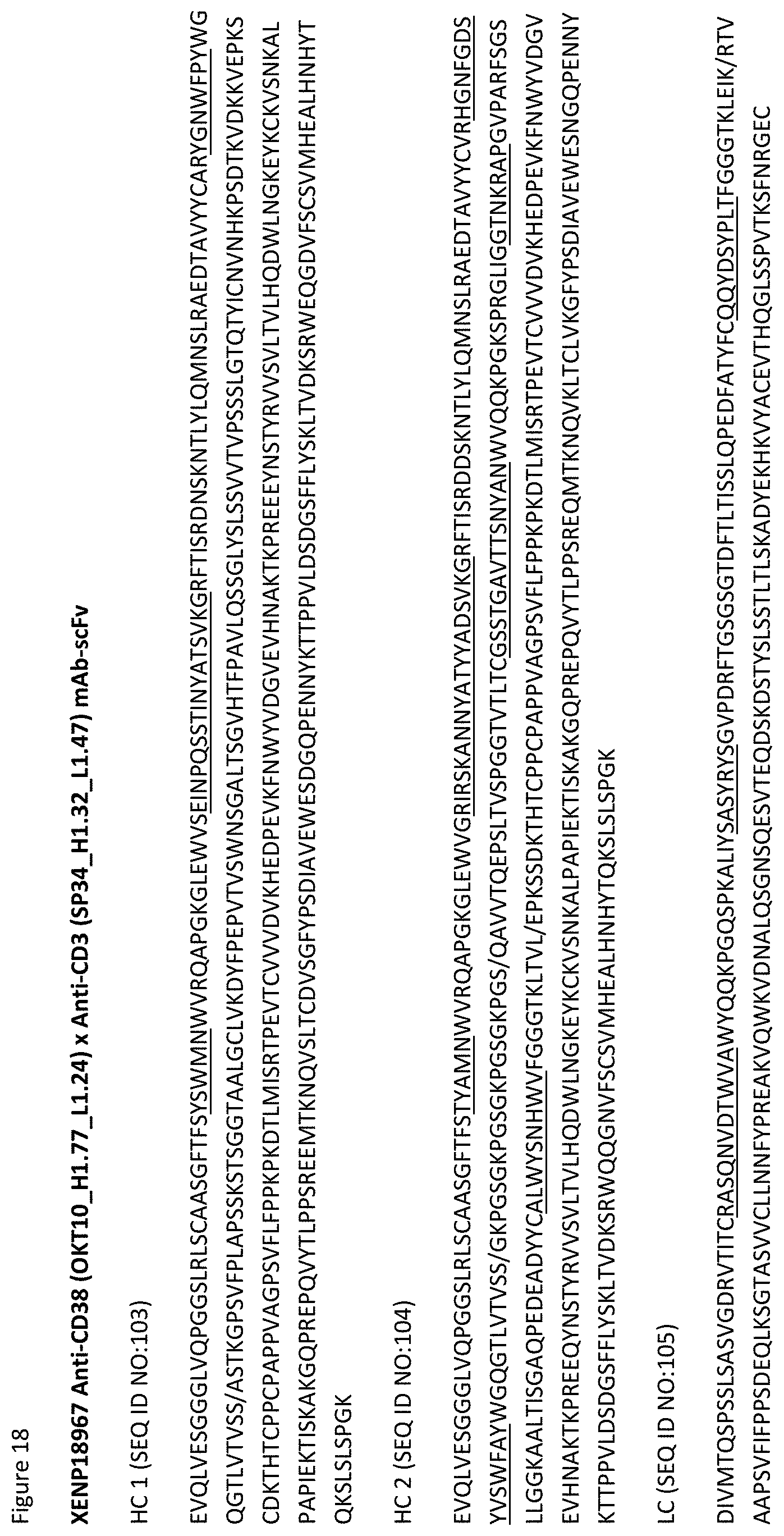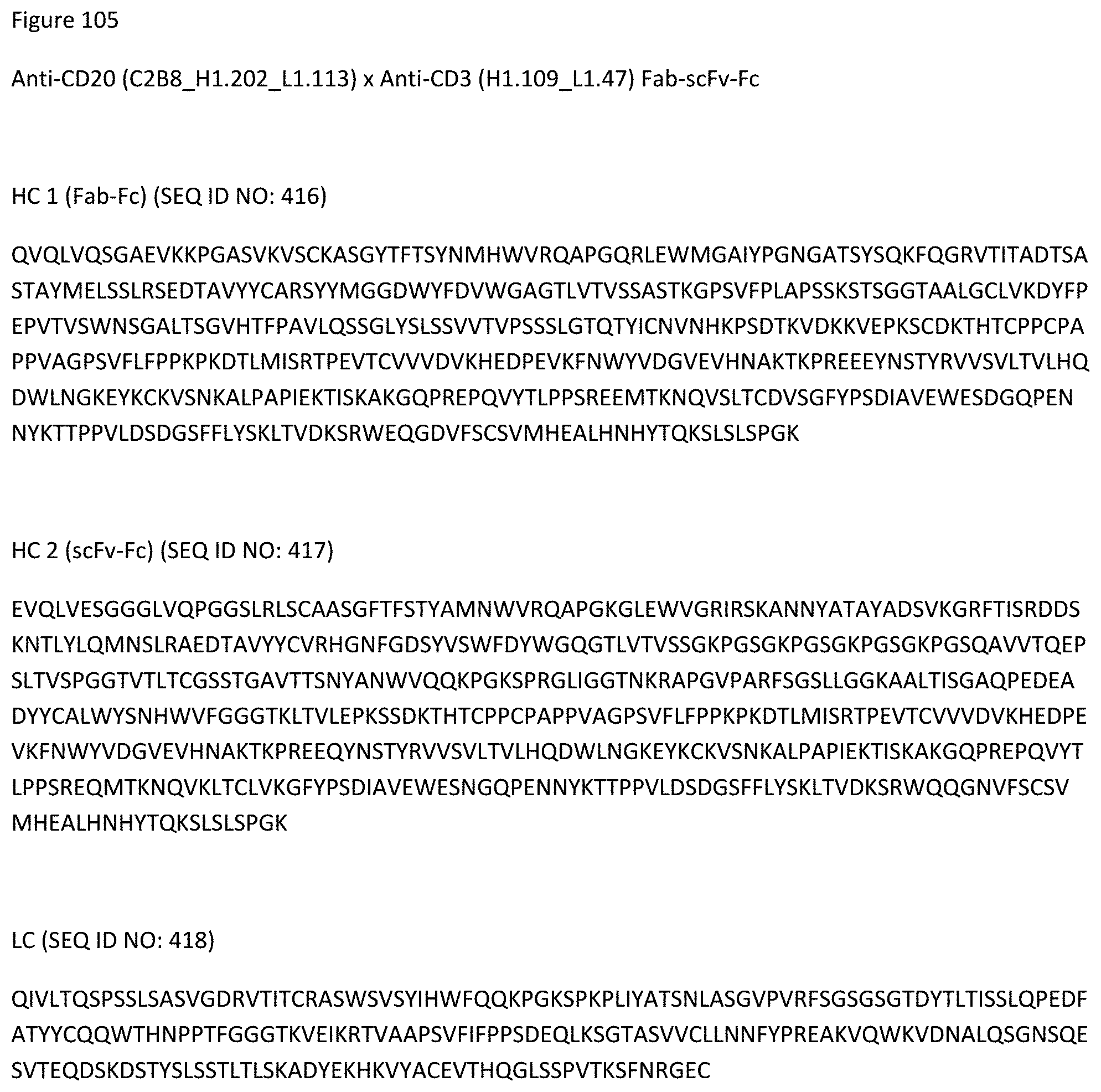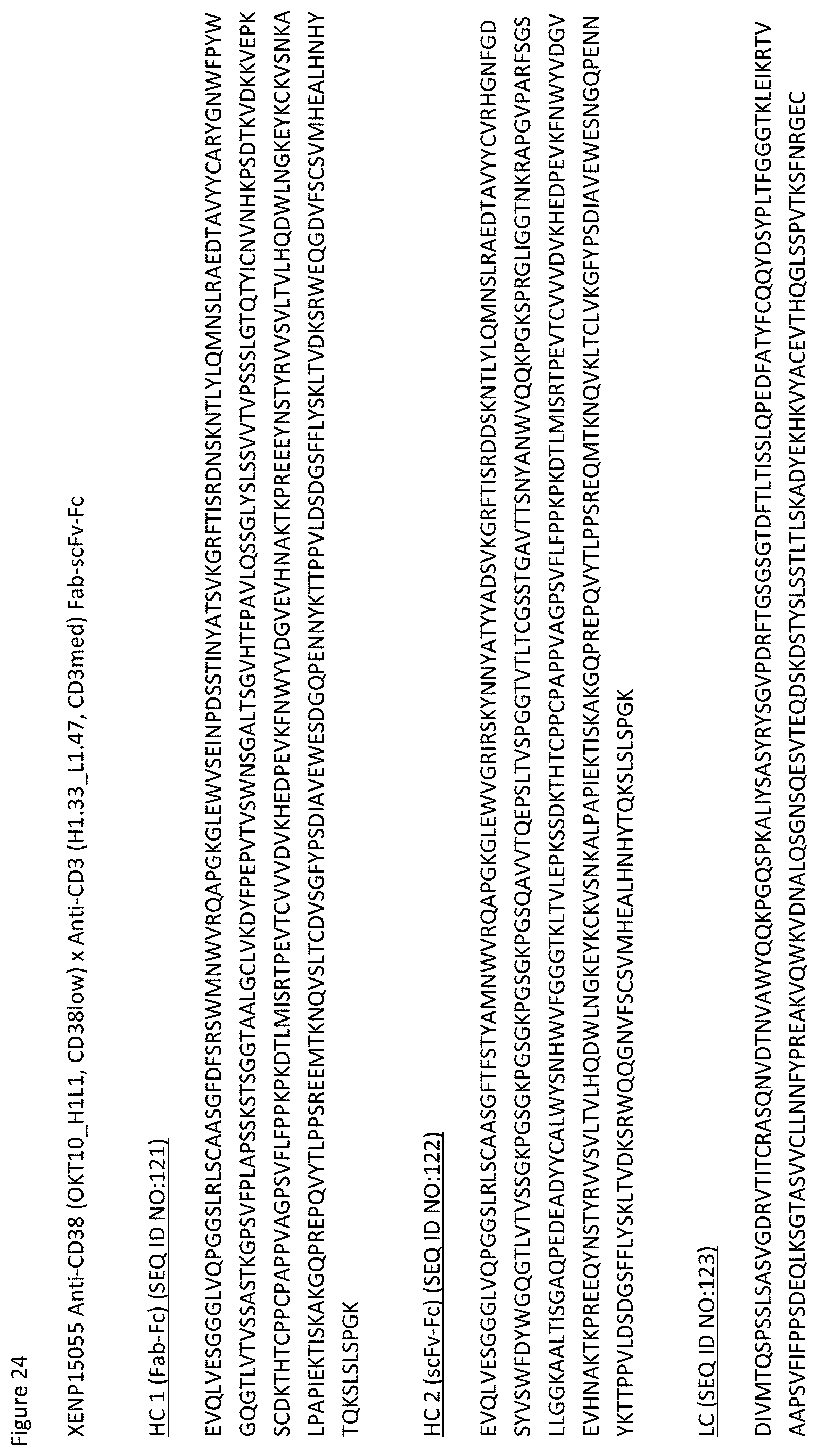 Cartoon schematics of anti-CD38×anti-CD3 bispecifics are shown in FIG. 1. Amino acid sequences for alternate format anti-CD38×anti-CD3 bispecifics are listed in FIG. 39 to FIG. 43. DNA encoding the three chains needed for bispecific expression were generated by gene synthesis (Blue Heron Biotechnology, Bothell, Wash.) and were subcloned using standard molecular biology techniques into the expression vector pTT5. Substitutions were introduced using either site-directed mutagenesis (QuikChange, Stratagene, Cedar Creek, Tex.) or additional gene synthesis and subcloning. DNA was transfected into HEK293E cells for expression and resulting proteins were purified from the supernatant using protein A affinity (GE Healthcare) and cation exchange chromatography. Yields following protein A affinity purification are shown in FIG. 35. Cation exchange chromatography purification was performed using a HiTrap SP HP column (GE Healthcare) with a wash/equilibration buffer of 50 mM MES, pH 6.0 and an elution buffer of 50 mM MES, pH 6.0+1 M NaCl linear gradient (see FIG. 36 for chromatograms).
