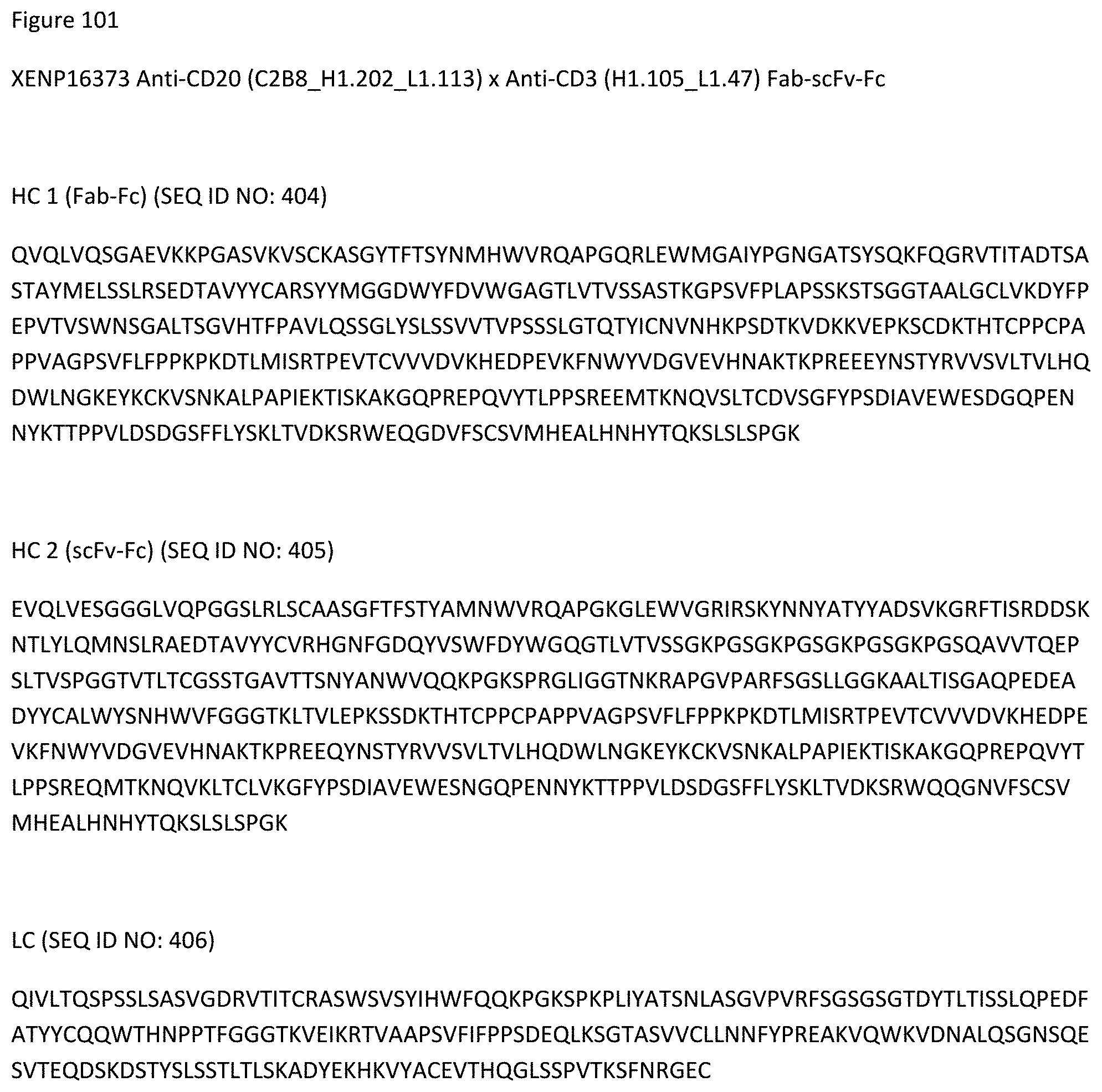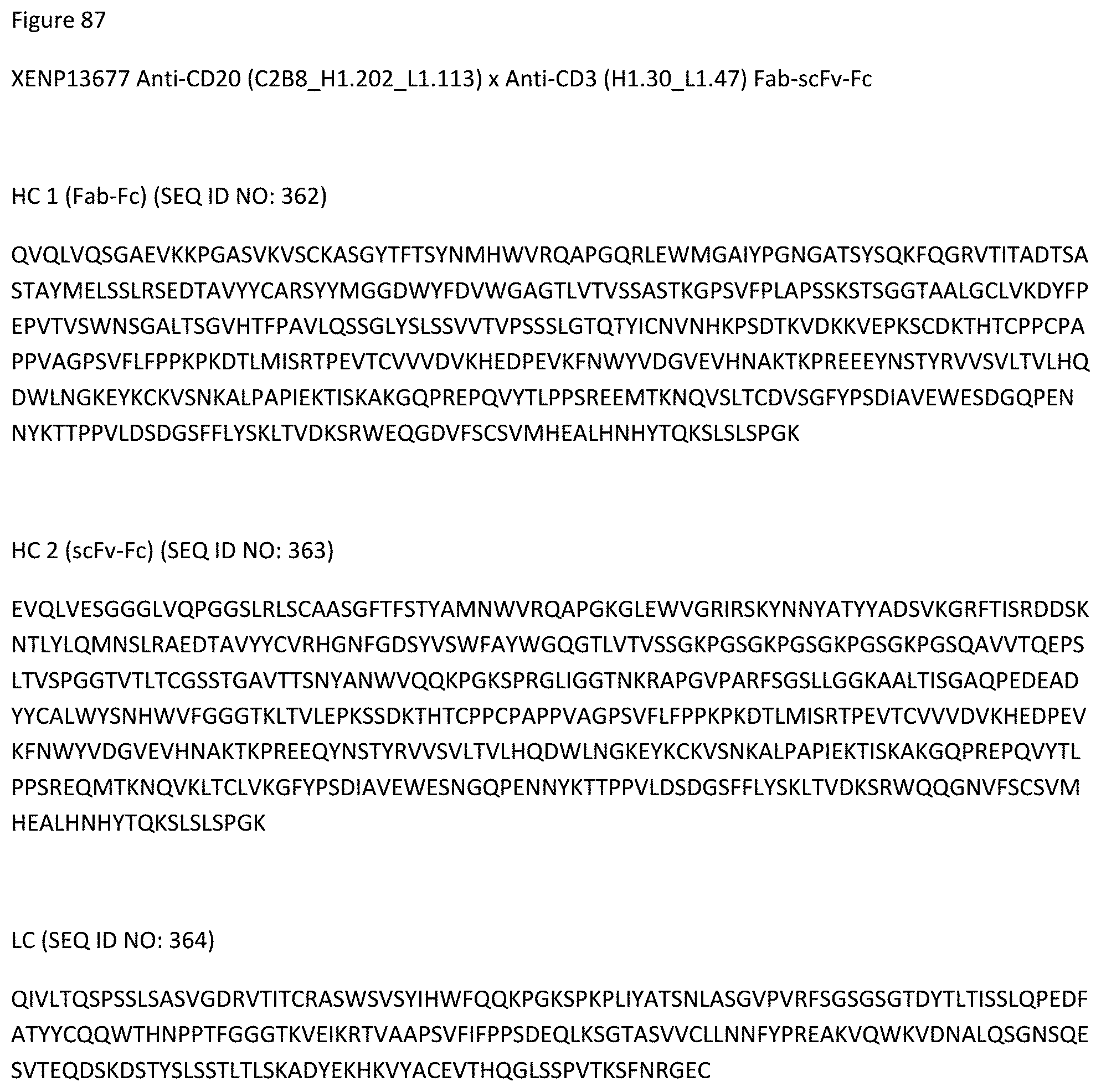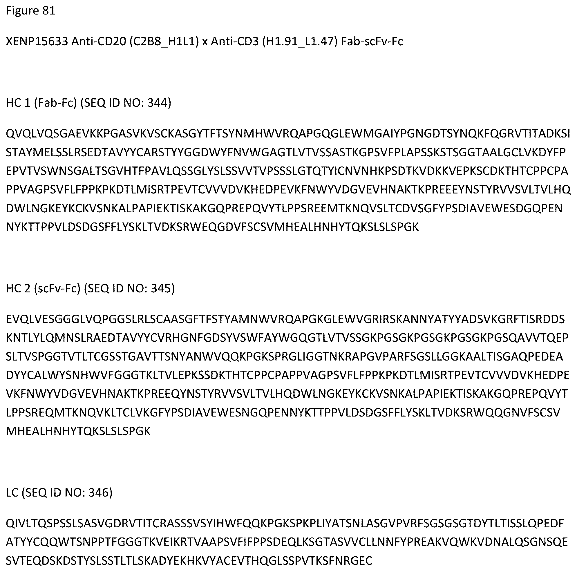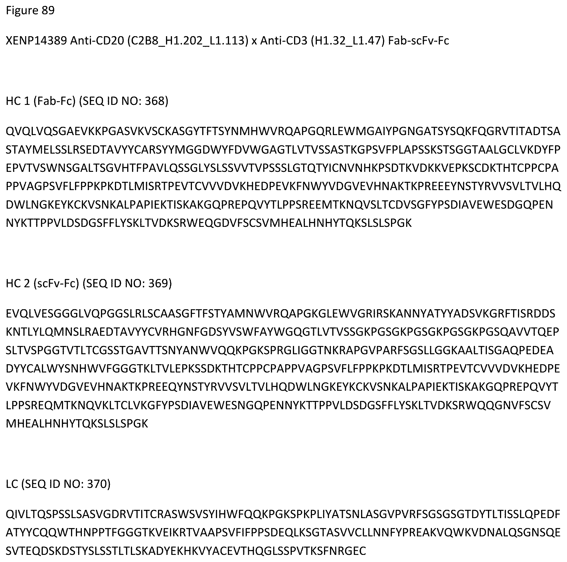 Cartoon schematics of anti-CD38×anti-CD3 bispecifics are shown in FIG. 1. Amino acid sequences for alternate format anti-CD38×anti-CD3 bispecifics are listed in FIG. 39 to FIG. 43. DNA encoding the three chains needed for bispecific expression were generated by gene synthesis (Blue Heron Biotechnology, Bothell, Wash.) and were subcloned using standard molecular biology techniques into the expression vector pTT5. Substitutions were introduced using either site-directed mutagenesis (QuikChange, Stratagene, Cedar Creek, Tex.) or additional gene synthesis and subcloning. DNA was transfected into HEK293E cells for expression and resulting proteins were purified from the supernatant using protein A affinity (GE Healthcare) and cation exchange chromatography. Yields following protein A affinity purification are shown in FIG. 35. Cation exchange chromatography purification was performed using a HiTrap SP HP column (GE Healthcare) with a wash/equilibration buffer of 50 mM MES, pH 6.0 and an elution buffer of 50 mM MES, pH 6.0+1 M NaCl linear gradient (see FIG. 36 for chromatograms).