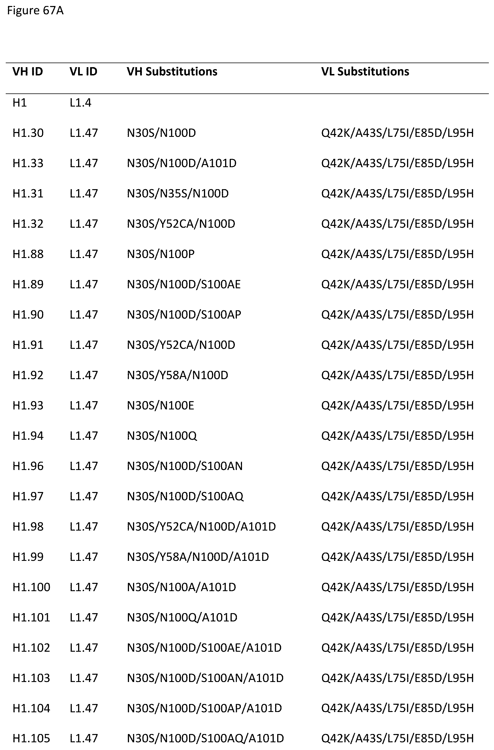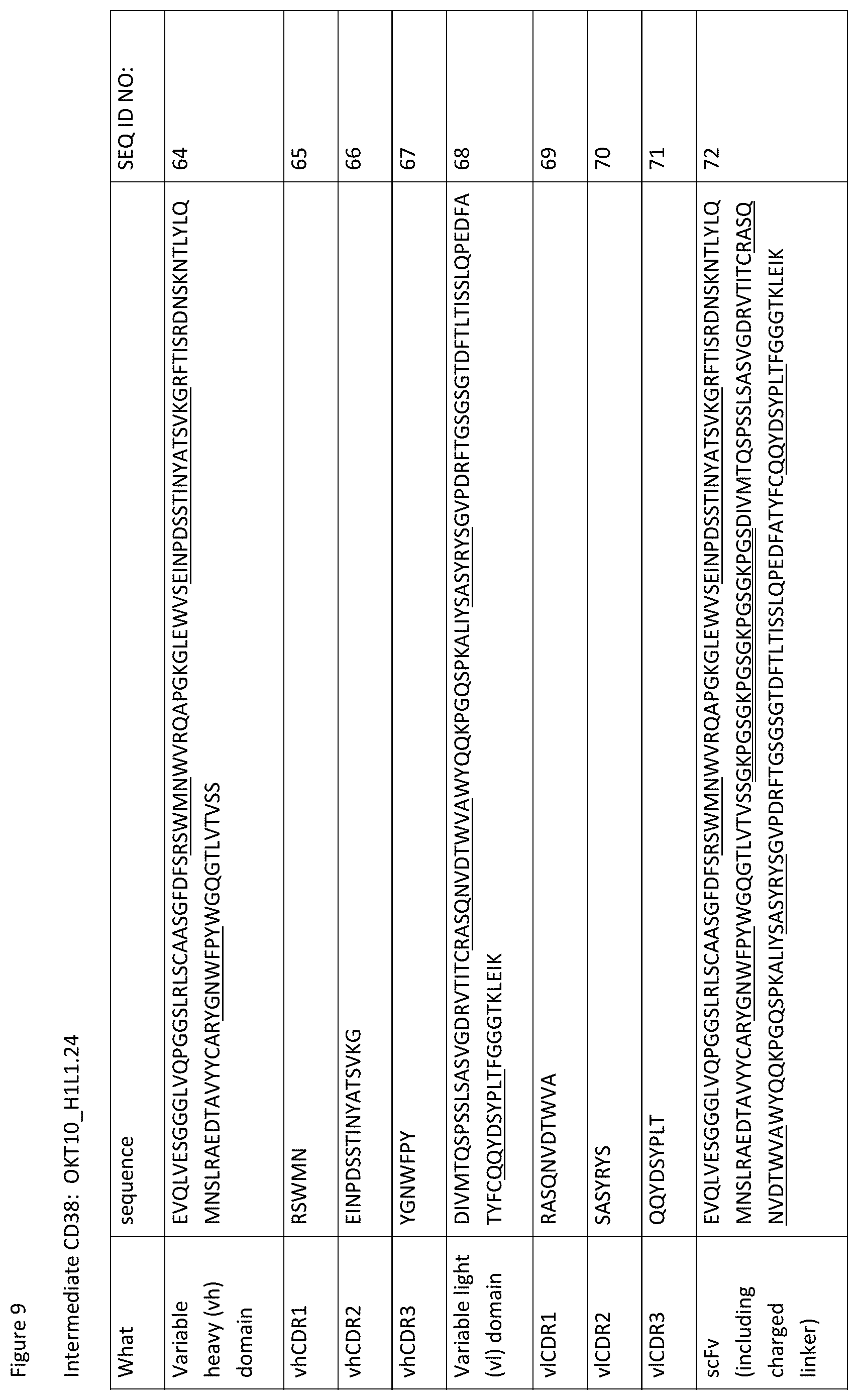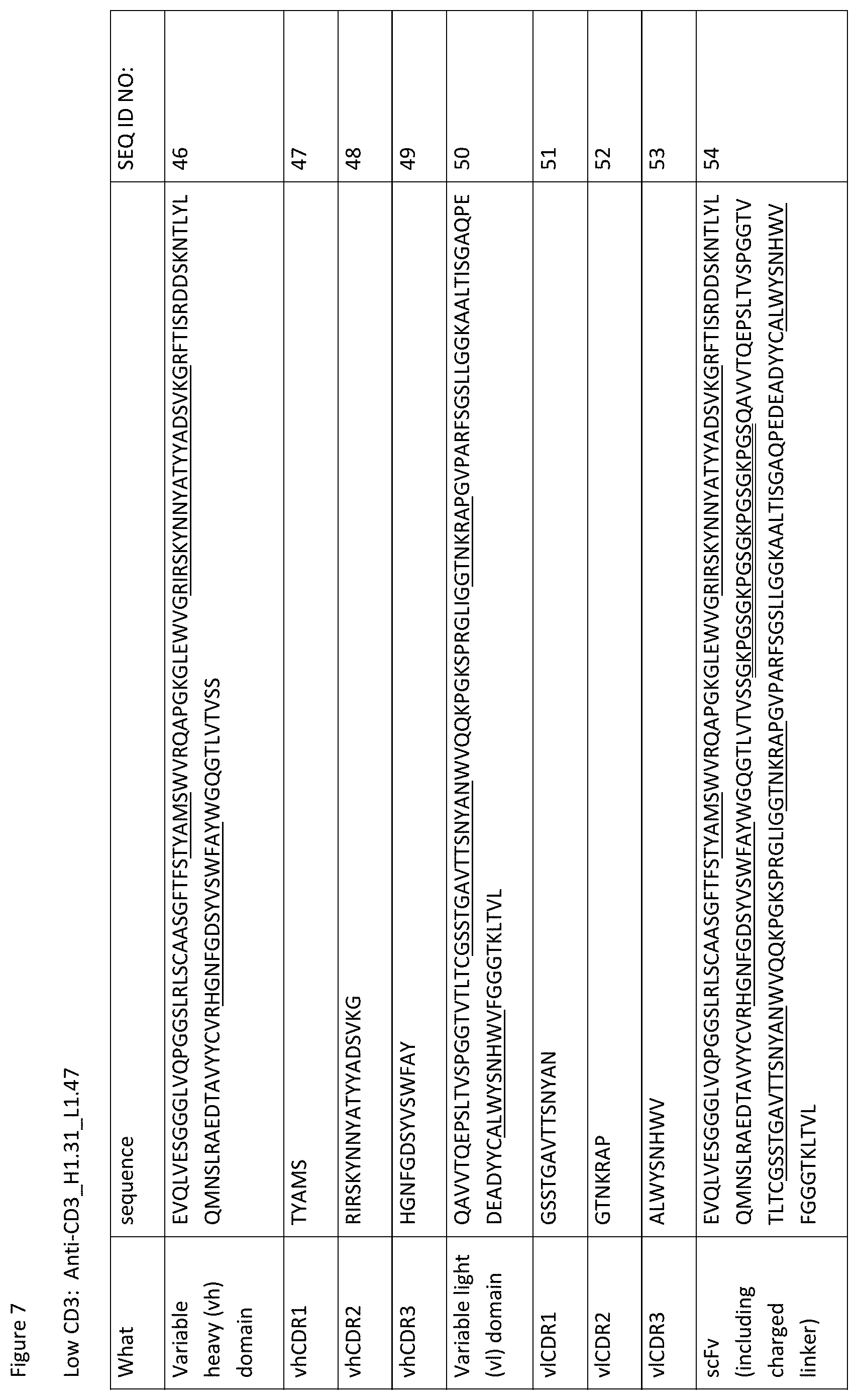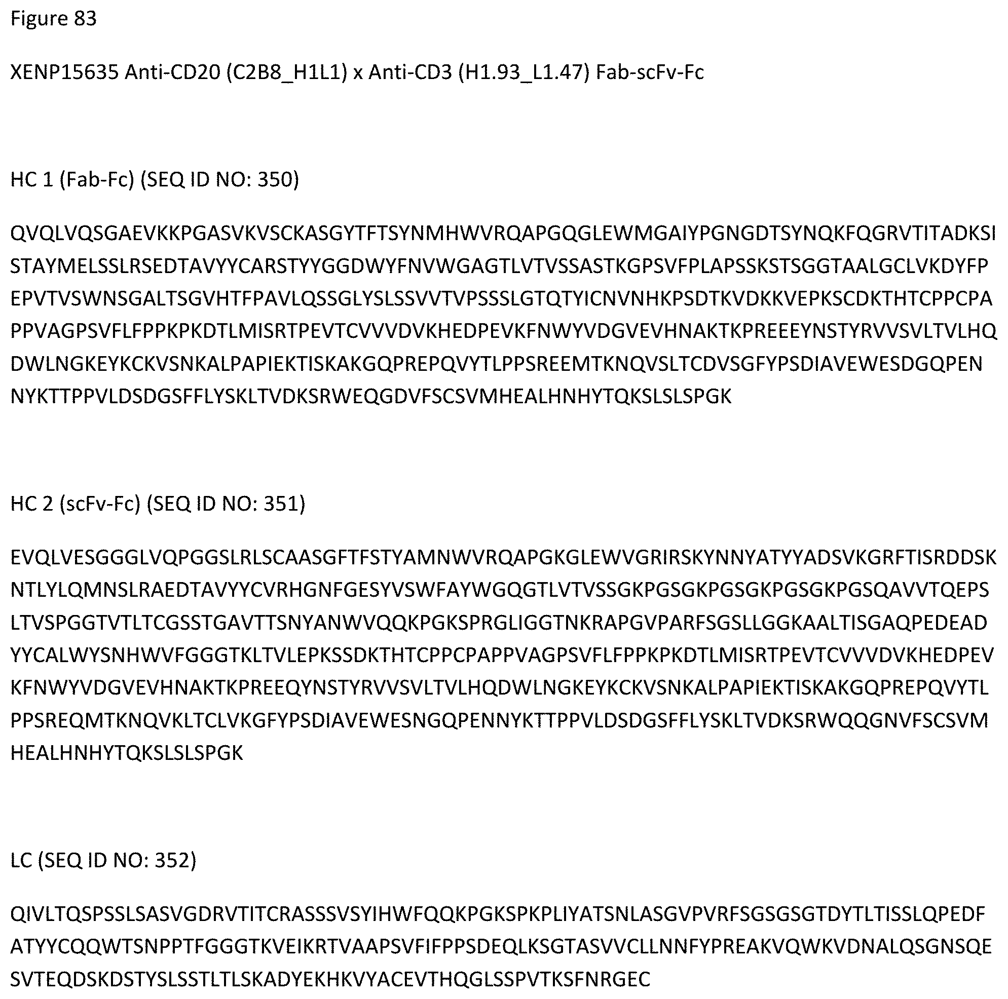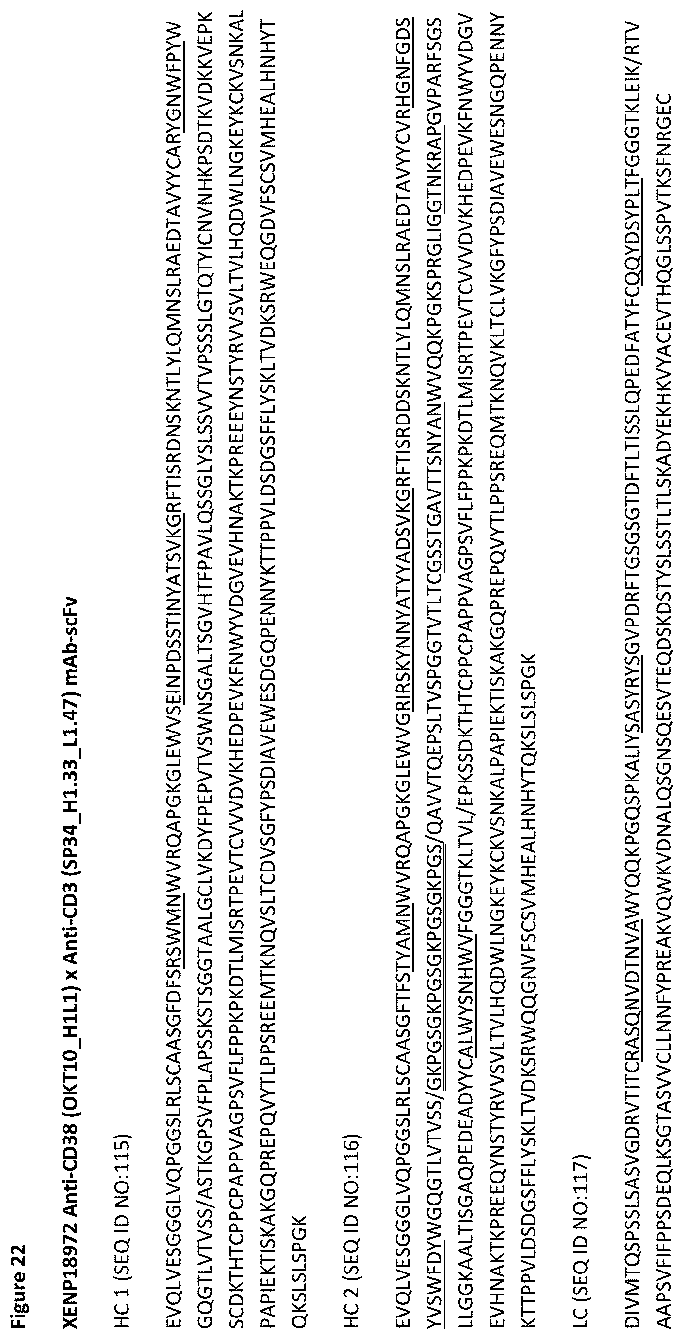 Cartoon schematics of anti-CD38×anti-CD3 bispecifics are shown in FIG. 1. Amino acid sequences for alternate format anti-CD38×anti-CD3 bispecifics are listed in FIG. 39 to FIG. 43. DNA encoding the three chains needed for bispecific expression were generated by gene synthesis (Blue Heron Biotechnology, Bothell, Wash.) and were subcloned using standard molecular biology techniques into the expression vector pTT5. Substitutions were introduced using either site-directed mutagenesis (QuikChange, Stratagene, Cedar Creek, Tex.) or additional gene synthesis and subcloning. DNA was transfected into HEK293E cells for expression and resulting proteins were purified from the supernatant using protein A affinity (GE Healthcare) and cation exchange chromatography. Yields following protein A affinity purification are shown in FIG. 35. Cation exchange chromatography purification was performed using a HiTrap SP HP column (GE Healthcare) with a wash/equilibration buffer of 50 mM MES, pH 6.0 and an elution buffer of 50 mM MES, pH 6.0+1 M NaCl linear gradient (see FIG. 36 for chromatograms).