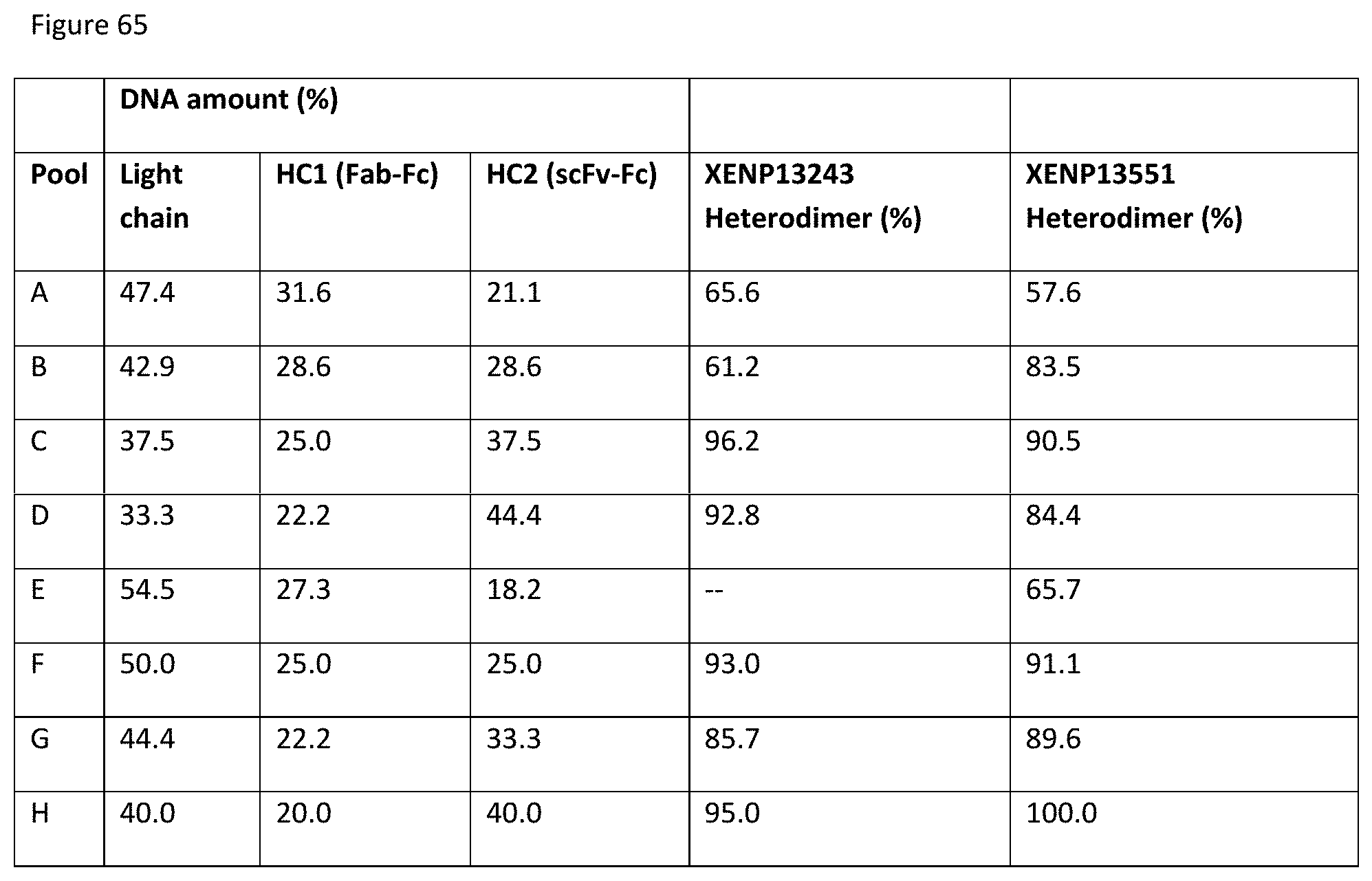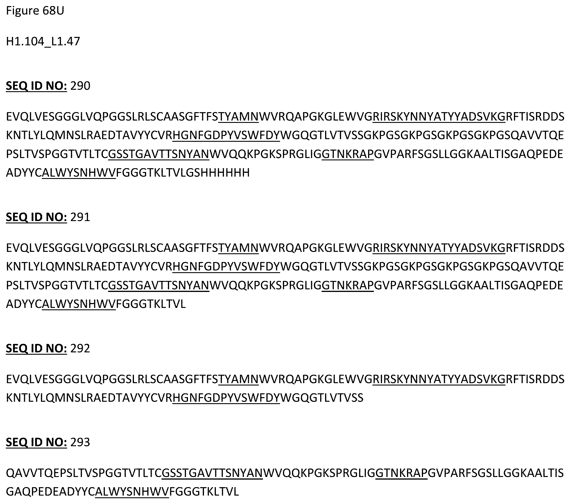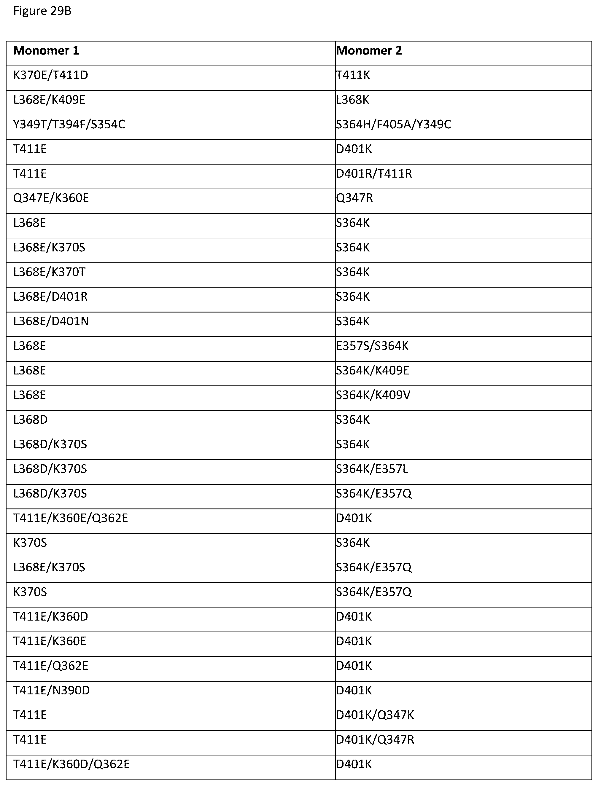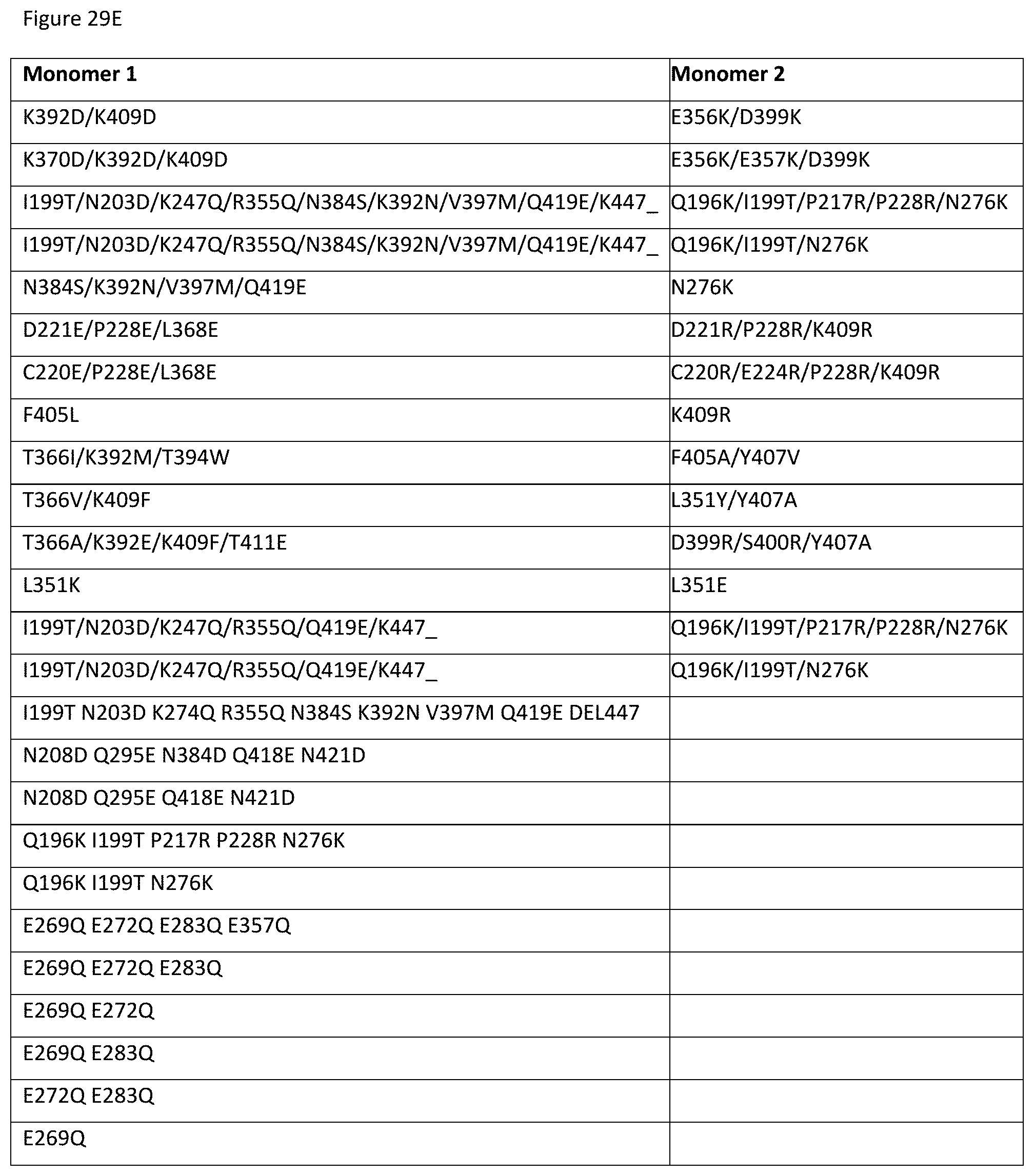 Cartoon schematics of anti-CD38×anti-CD3 bispecifics are shown in FIG. 1. Amino acid sequences for alternate format anti-CD38×anti-CD3 bispecifics are listed in FIG. 39 to FIG. 43. DNA encoding the three chains needed for bispecific expression were generated by gene synthesis (Blue Heron Biotechnology, Bothell, Wash.) and were subcloned using standard molecular biology techniques into the expression vector pTT5. Substitutions were introduced using either site-directed mutagenesis (QuikChange, Stratagene, Cedar Creek, Tex.) or additional gene synthesis and subcloning. DNA was transfected into HEK293E cells for expression and resulting proteins were purified from the supernatant using protein A affinity (GE Healthcare) and cation exchange chromatography. Yields following protein A affinity purification are shown in FIG. 35. Cation exchange chromatography purification was performed using a HiTrap SP HP column (GE Healthcare) with a wash/equilibration buffer of 50 mM MES, pH 6.0 and an elution buffer of 50 mM MES, pH 6.0+1 M NaCl linear gradient (see FIG. 36 for chromatograms).