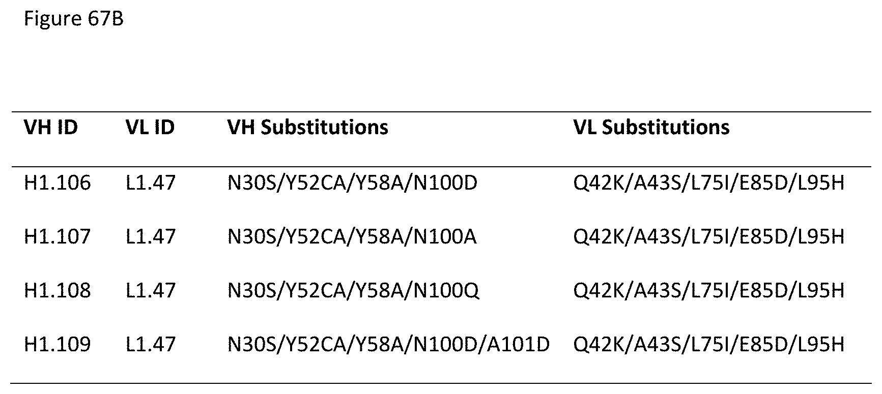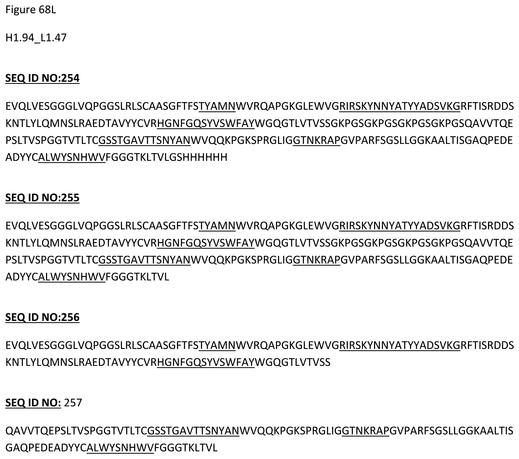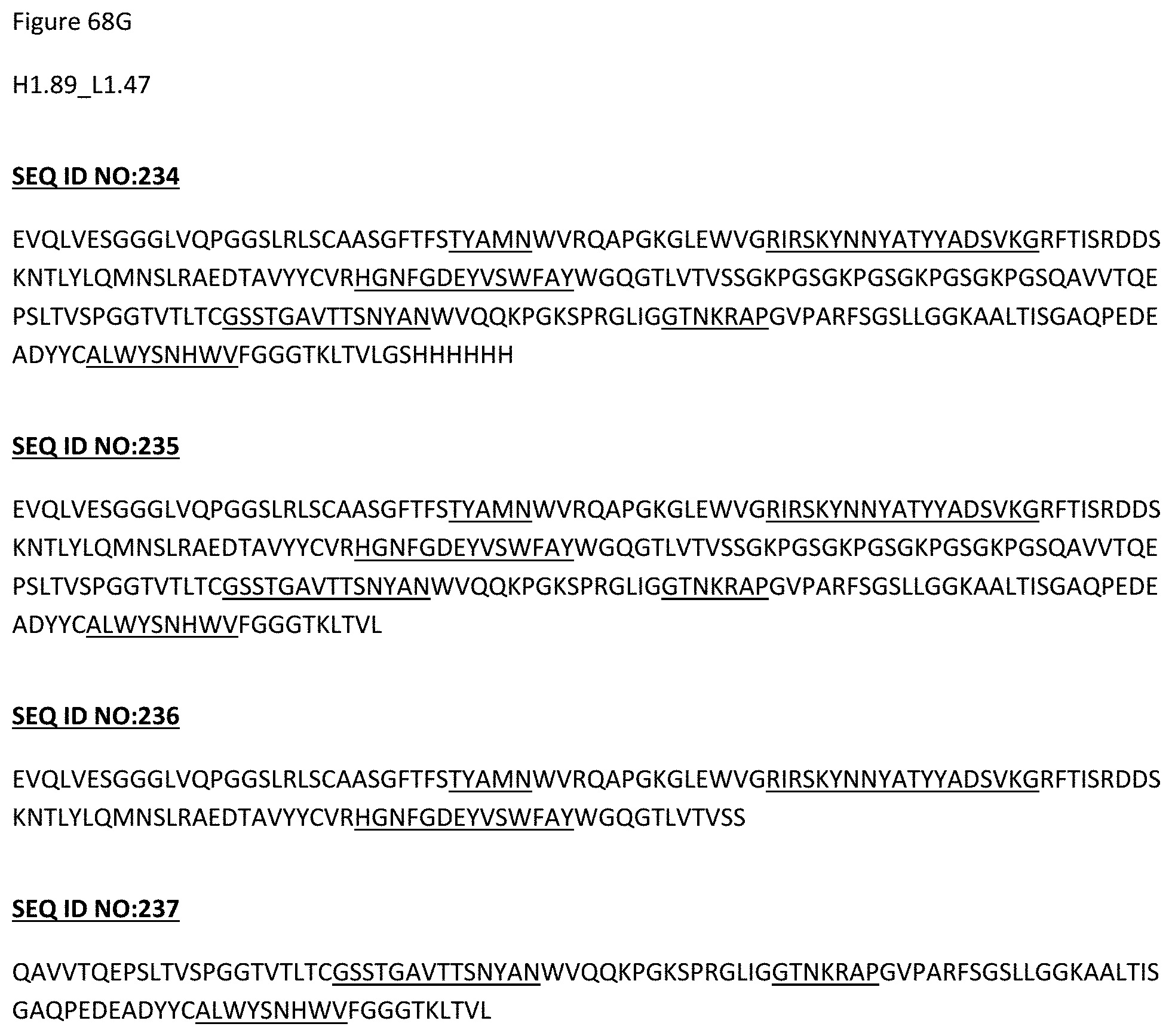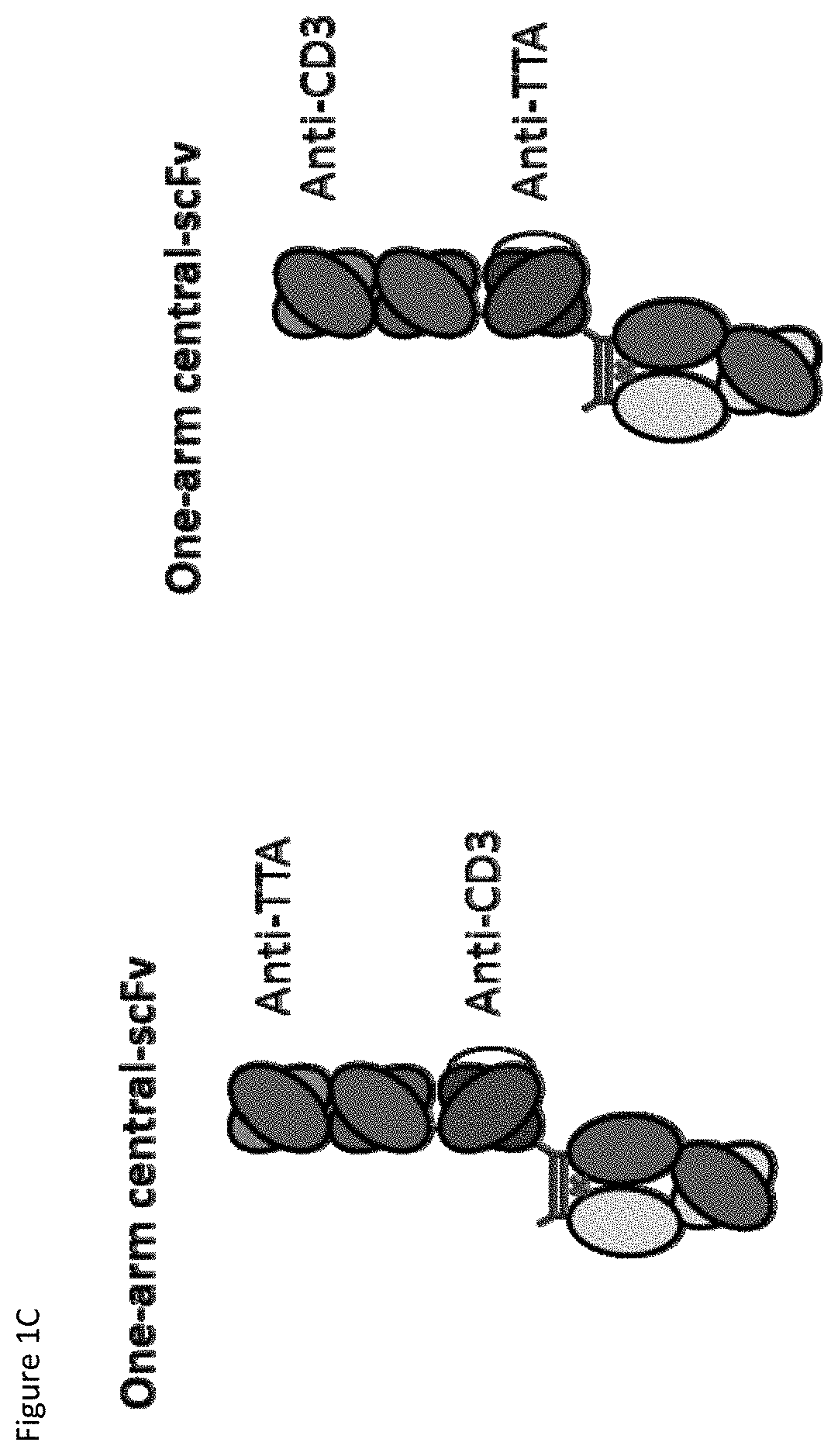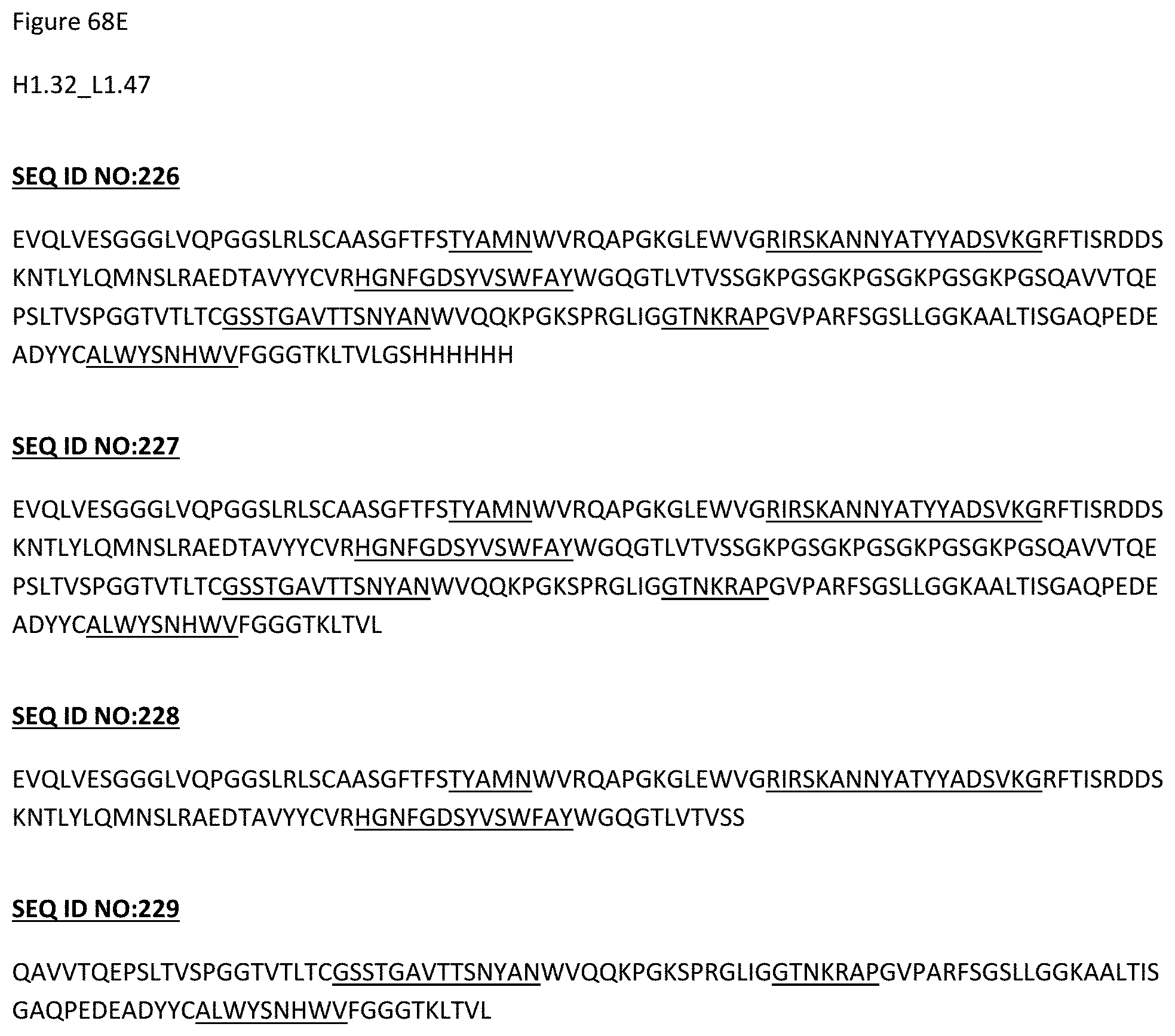 Cartoon schematics of anti-CD38×anti-CD3 bispecifics are shown in FIG. 1. Amino acid sequences for alternate format anti-CD38×anti-CD3 bispecifics are listed in FIG. 39 to FIG. 43. DNA encoding the three chains needed for bispecific expression were generated by gene synthesis (Blue Heron Biotechnology, Bothell, Wash.) and were subcloned using standard molecular biology techniques into the expression vector pTT5. Substitutions were introduced using either site-directed mutagenesis (QuikChange, Stratagene, Cedar Creek, Tex.) or additional gene synthesis and subcloning. DNA was transfected into HEK293E cells for expression and resulting proteins were purified from the supernatant using protein A affinity (GE Healthcare) and cation exchange chromatography. Yields following protein A affinity purification are shown in FIG. 35. Cation exchange chromatography purification was performed using a HiTrap SP HP column (GE Healthcare) with a wash/equilibration buffer of 50 mM MES, pH 6.0 and an elution buffer of 50 mM MES, pH 6.0+1 M NaCl linear gradient (see FIG. 36 for chromatograms).
