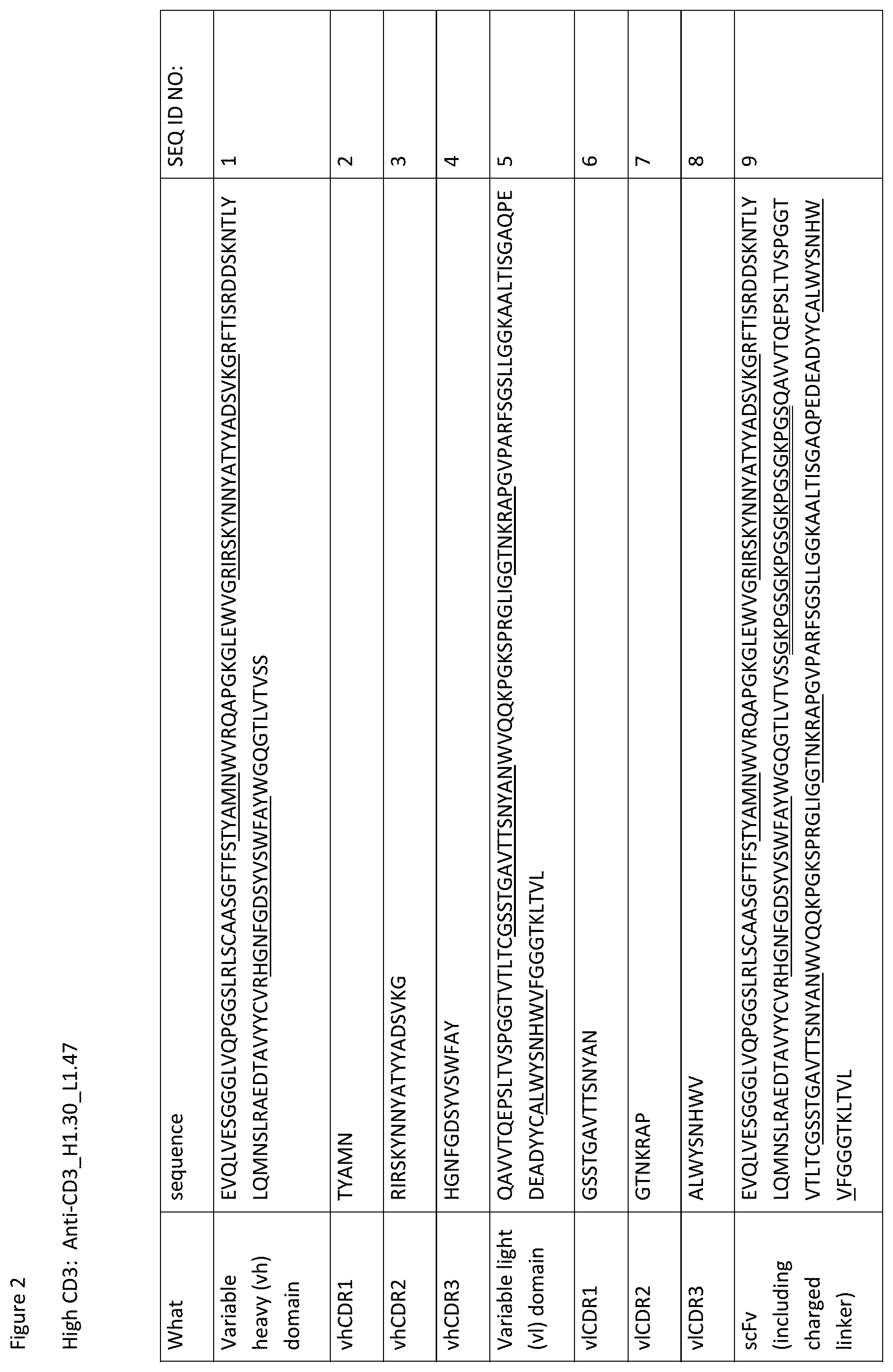 39. An anti-CD3 antibody binding domain according to claim 37 or 38 wherein said variable light domain has the sequence L1.47 (SEQ ID NO:XX) and said variable heavy domain has the sequence H1.33 (SEQ ID NO:XX).