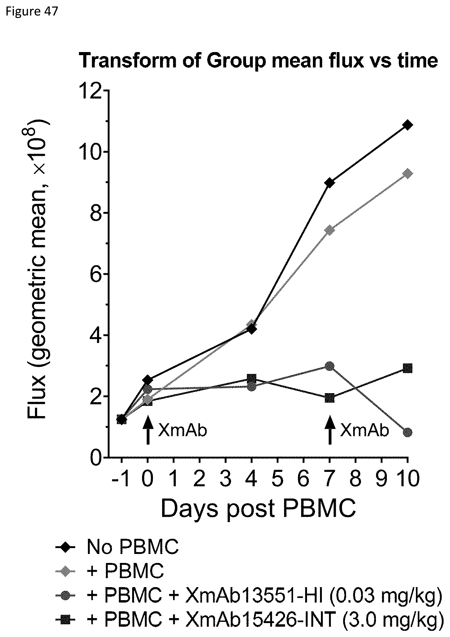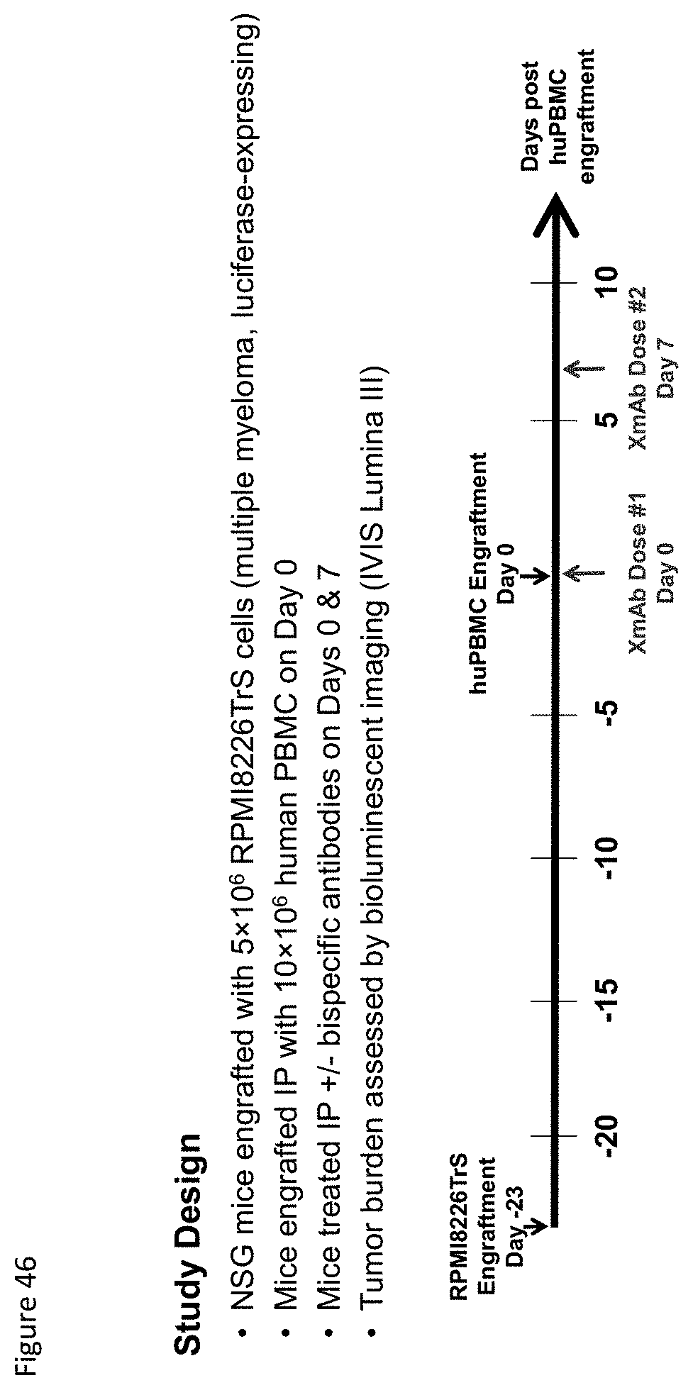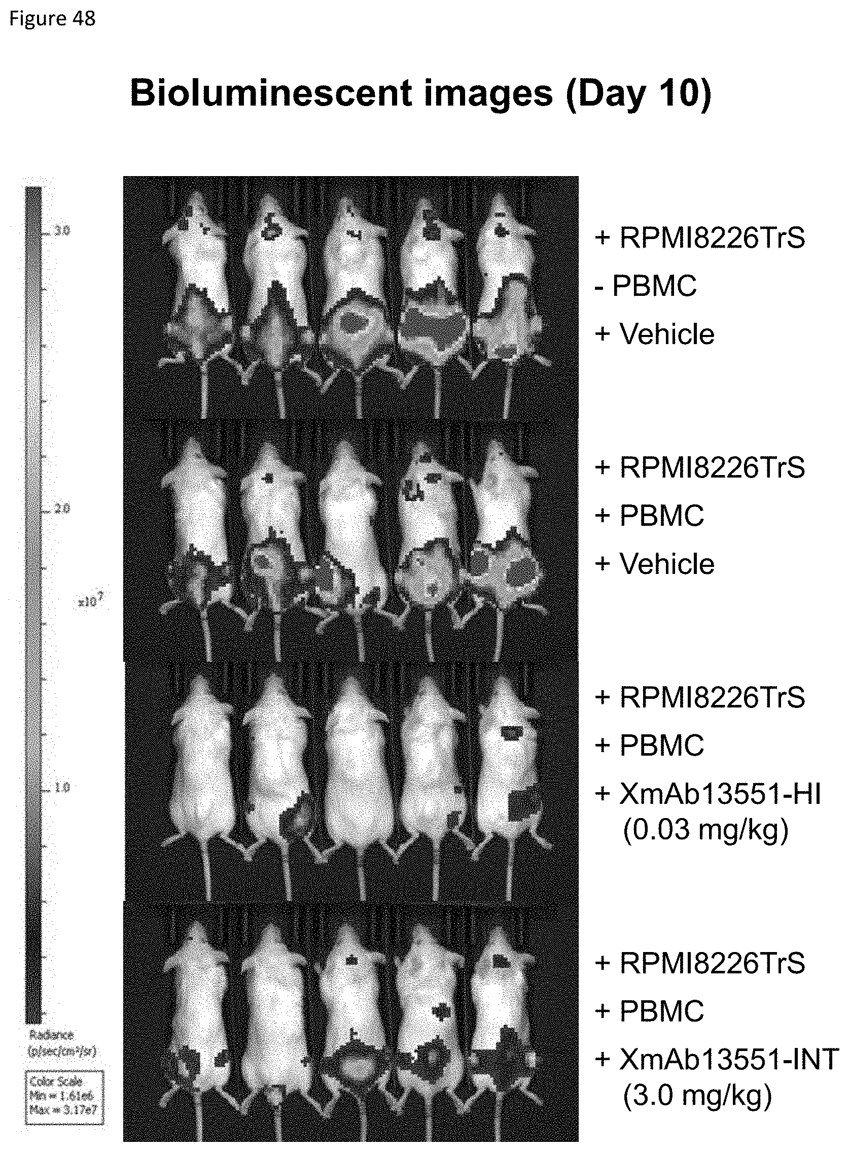Four groups of five NOD scid gamma (NSG) mice each were engrafted with 5×106 RPMI8226TrS tumor cells (multiple myeloma, luciferase-expressing) by intravenous tail vein injection on Day −23. On Day 0, mice were engrafted intraperitoneally with 10×106 human PBMCs. After PBMC engraftment on Day 0, test articles are dosed weekly (Days 0, 7) by intraperitoneal injection at dose levels indicated in FIG. 4. Study design is further summarized in FIG. 46. Tumor growth was monitored by measuring total flux per mouse using an in vivo imaging system (IVIS®). Both XmAb13551 and XmAb15426 showed substantial anti-tumor effects (see FIG. 47 and FIG. 48).