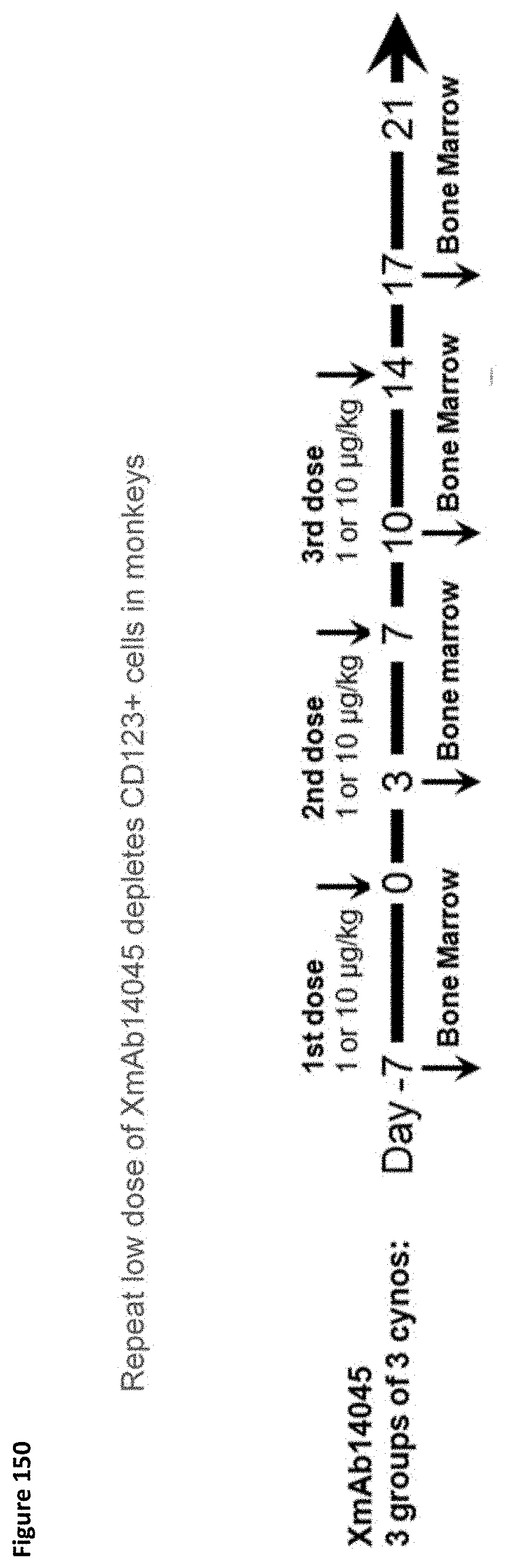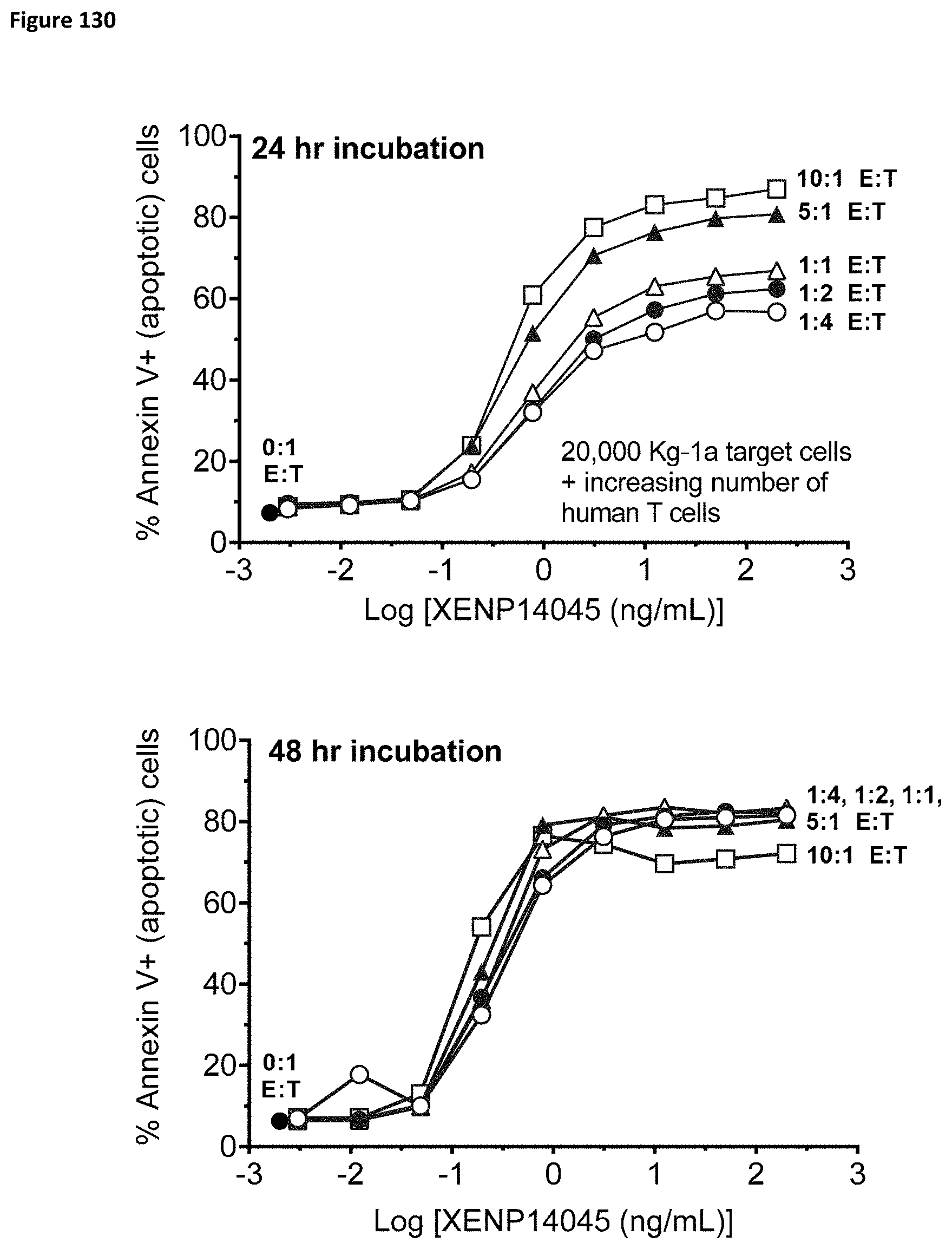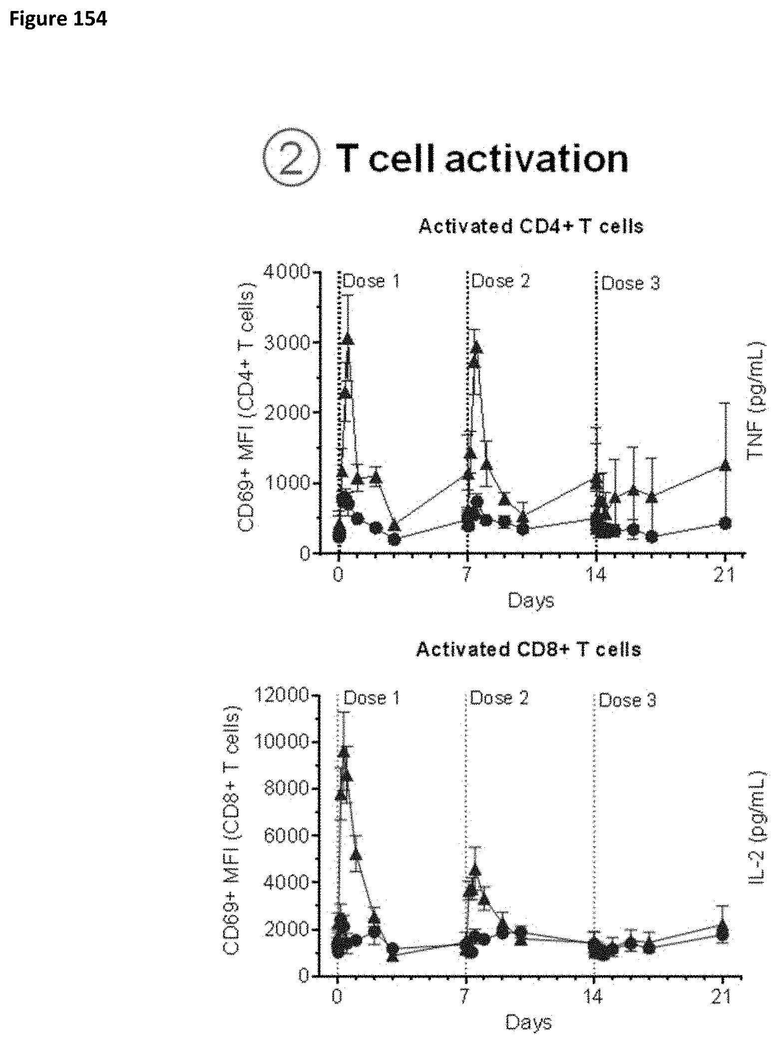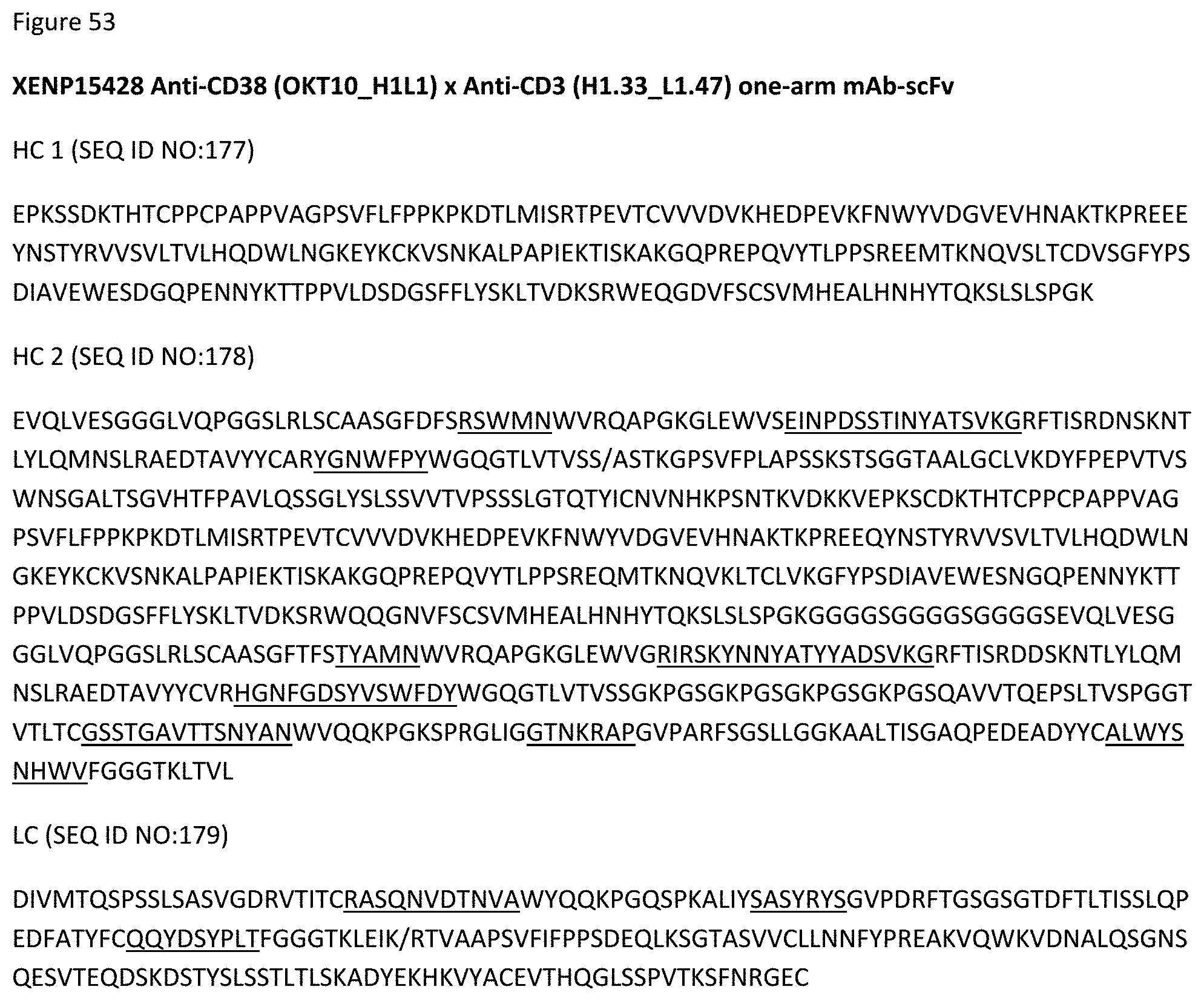 Cynomolgus monkeys were given a single dose of anti-CD38×anti-CD3 bispecifics. An anti-RSV×anti-CD3 bispecific control was also included. Dose levels were: 20 μg/kg XmAb13551 (n=2), 0.5 mg/kg XmAb15426 (n=3), 3 mg/kg XmAb14702 (n=3), or 3 mg/kg XmAb13245 (anti-RSV×anti-CD3 control, n=3) (in 3 independent studies). Anti-CD38×anti-CD3 bispecifics rapidly depleted CD38+ cells in peripheral blood (see FIG. 49). Anti-CD38×anti-CD3 bispecifics resulted in T cell activation as measured by CD69 expression (see FIG. 50). Serum levels of IL-6 were also measured (see FIG. 51). Note that, compared to XmAb13551, XmAb15426 had an increased duration of CD38+ cell depletion and lower levels of T cell activation and IL-6 production.