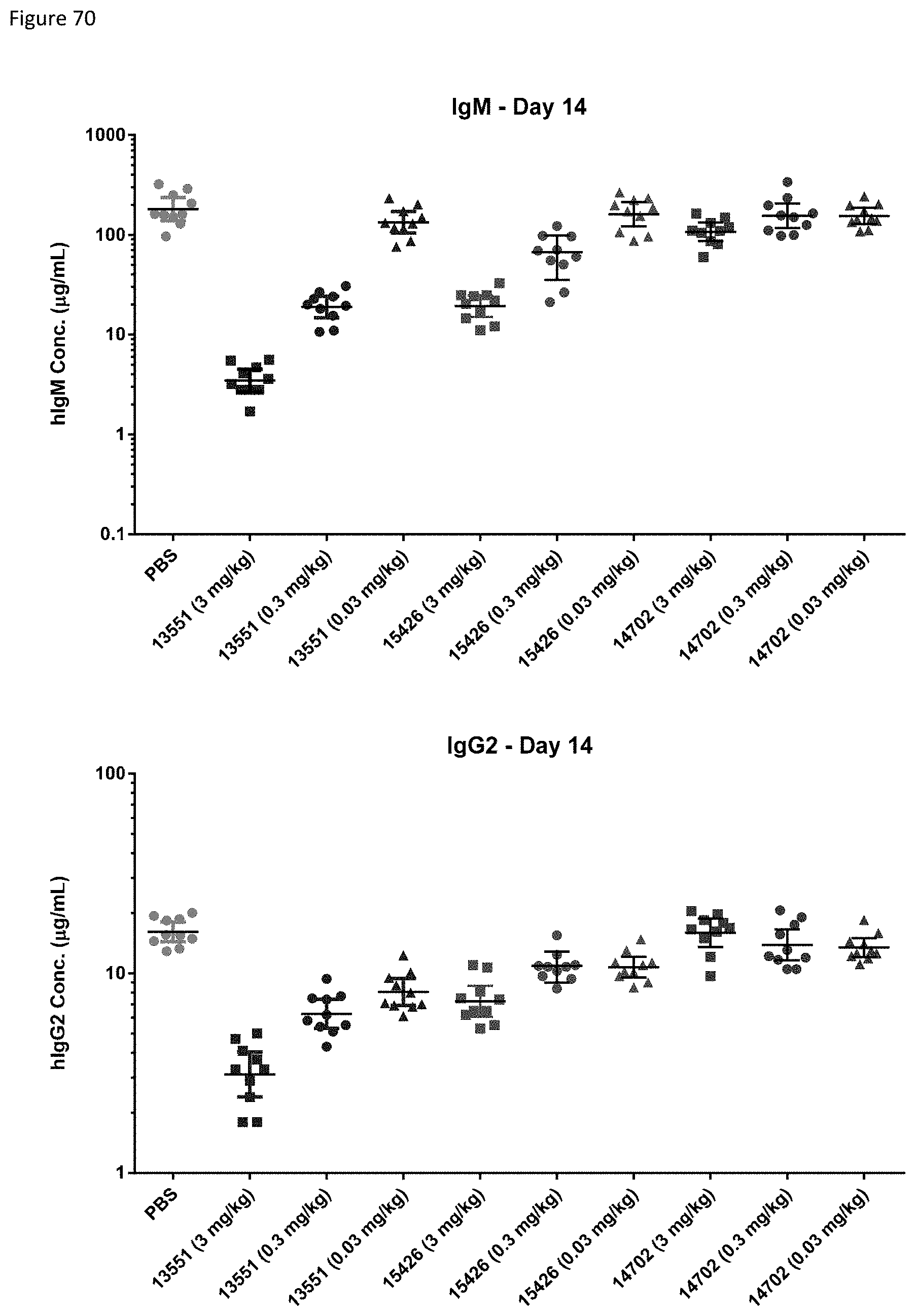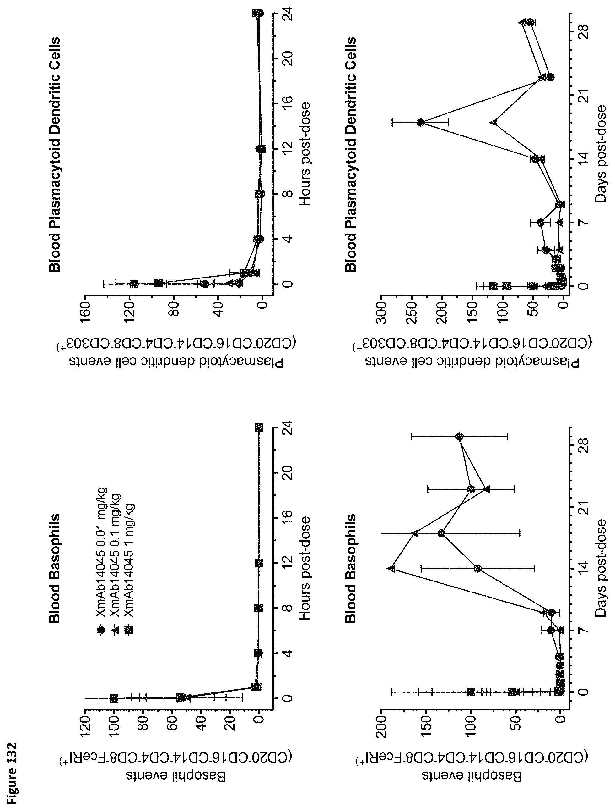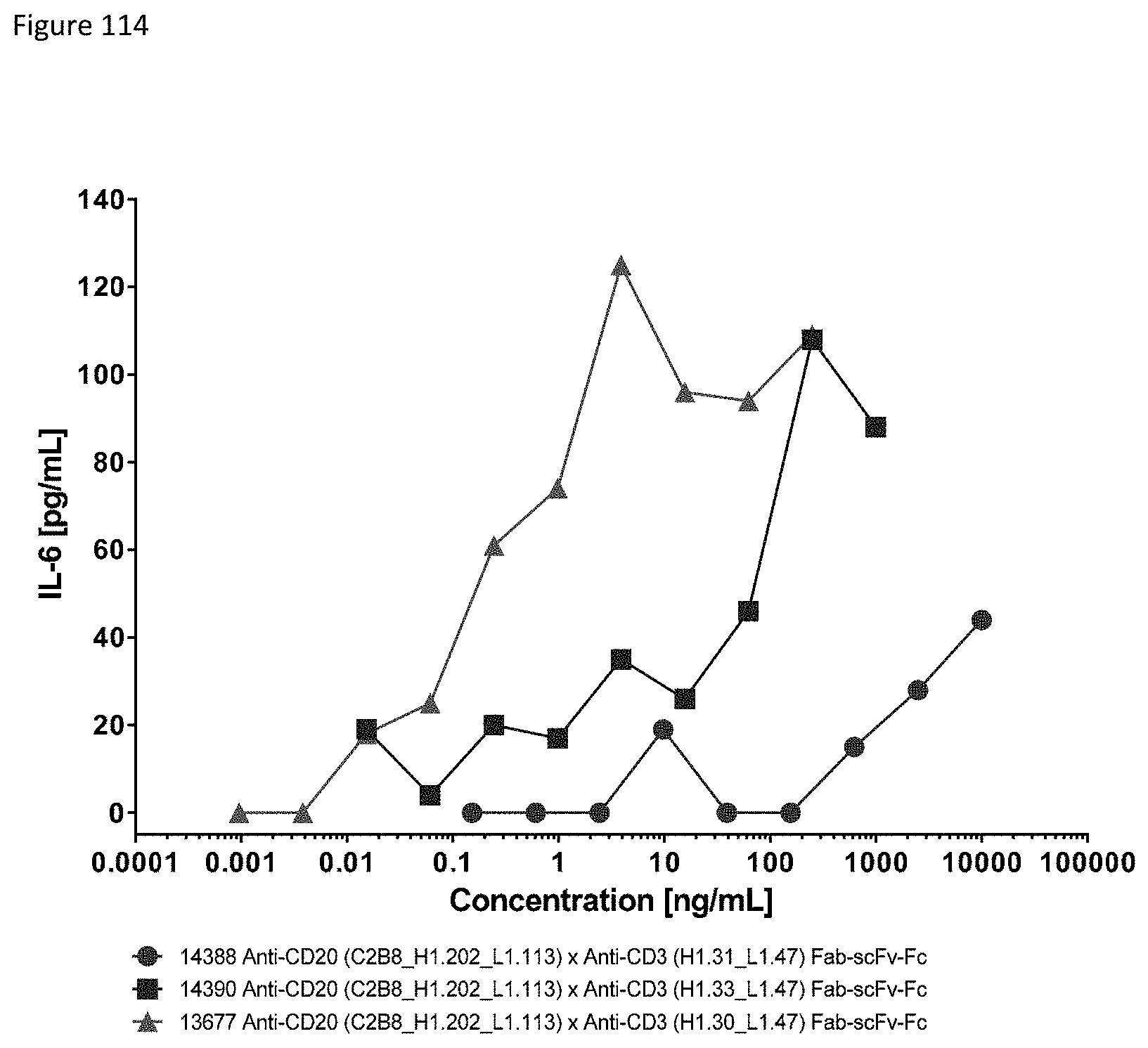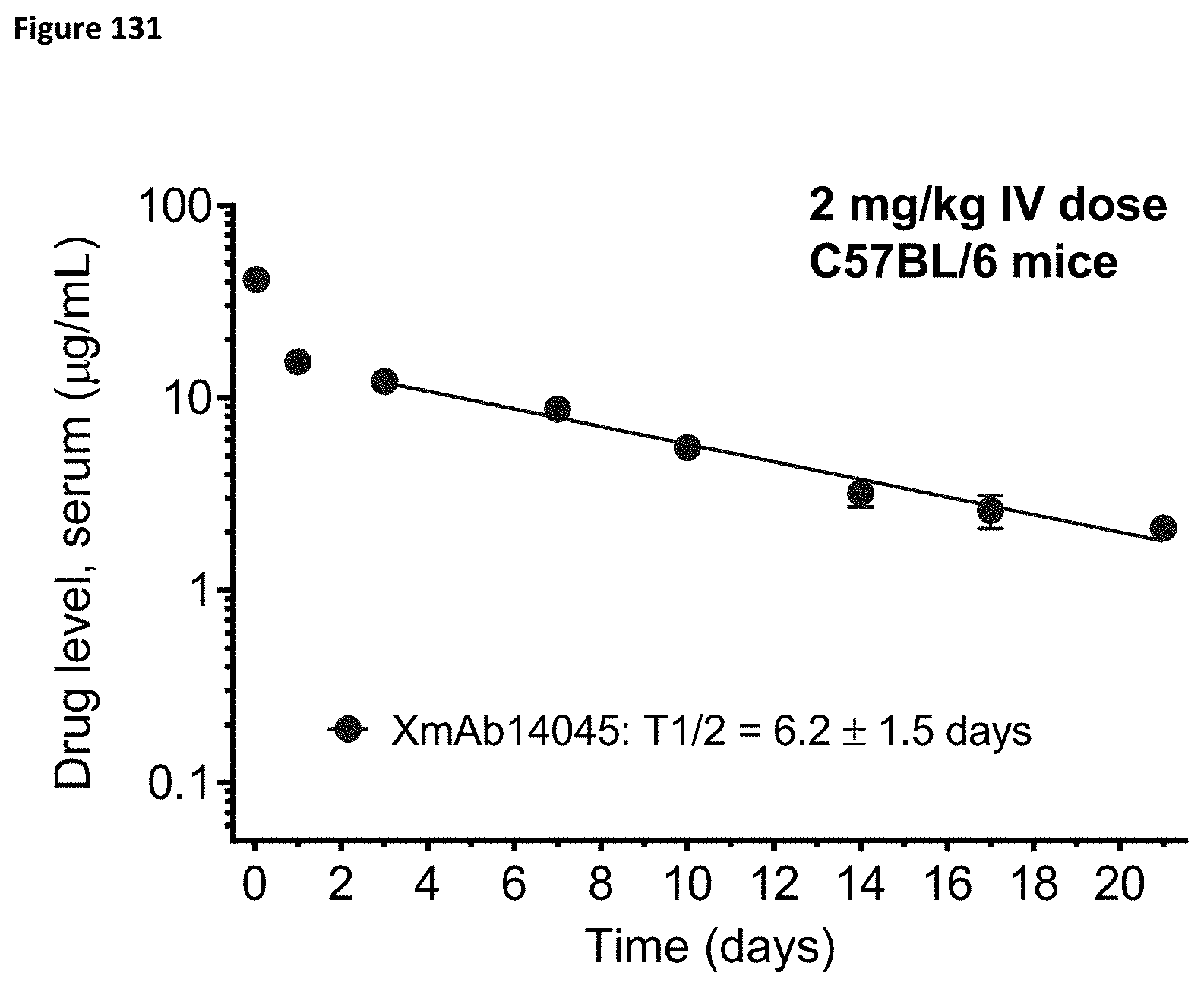 Cynomolgus monkeys were given a single dose of anti-CD38×anti-CD3 bispecifics. An anti-RSV×anti-CD3 bispecific control was also included. Dose levels were: 20 μg/kg XmAb13551 (n=2), 0.5 mg/kg XmAb15426 (n=3), 3 mg/kg XmAb14702 (n=3), or 3 mg/kg XmAb13245 (anti-RSV×anti-CD3 control, n=3) (in 3 independent studies). Anti-CD38×anti-CD3 bispecifics rapidly depleted CD38+ cells in peripheral blood (see FIG. 49). Anti-CD38×anti-CD3 bispecifics resulted in T cell activation as measured by CD69 expression (see FIG. 50). Serum levels of IL-6 were also measured (see FIG. 51). Note that, compared to XmAb13551, XmAb15426 had an increased duration of CD38+ cell depletion and lower levels of T cell activation and IL-6 production.