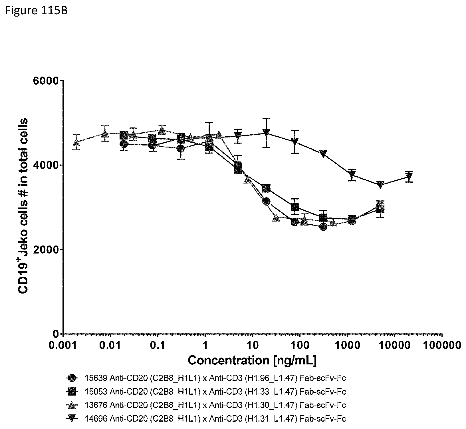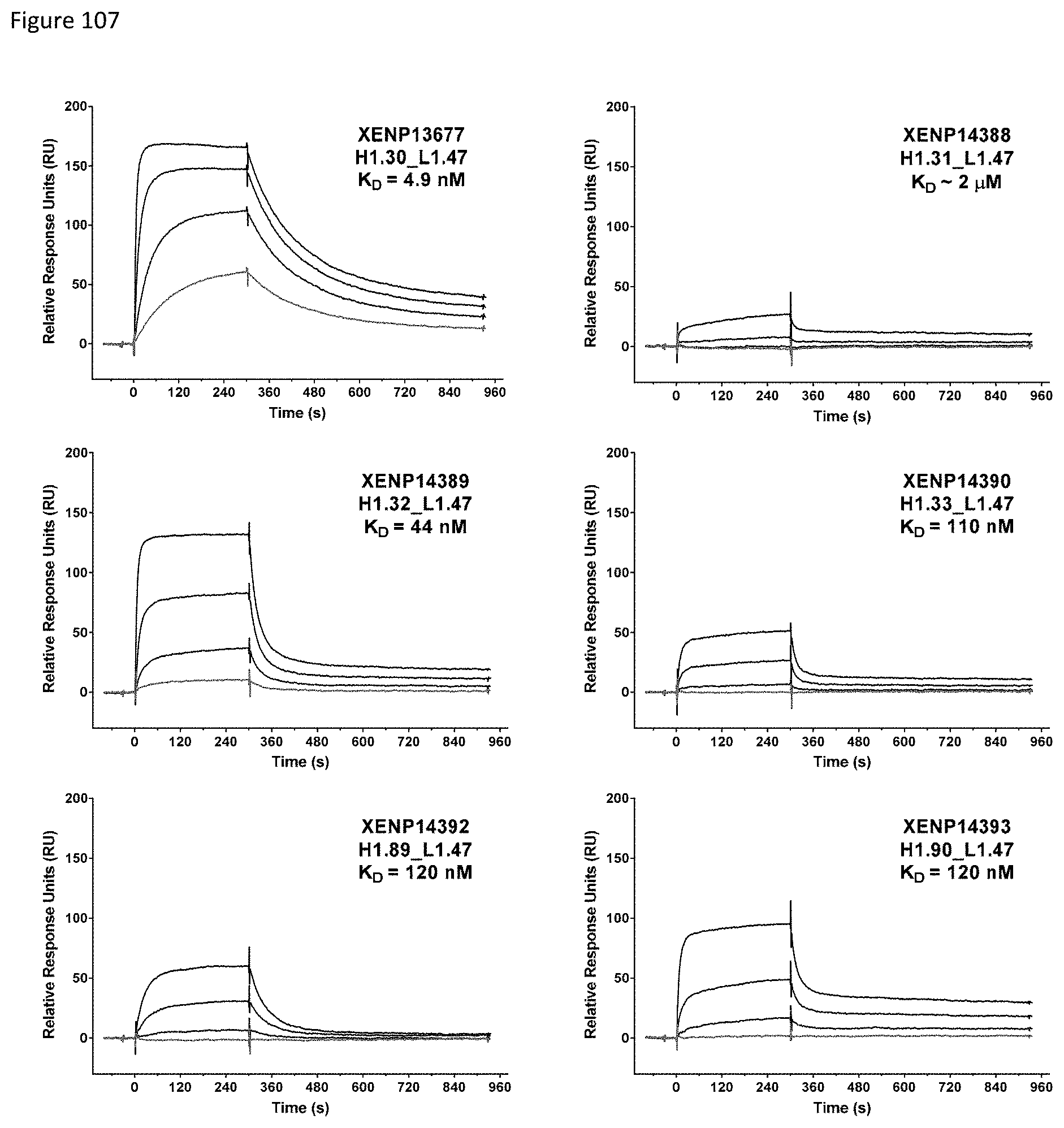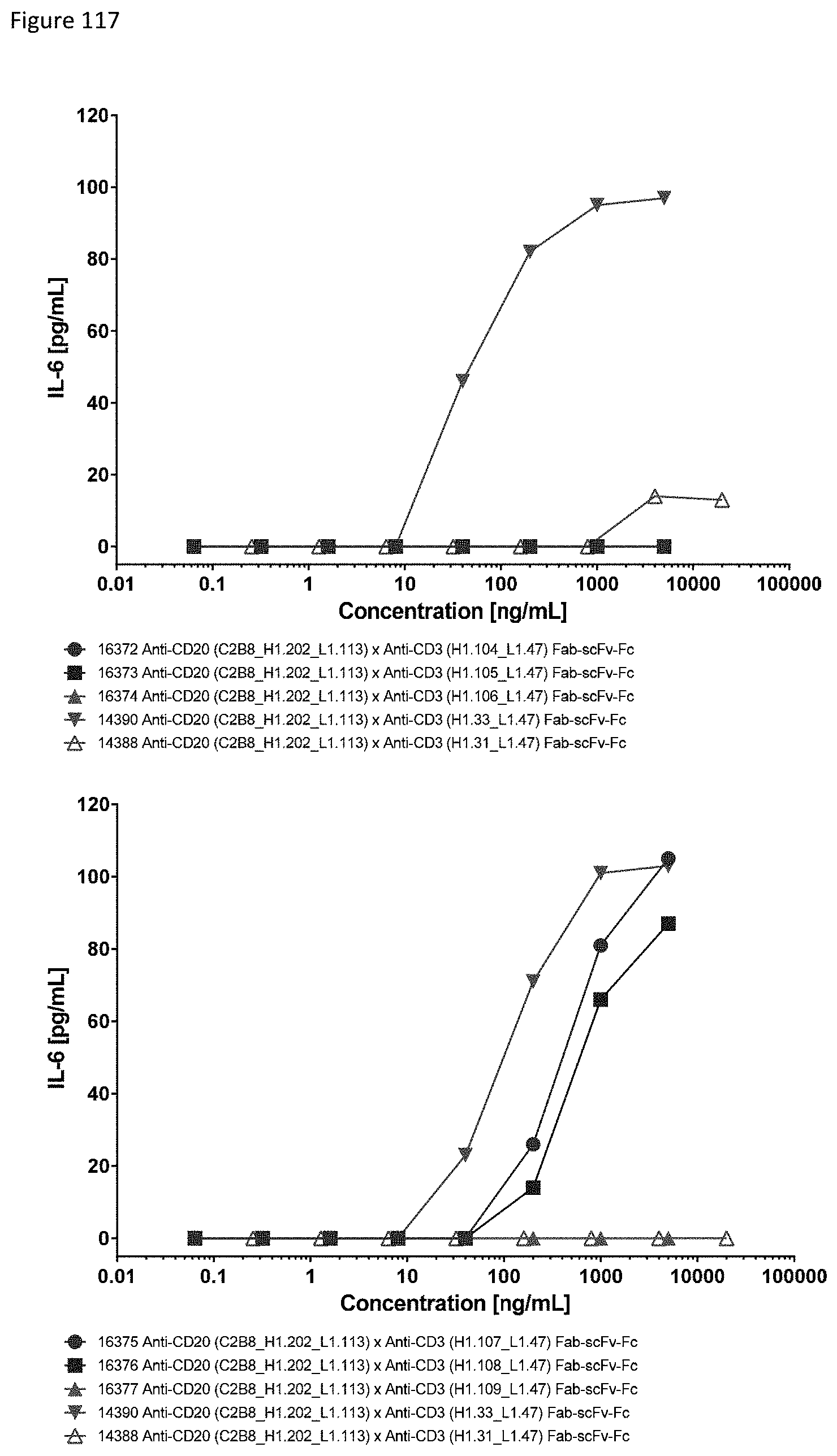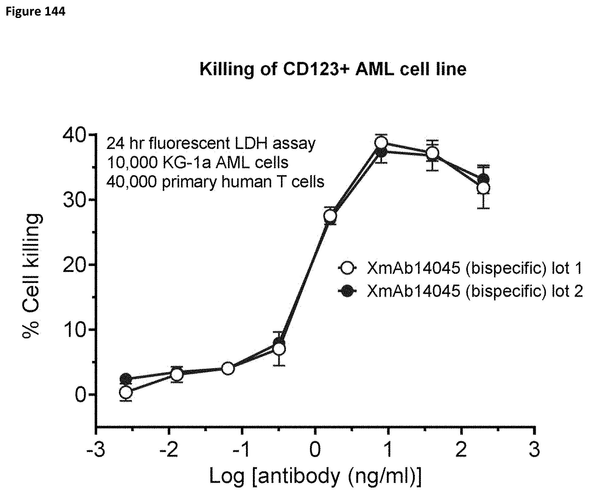 Cynomolgus monkeys were given a single dose of anti-CD38×anti-CD3 bispecifics. An anti-RSV×anti-CD3 bispecific control was also included. Dose levels were: 20 μg/kg XmAb13551 (n=2), 0.5 mg/kg XmAb15426 (n=3), 3 mg/kg XmAb14702 (n=3), or 3 mg/kg XmAb13245 (anti-RSV×anti-CD3 control, n=3) (in 3 independent studies). Anti-CD38×anti-CD3 bispecifics rapidly depleted CD38+ cells in peripheral blood (see FIG. 49). Anti-CD38×anti-CD3 bispecifics resulted in T cell activation as measured by CD69 expression (see FIG. 50). Serum levels of IL-6 were also measured (see FIG. 51). Note that, compared to XmAb13551, XmAb15426 had an increased duration of CD38+ cell depletion and lower levels of T cell activation and IL-6 production.