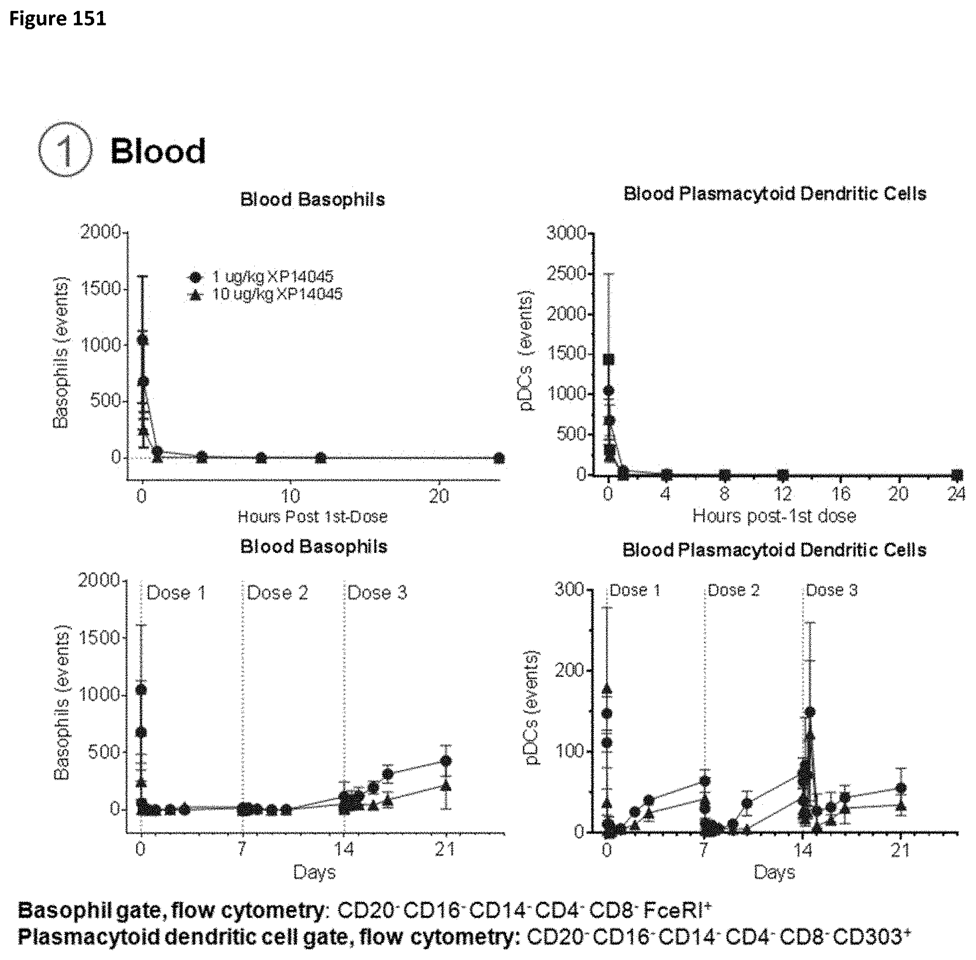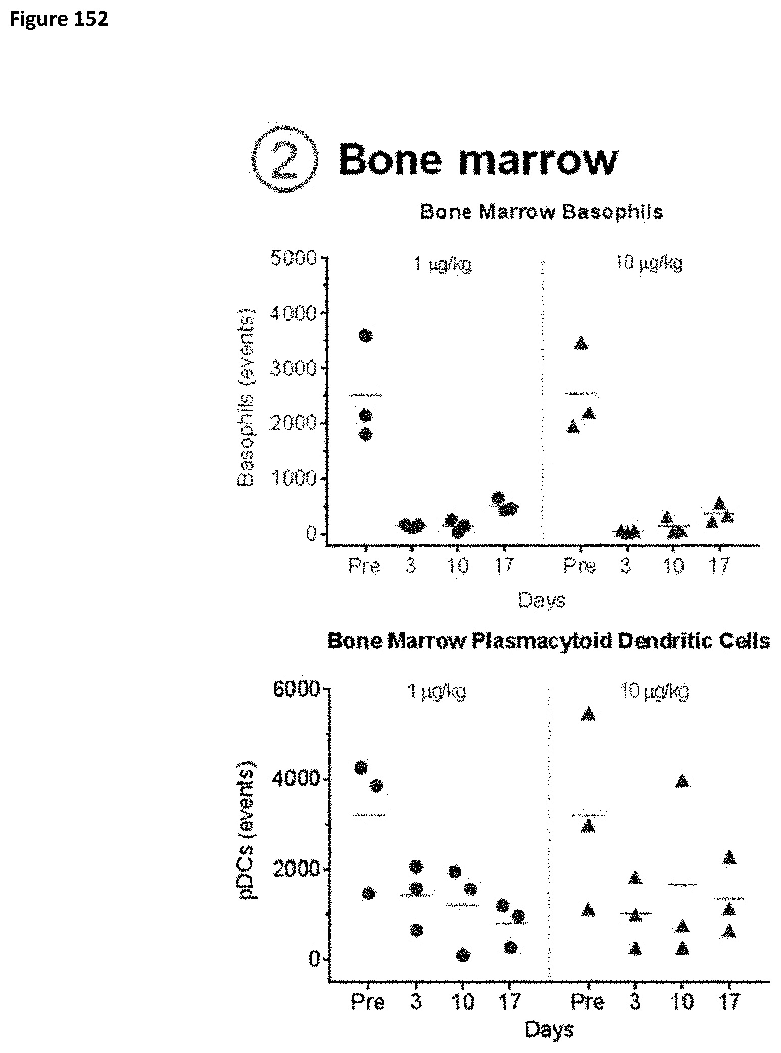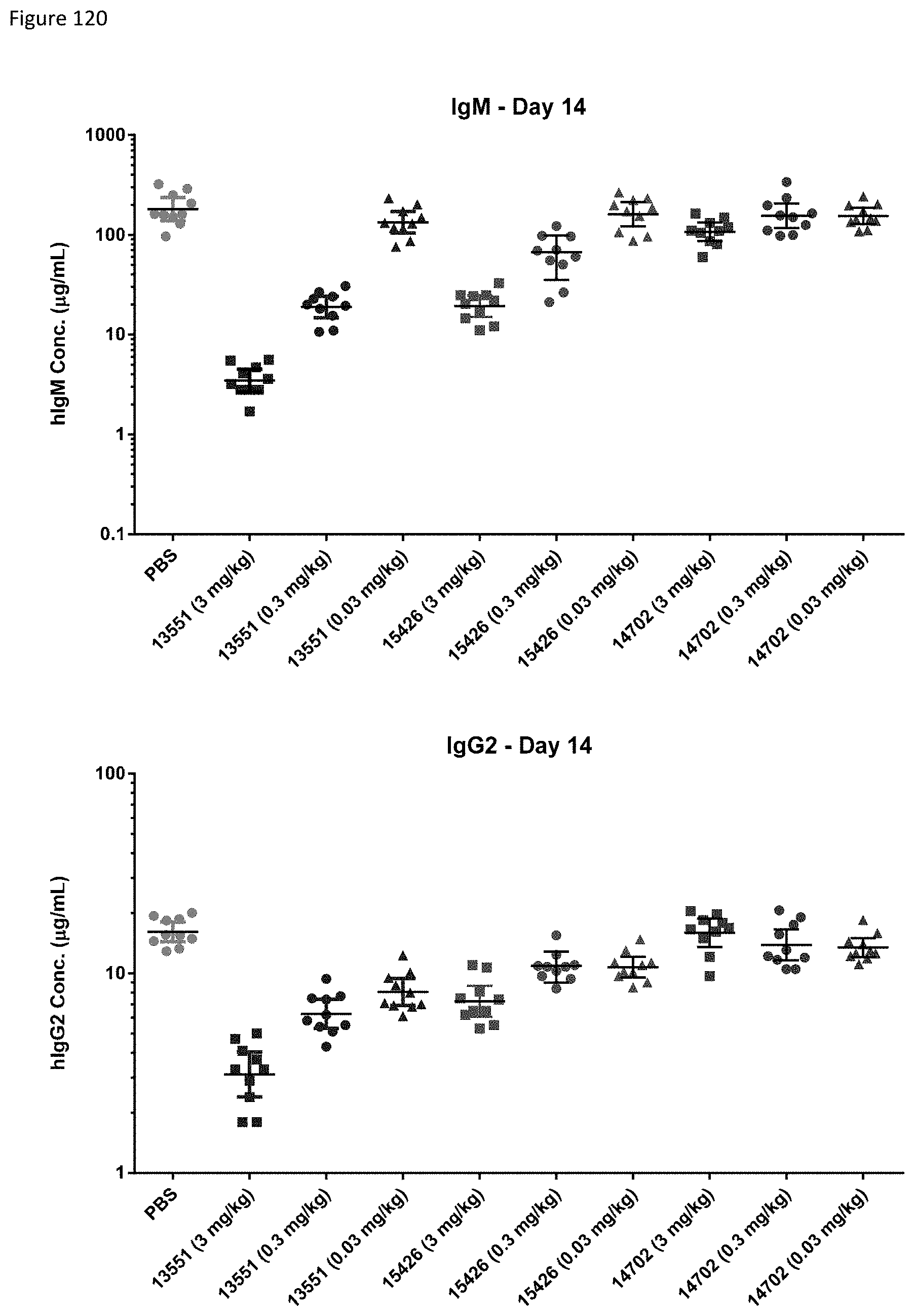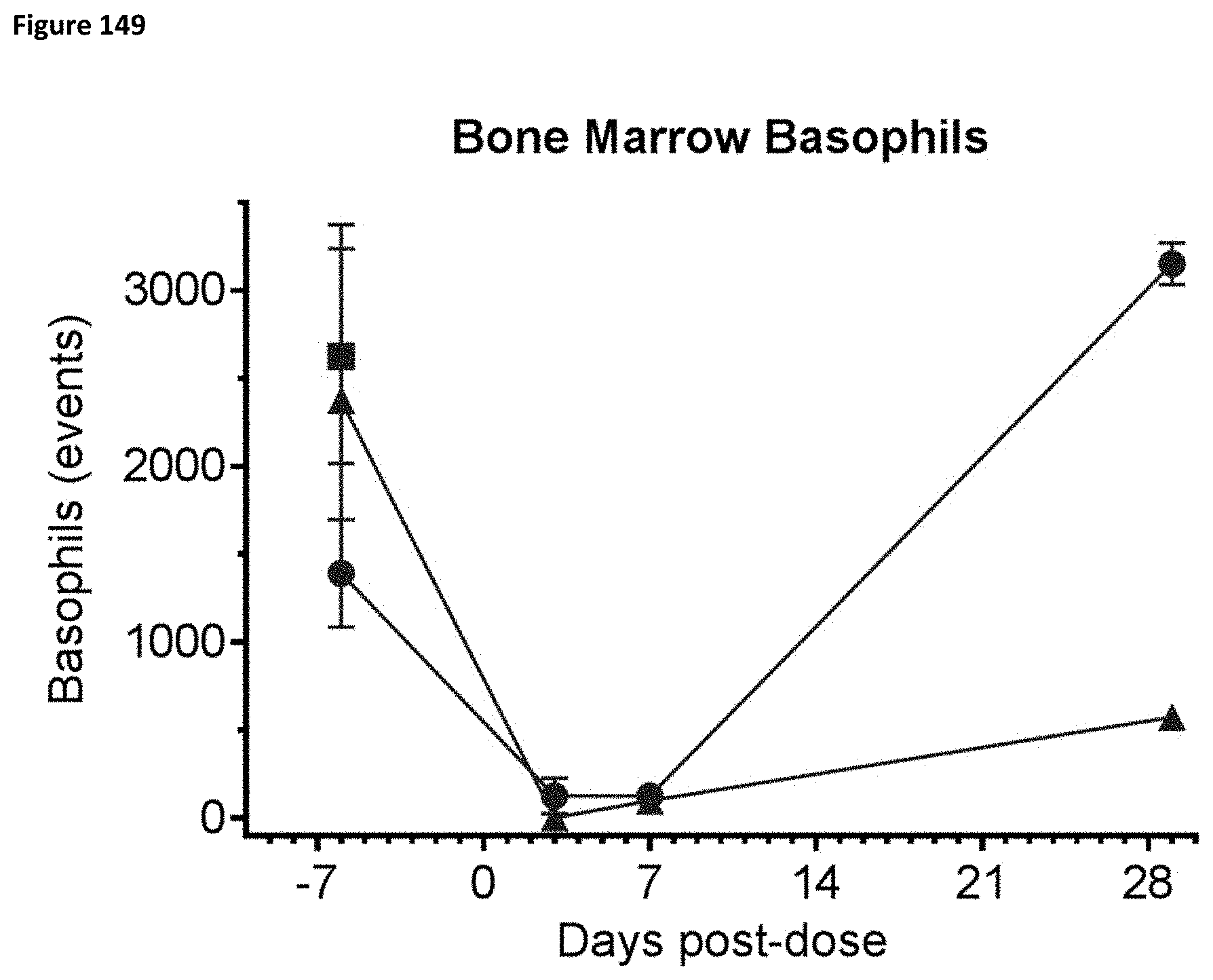 Cynomolgus monkeys were given a single dose of anti-CD38×anti-CD3 bispecifics. An anti-RSV×anti-CD3 bispecific control was also included. Dose levels were: 20 μg/kg XmAb13551 (n=2), 0.5 mg/kg XmAb15426 (n=3), 3 mg/kg XmAb14702 (n=3), or 3 mg/kg XmAb13245 (anti-RSV×anti-CD3 control, n=3) (in 3 independent studies). Anti-CD38×anti-CD3 bispecifics rapidly depleted CD38+ cells in peripheral blood (see FIG. 49). Anti-CD38×anti-CD3 bispecifics resulted in T cell activation as measured by CD69 expression (see FIG. 50). Serum levels of IL-6 were also measured (see FIG. 51). Note that, compared to XmAb13551, XmAb15426 had an increased duration of CD38+ cell depletion and lower levels of T cell activation and IL-6 production.