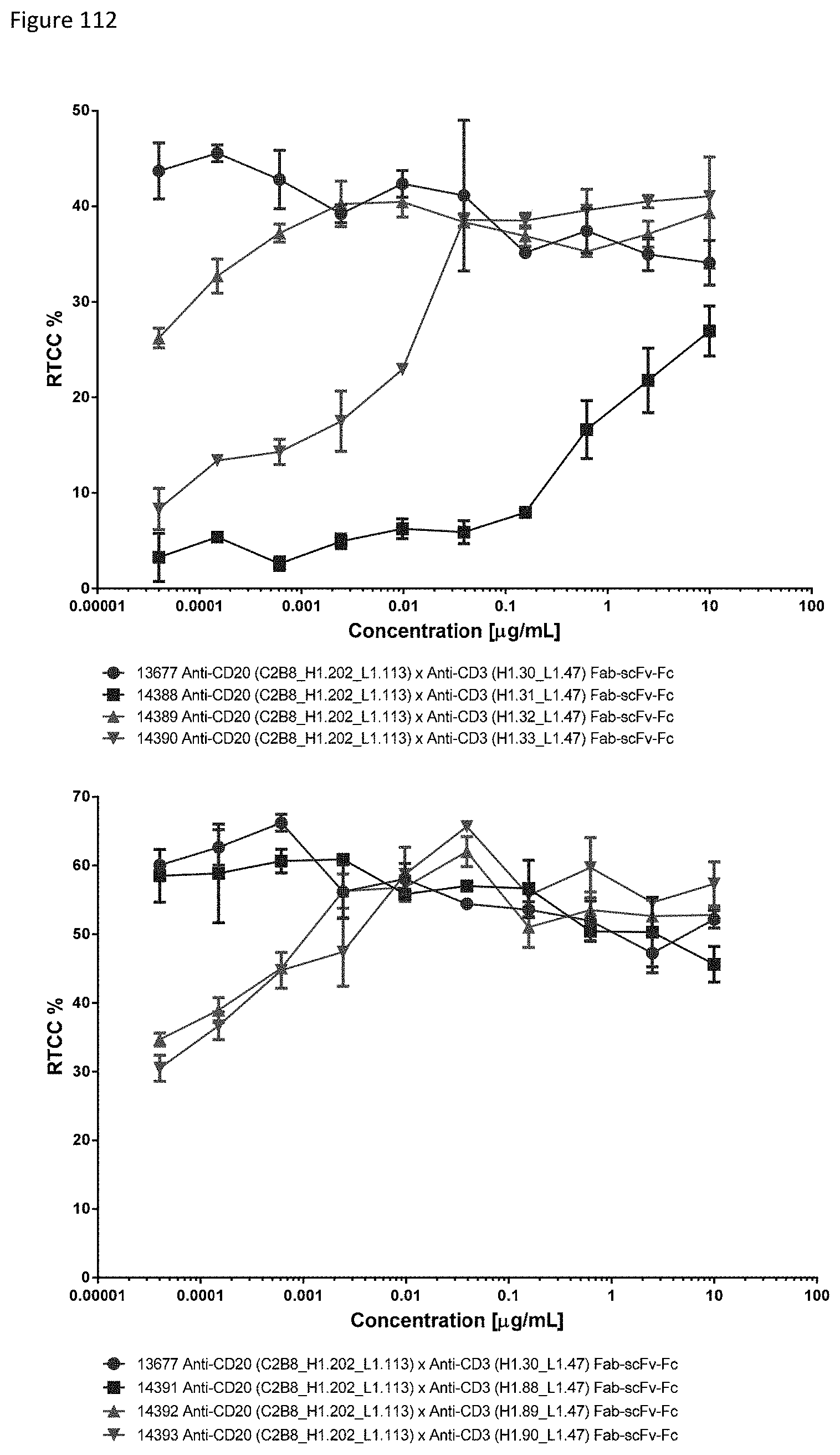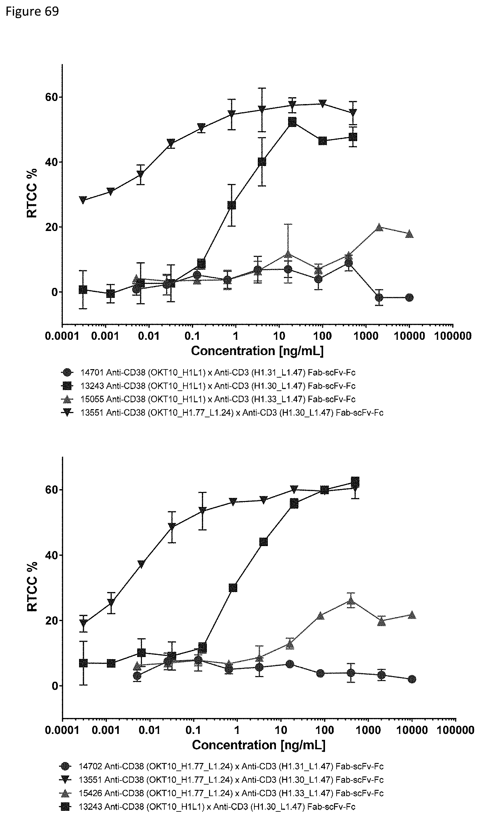 Anti-CD38×anti-CD3 bispecifics were characterized in vitro for redirected T cell cytotoxicity (RTCC) of the CD38+ RPMI8266 myeloma cell line. 10k RPMI8266 cells were incubated for 24 h with 500k human PBMCs. RTCC was measured by LDH fluorescence as indicated (see FIG. 37).