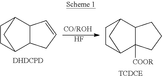 Examples Comparative Examples 1 2 3 4 5 1 2 3 4 5 6 7 8 DHDCPD [parts by mass] 63.0 68.7 76.1 82.9 62.6 69.6 90.9 69.8 86.5 94.8 101.5 99.2 86.8 HF [parts by mass] 75.1 81.9 90.8 98.7 93.3 83.0 108.4 83.3 103.2 113.1 121.1 118.6 129.3 TCD isomer mixture [parts by mass] 157.4 103.0 114.2 82.8 93.9 174.0 90.9 174.6 86.5 47.4 52.2 0 0 n-Hep [parts by mass] 40.4 30.7 31.4 30.6 28.0 30.1 32.6 43.6 27.9 23.7 17.0 42.6 44.6 HF/DHDCPD [molar ratio] 8.0 8.0 8.0 8.0 10.0 8.0 8.0 8.0 8.0 8.0 8.0 8.0 10.0 TCD/DHDCPD [ratio by mass %] 250 150 150 100 150 250 100 250 100 50 51 0 0 Endo form of TCD/Exo form of TCD 100/0 100/0 60/40 100/0 100/0 50/50 50/50 0/100 0/100 100/0 60/40 — — (constituent ratio) CO pressure [MPaG] 2.0 ← ← ← ← ← ← ← ← ← ← ← ← Reaction temperature [° C.] 30 ← ← ← ← ← ← ← ← ← ← ← ← Aging time after raw material supply 30 ← ← ← ← ← ← ← ← ← ← ← ← [min] EtOH [parts by mass] 26.0 28.3 28.3 34.0 25.8 28.7 37.5 28.8 35.0 39.0 41.9 41.0 35.8 EtOH/DHDCPD [molar ratio] 1.2 1.2 1.1 1.2 1.2 1.2 1.2 1.2 1.2 1.2 1.2 1.2 1.2 Reaction temperature [° C.] 5 ← ← ← ← ← ← ← ← ← ← ← ← Aging time after ethanol supply [min] 30 ← ← ← ← ← ← ← ← ← ← ← ← TCDCE yield [mol %] 77.9 70.4 71.5 68.0 72.3 67.0 66.0 59.6 57.2 63.8 56.8 53.9 55.5 INDUSTRIAL APPLICABILITY