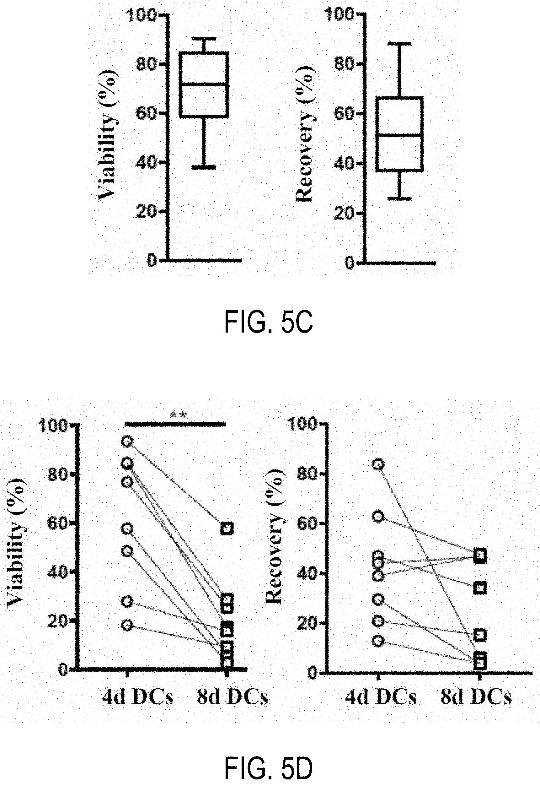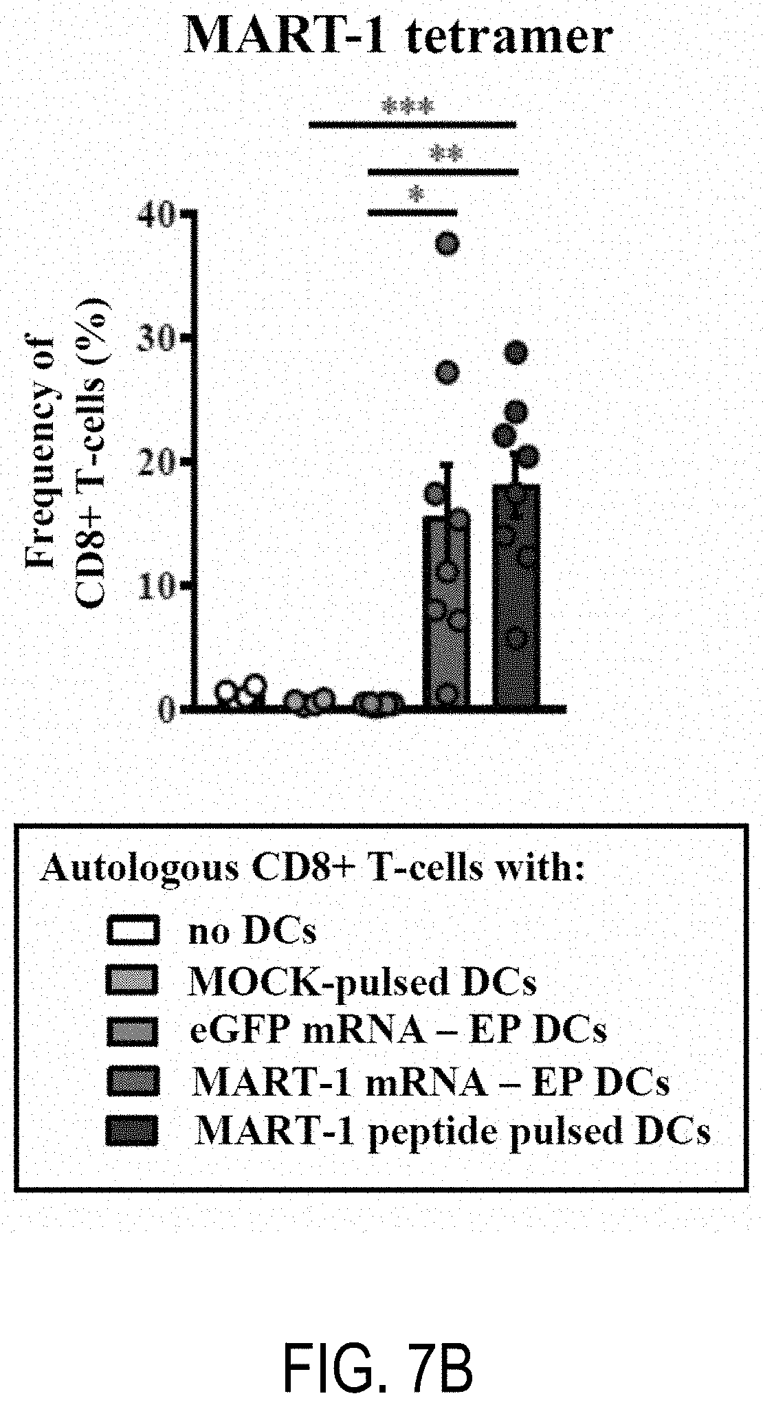 Hence for CXCL10 the secretion levels by the DCs generated according to the method of the present invention are at least 50-fold higher than the secretion by DCs generated using the “classical” method. A similar superiority of the DCs obtained with the method of the present invention is observed with additional cytokines and chemokines that promote type-1 polarized inflammatory responses as required for anti-cancer immunity, among which IFN-g, CCL3, CCL4, CCL5 and CXCL9. By contrast, for the chemokine CCL17 (involved in the recruitment of regulatory T-cells and type 2-polarized T-cells, both detrimental to anti-cancer immune responses), release by the DCs generated according to the method of the present invention is at least 3-fold lower than secretion by DCs generated using the “classical” method. Accordingly, the DCs obtained with the method of the invention drive the differentiation of naïve T-helper cells towards a type-1 polarized profile characterized by high IFN-γ secretion, as required for e.g. active cancer immunotherapy. Moreover, said cells can present immunogenic epitopes derived from transfected mRNA and subsequently drive the expansion of autologous, tumor antigen-specific CD8+ T-cells that express IFN-γ and the cytotoxic molecule granzyme B, as already mentioned. In a further embodiment, the method of the invention comprises loading or transfecting the mature DCs with an antigen encoding nucleic acid, in particular RNA, more in particular mRNA. As used herein, the “antigen” is not limiting to the invention. In one embodiment, the antigen is selected from the group consisting of a tumor-antigen, a tumor-associated antigen, a cancer-testis antigen, a mutanome-derived antigen, a (oncogenic) viral antigen, a bacterial antigen, a yeast antigen, a parasitic antigen and a fungal antigen. The antigen can be autologous to the subject, and can be used to prepare an antigen-loaded autologous DC vaccine for administration to the subject. By autologous to the subject is meant that the antigen (or sequence thereof) is obtained or derived from the same subject. As non-limiting examples, the antigens may be from cancer cells or tumor tissue obtained from a subject. The cancer antigens could be loaded into dendritic cells as cancer cells, cancer cell or tissue lysates, extracts from cancer cells or tissues, purified or cloned components of cancer cells or tissues, total RNA or total mRNA, or selected RNA or mRNA from such cells or tissues, whether present in extracts, purified, amplified, in vitro translated and the like. Alternatively, the antigen may be obtained or derived from a pathogen or from pathogen-infected cells present in a subject. The term “nucleic acid” refers to single-stranded, double-stranded and triple helical molecules, a gene or gene fragment, exons, introns, mRNA, tRNA, rRNA, ribozymes, cDNA, recombinant polynucleotides, branched polynucleotides, plasmids, vectors, isolated DNA of any sequence, isolated RNA of any sequence, nucleic acid probes, and primers. More specifically, the dendritic cells are transfected in vitro with one or more antigen encoding mRNA. Optionally and in an alternative embodiment, after the maturation period is completed, DCs may be first harvested before further handling (such as e.g. transfection), whereby the cells are collected, centrifuged and/or the cytokines are washed out. In view of the accelerated culture protocol, the transfection of the mature DCs is possible at about 72 to 96 hours, in particular after 86 hours+/−4 hours, after the monocyte isolation or the addition of differentiation stimuli to the precursor DCs. In the context of the present invention, transfection methods include, but are not limited to, electroporation, photoporation, lipofection, viral vector systems, incubation of naked nucleic acids or fusion of DCs with infected cells or tumor cells. These standard methods are well known in the art and are feasible and introduce nucleic acids, such as antigen encoding plasmids, RNA of them or DNA, into the DCs. There might also be other antigenic combinations with original MHC molecules conceivable such as membrane fragments or exosomes to use as antigen sources of any kind. In a specific embodiment, the mature DCs are transfected by electroporation. Three different types of pulses can be used for electroporation such as Exponential Decay Pulse, Square Wave Pulse and Time Constant. In a particular embodiment of the invention, the electroporation consists of square wave pulse. Typically 1 or 2 pulses are induced in order to complete transfection. In a one embodiment of the invention, the antigen is loaded by electroporation of a dendritic cell with a nucleic acid, preferably a mRNA. Preferably, the dendritic cells are transfected with approximately 0.25 to 4 μg RNA per 10E6 dendritic cells, most preferably with about 1 to 3 μg RNA per 10E6 dendritic cells. In one embodiment, 1 to 2 μg antigen RNA per million DC is used per transfection. It was demonstrated herein that the cells obtained by the method of the invention uniformly and stably express protein derived from transfected mRNA (see EXAMPLES). Moreover, said cells can present immunogenic epitopes derived from transfected mRNA and subsequently drive the expansion of autologous, tumor antigen-specific CD8+ T-cells with a cytotoxic profile, as required for e.g. active cancer immunotherapy. In the context of the present invention, it has been found that stimulation of immature dendritic cells as provided herein under shortened incubation times, e.g. within approximately 3 days, results in the generation of mature dendritic cells with improved viability, functionality and/or immunostimulatory activity as compared to mDCs prepared by a “classical” protocol of 8 days. As used herein, the term “immunostimulatory activity” refers to the capability of a mature dendritic cell or of a mature dendritic cell population to produce and/or to secrete suffic