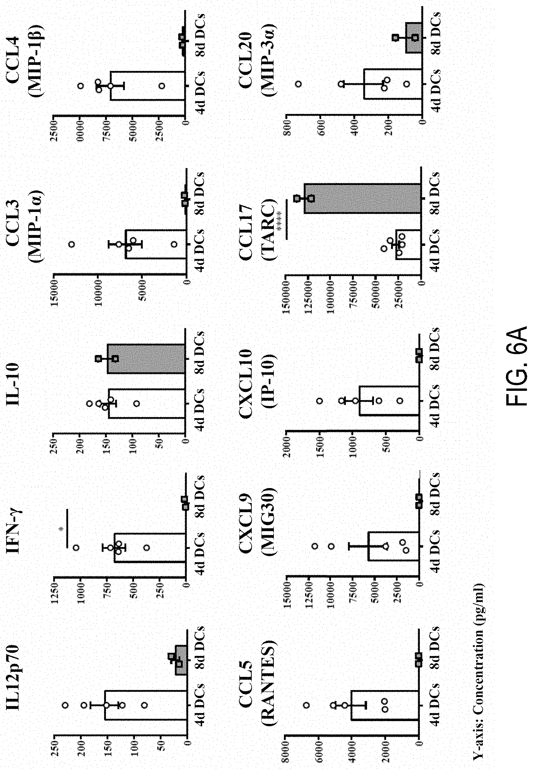 The median levels of CD40, CD70 and CCR7 are higher with statistical significance (two-tailed p-value<0.05) compared to those displayed by DCs generated using the “classical” protocol. In one embodiment of the present invention, cell surface marker expression levels on DCs generated herein are compared with the same on DCs generated using the “classical” method using PGE2 and TNF-α as maturation stimuli and whereby mature dendritic cells are obtained after 8 days. For example, for the T-cell co-inhibitory ligand PD-L1, cell surface levels as expressed by relative mean fluorescence intensity (relMFI) (for a description of the analytical method used, see Material and Methods section under EXAMPLES) are below 400, 350, 320, 310, 300, 250, 200, in particular below 150. In addition, on the DCs produced according to the present invention, surface PD-L1 expression after electroporation, cryopreservation and cell thawing (i.e. representative for the product at the time of administration to the patient) is below 500, 470, 450, in particular below 400. Hence, at the time of cell harvest (directly after DC maturation), the expression levels of PD-L1 by the DCs generated according to the method of the present invention is at least 3-fold, 4-fold, 5-fold, 6-fold, 7-fold, 8-fold, 9-fold and in particular at least 10-fold, lower than expression by DCs generated using the “classical” method using PGE2 and TNF-a as maturation stimuli and whereby mature dendritic cells are obtained after 8 days (see Hence, at the time of cell thawing, the expression levels of PD-L1 by the DCs generated according to the method of the present invention is at least 4-fold, 5-fold, 6-fold, 7-fold, 8-fold, 9-fold and in particular at least 10-fold, lower than expression by DCs generated using the “classical” method using PGE2 and TNF-a as maturation stimuli and whereby mature dendritic cells are obtained after 8 days (see Functionally, after cryopreservation and thawing the cells preserve the capacity to secrete type-1 polarizing cytokines (IL-12, IFN-g) and chemokines attracting Th1, CD8 and NK cells during prolonged incubation in cytokine-free medium. In particular the DCs produced according to the method of the present invention secrete statistically significant higher levels of the CXCR3 ligands CXCL9 (MIG30) and CXCL10 (IP-10), as well as the CCR5 ligands CCL3 (MIP-1α), CCL4 (MIP-1β) and CCL5 (RANTES), and lower to undetectable levels of CCL17 compared to DCs obtained with the aforementioned “classical” method. In one embodiment, the cytokine and chemokine secretion level is expressed in relative terms, i.e. when compared to the secretion level of the resp. cytokine or chemokine by DCs generated using the “classical” method using PGE2 and TNF-a as maturation stimuli and whereby mature dendritic cells are obtained after 8 days. Secretion levels can be determined by using standard protein measuring methods, e.g. ELISA or the herein provided Luminex® method. For example, for the prototypical type-1 T-cell-polarizing and NK cell-supporting chemokine IL-12, the range of levels released in dendritic cell supernatant after thawing and further culture in the abovementioned conditions are: