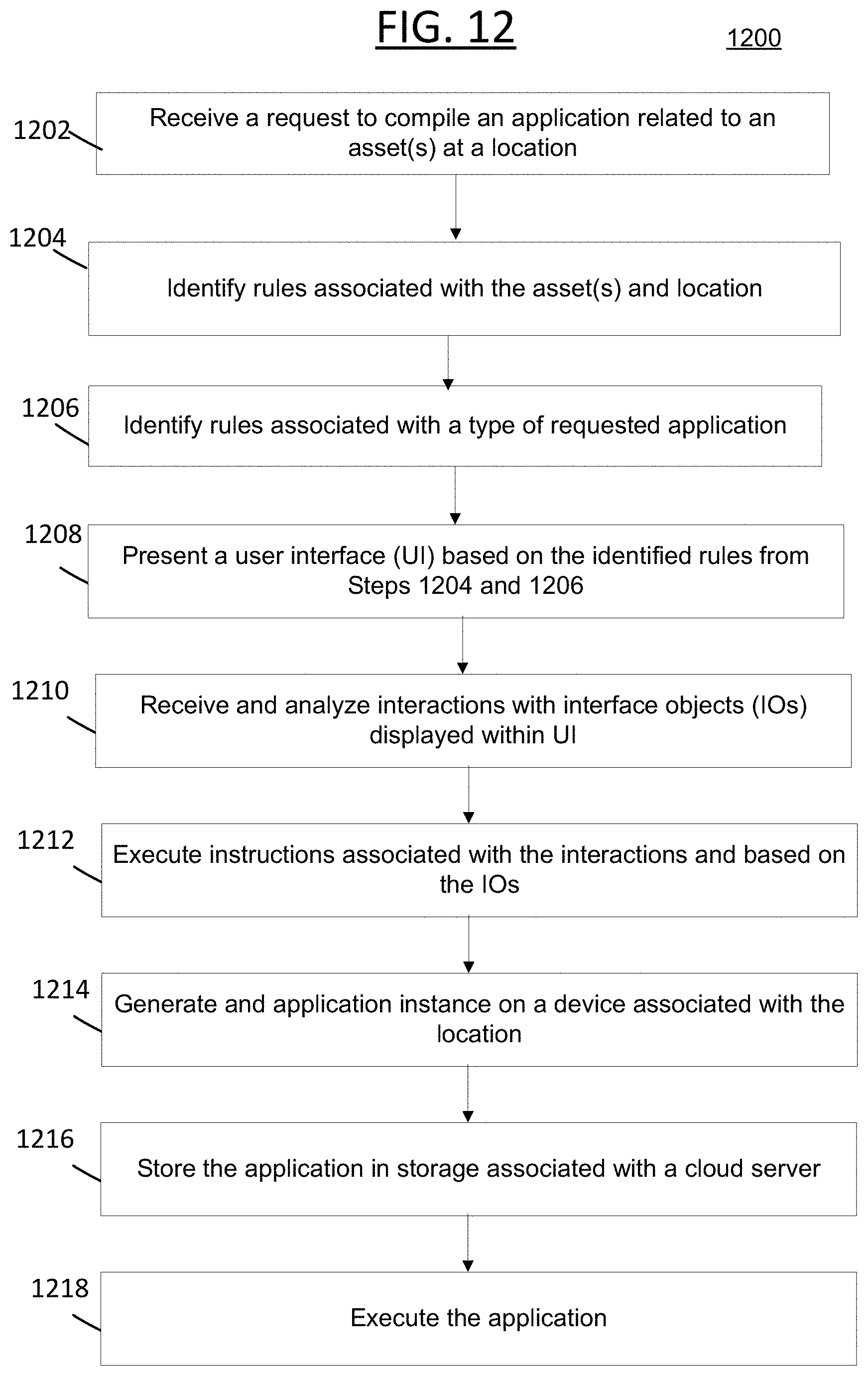 receiving, by the computing device, a request to generate an application, the request comprising information indicating specific functionality of a physical asset at a location; identifying, by the computing device, application rules associated with the physical asset and application rules associated with the specific functionality; compiling and presenting, by the computing device, a user interface (UI) based on the identified application rules, the UI comprising interface objects (IOs) corresponding to capabilities for generating components of the requested application; receiving, by the computing device, interactions with the IOs, the interactions comprising feedback indicating a configuration of the capabilities; generating, by the computing device, based on the received interactions, the requested application, the generated application being configured according to the configured capabilities identified from the interactions; and enabling, by the computing device, execution of the generated application. 20. The non-transitory computer-readable storage medium of storing information related to the generated application in cloud storage; receiving another request related to another physical asset, the other physical asset being a type of asset that is similar to the physical asset at the location; retrieving the stored information for the generated application; and compiling and presenting another UI based on said information.