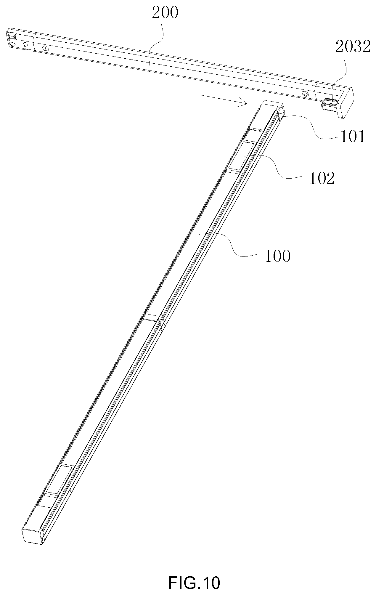 1. A shelf lighting system, comprising a lighting module (100) and a power taking module (200), characterized in that the lighting module (100) is disposed on the lower surface of a laminate (300) near the outer edge of the laminate (301), the power taking module (200) comprises: