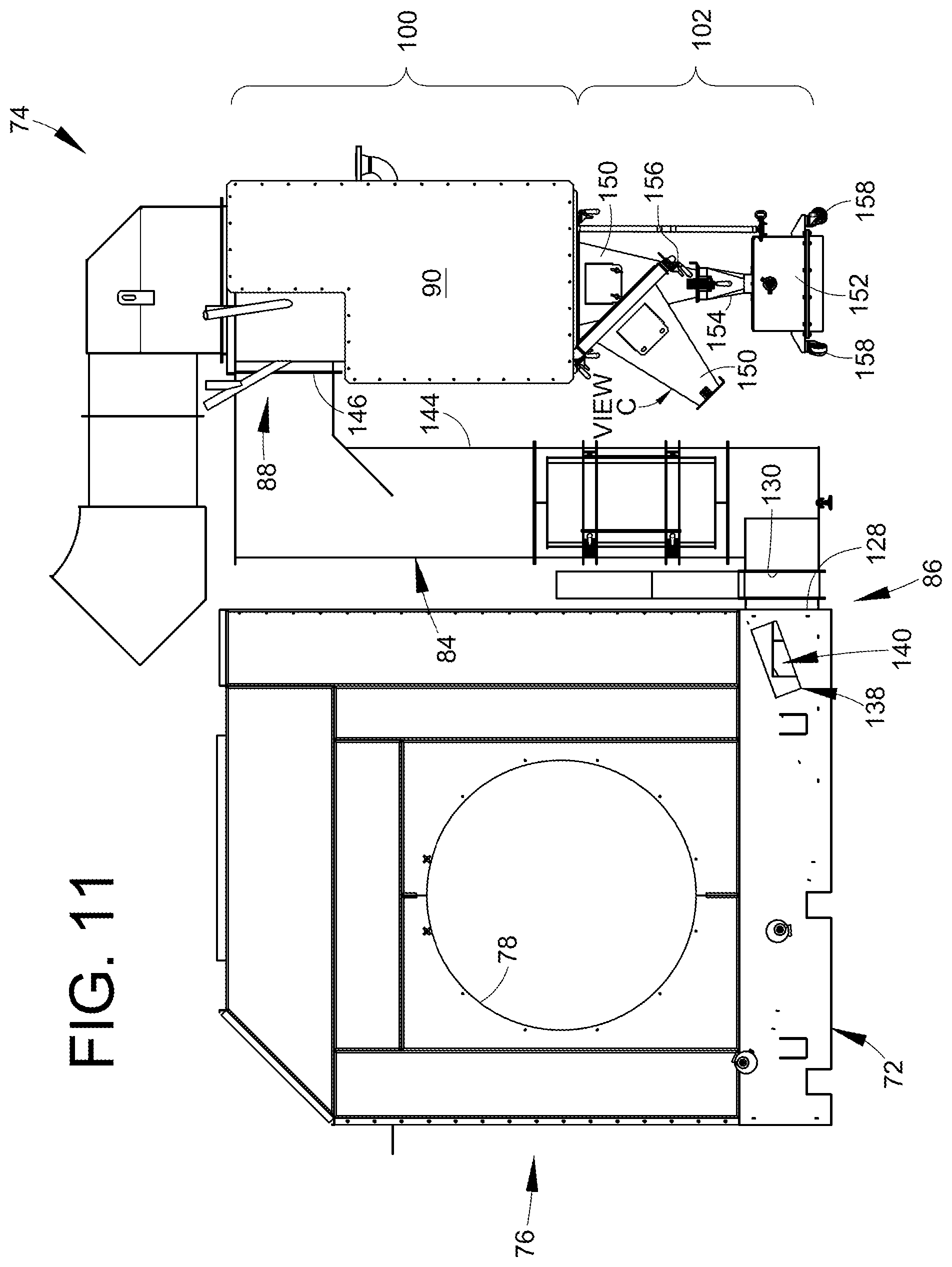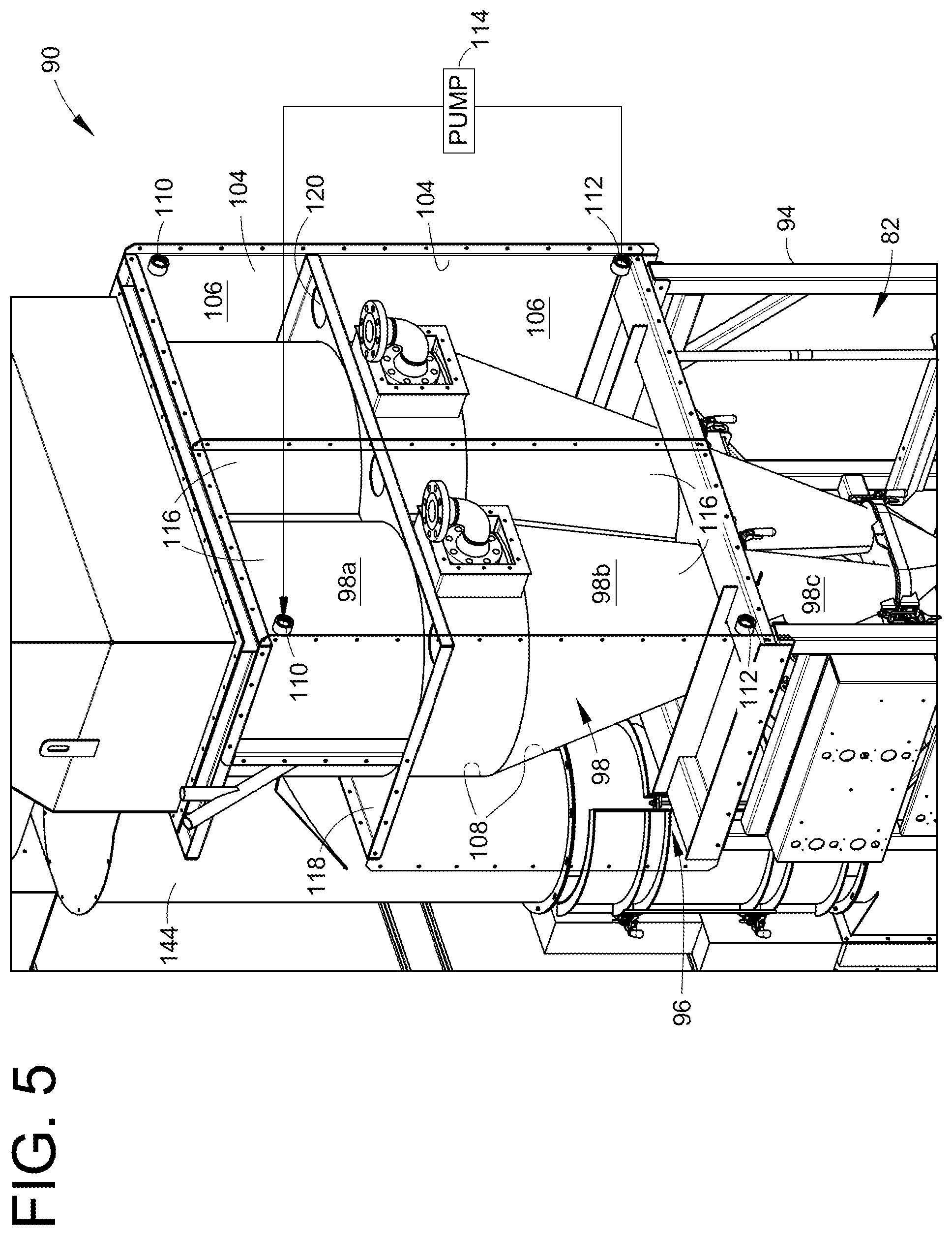 FIGS. 5-7 illustrate in more detail the enclosure 90 for the cyclone 82. The enclosure 90 may be realized in the form of a jacket or shell 96 that is supported on the frame 94. The jacket 96 forms a fluid-tight enclosure that at least partially surrounds the cyclone body 98. The cyclone body 98 comprises the cyclone wall structure within which the process air becomes drawn into a vortex for separating powder from the air. The cyclone body 98 typically may include a cylindrical section 98a, an upper conical section 98b and a lower conical section 98c. The cylindrical section 98a and the upper conical section 98b may be welded together or otherwise held together and preferably are stationary and may be fixed to the frame 94. The cylindrical section 98a and the upper conical section 98b form a cyclone upper portion 100 (see FIG. 11). The lower conical section 98c forms a cyclone lower portion 102 (see FIG. 11). Although in this embodiment the lower cyclone portion 102 is moveable (as further described below) such need not be the case. In an embodiment in which the lower cyclone portion 102 is fixed, then the enclosure 90 optionally may enclose all or a portion of the cyclone lower portion 102 as well.