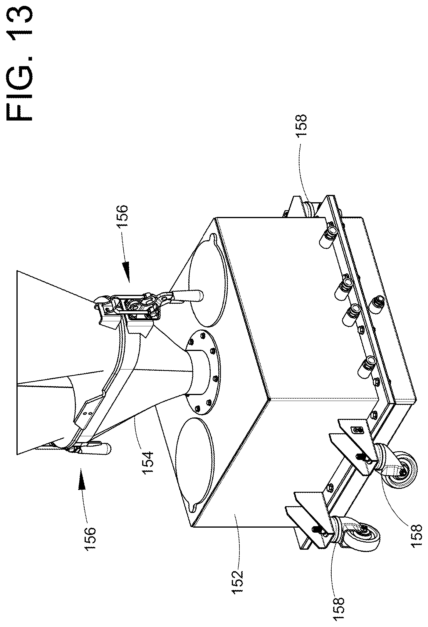 In the example of FIG. 12, the powder overspray recovery system 14 is realized in the form of a powder cyclone separator 30. Depending on how much powder overspray needs to be extracted from the spray booth, or the geometric constraints of the system, a single cyclone, twin cyclone or more cyclones alternatively may be used. The exemplary embodiments herein illustrate a twin cyclone configuration, but the inventions and concepts herein may optionally be used with a single cyclone configuration.