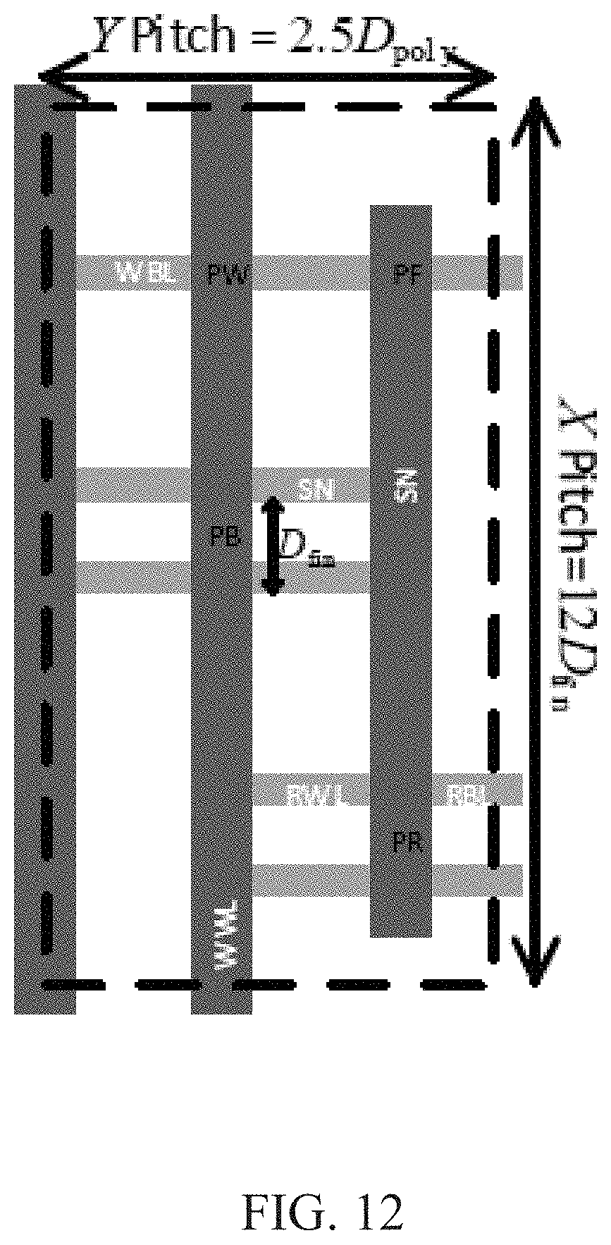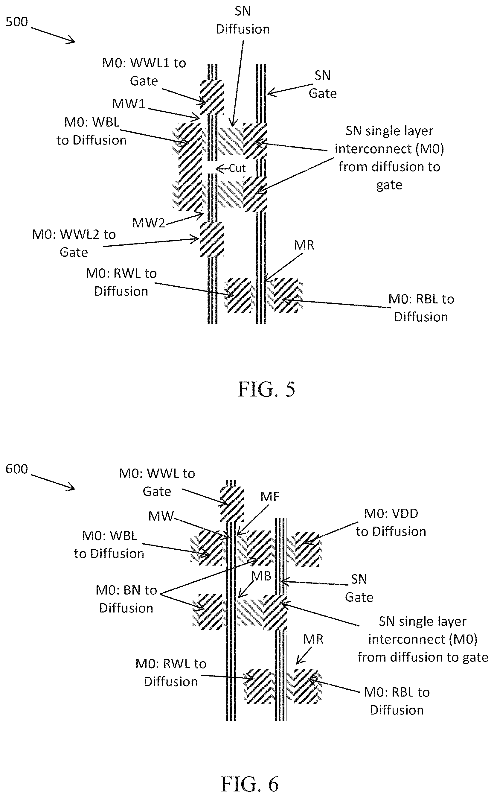 The SN single layer interconnect connects the gate of read FinFET transistor (MR) to the second diffusion connections of both write FinFET transistors (MW1 and MW2) and to the gate of write FinFET transistor (MF). The height of the single layer interconnect differs at the gate connections relative to both diffusion connections in order to compensate for the relative heights of the diffusions and gate relative to the substrate, as described above. Optionally the two write transistors are of different types (PMOS and NMOS). d) 4T FinFET Gain Cell Reference is now made to The write port includes: