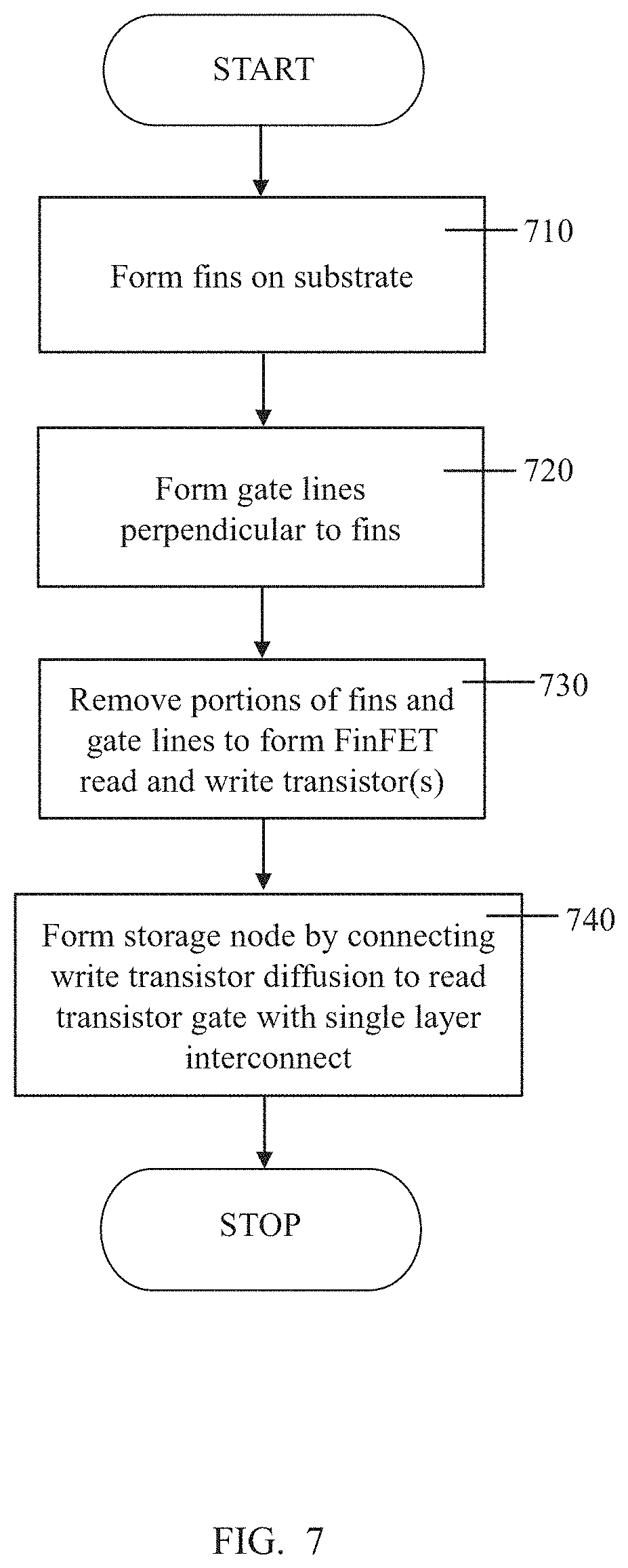 The SN single layer interconnect connects the gate of read FinFET transistor (MR) to the second diffusion connection of write FinFET transistor (MB) and to the gate of write FinFET transistor (MF). The height of the single layer interconnect differs at the diffusion connection relative to both gate connections in order to compensate for the relative heights of the diffusion and gates relative to the substrate, as described above. In some embodiments of the invention, a memory device includes an array of FinFET gain cells (according to any of the embodiments described above). The respective WBL connections of the gain cells are connected to a common write bit line and the respective RBL connections of the gain cells are connected to a common read bit line. At least two adjacent gain cells shared a diffusion fin so as to reduce the area of the array of gain cells. Optionally, the FinFET gain cells are arranged in an array of rows and columns, and pairs of adjacent gain cells in the rows share diffusion fins. Reference is now made to In 730, portions of the semiconductor fins and gate lines are removed to create to form the appropriate read and write transistor layouts for the given gain cell. The layout may be any FinFET gain cell layout, including but not limited to the layouts of In 740, the write port diffusion and read port gate components of the storage node are connected with a single layer of conductive material (i.e. the single layer interconnect at the storage node), thereby forming the gain cell storage node. Interconnects are also formed between WWL, WBL, RWL and RBL and the appropriate diffusion and gate connections in the write port and read port (according to the FinFET gain cell layout). Optionally, the height of the single layer interconnect at the write port diffusion is different from the height of the single layer interconnect at the read port gate. Optionally, the spacing between the fins is not constant and the FinFET transistors are formed on active fins which are irregularly spaced. In order to achieve a good FinFET gain cell design, factors such as leakage current and layout constraints must be considered. Following is an analysis of FinFET design considerations which may contribute to obtaining an optimal FinFET gain cell layout. Such design considerations include but are not limited to on-currents, capacitances and leakage mechanisms. The influence of these design considerations are discussed in the context of exemplary embodiments of the FinFET gain cell. The effects of FinFET manufacturing processes and double-patterning layout constraints on the choice of GC-eDRAM topology are also considered, along with the trade-offs between bitcell size, performance, and DRT which arise from these constraints. An exemplary guideline for the design of GC-eDRAM in FinFET technologies is presented. a) Leakage Characteristics From a technology standpoint, FinFET devices were introduced for the purpose of reducing sub-threshold (sub-VT) leakage, which became intolerable in planar CMOS processes in the sub-20 nm regime. Sub-threshold leakage (Isub) was the primary factor that deteriorated the storage node of GC-eDRAM bitcells in planar technologies. This dominance is reduced in FinFET technologies which have lower Isub leakage, and a larger relative size of the gate which potentially increases the gate leakage (Igate). Indeed in FinFET the gap between Isub and Igate is only about one order-of-magnitude for a nominal supply voltage (800 mV). However, this difference increases substantially at high temperatures. In addition, the bulk leakage (Ibulk) increases dramatically as the supply voltage is raised due to a strong gate induced drain leakage (GIDL) effect. In fact, at the nominal supply voltage, Ibulk is higher than Igate, and if the supply voltage (VDD) is raised it even surpasses Isub. b) Layout Constraints Due to their small dimensions and complex structure, current methods for fabricating FinFET devices create a very regular structure of fins that span the entire chip area and subsequently cover them with regularly spaced, orthogonal gate layers to create the transistors. To differentiate between devices, double etched “cut” masks are used to remove excess fin and gate materials, and level-zero interconnect layers are deposited to connect to the fins (AIL0) and gates (GIL0). As with a planar transistor, length (L) of the device is the distance between the highly doped area of the fins, separated by the channel, and the width of the device is the fin width (Wfin). However, the fin width is significantly smaller than the width of a planar device, and so a third dimension, the fin height (Hfin), is used to increase the surface area of the channel, through which the current flows. These dimensions and layers are shown in the cross section illustrations of The pre-fabricated fin-width and very thin gate line pitch (L) lead to several hard constraints on the design and layout, as illustrated in Similar to the fins, the gate lines are unidirectional and regularly spaced (at a pitch of Dpoly), basically eliminating their use as a routing layer. As with fins, separation between different potential gates along the same line is done by an additional cut step. However the separation between adjacent gate lines is less than the fin separation and therefore is less of a constraint. Finally, it is noted that different gate layer widths may be fabricated to achieve different channel lengths; however devices with different lengths require large spacing rules and therefore, all devices in a compact region must have the same length. c) Analysis of Exemplary Gain Cell Designs A. Topology Choice When comparing the four gain cells presented in In planar technologies this cost in area is almost inversely proportional to the DRT of each cell. The 4T cell design significantly reduces the sub-VT leakage from the storage node (SN) and provides a DRT extension of several orders-of-magnitude relativ