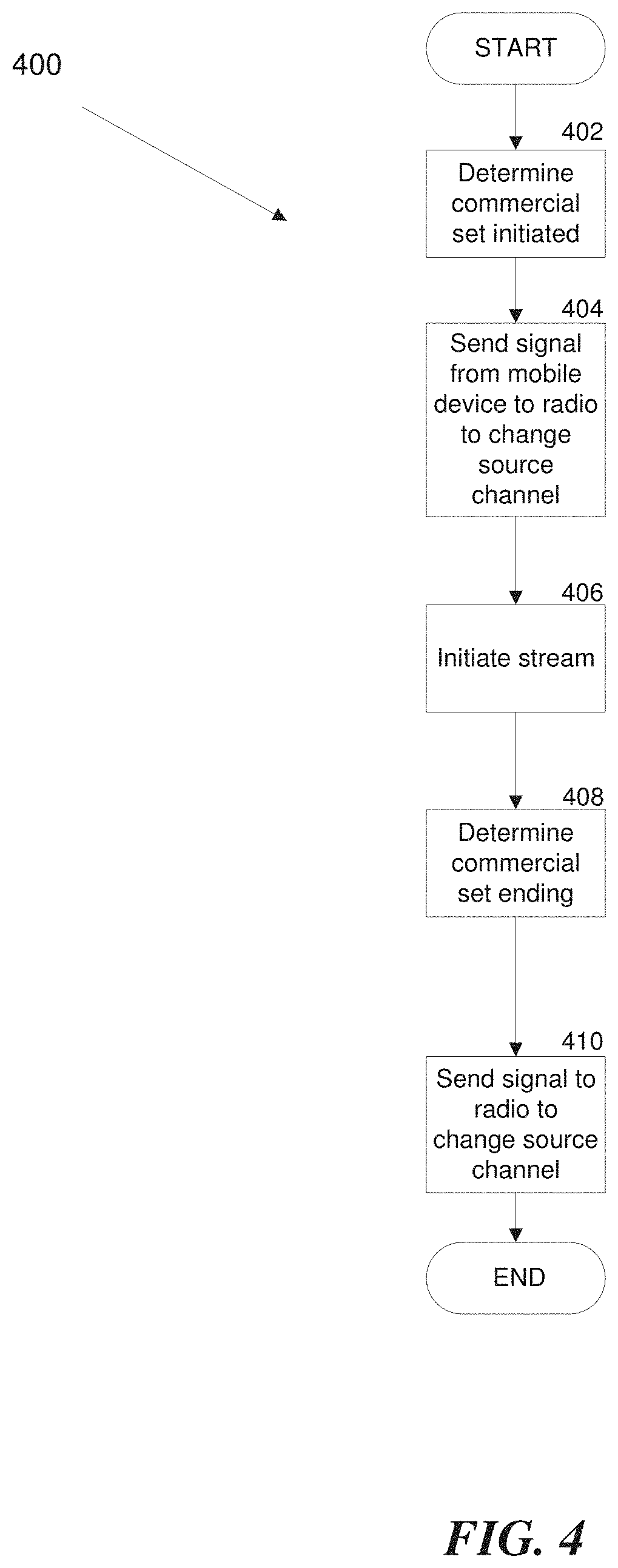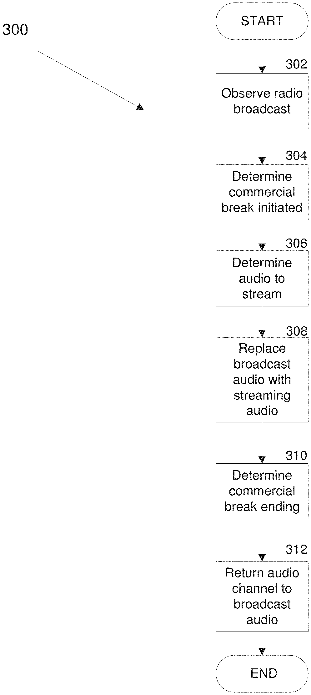This application is a continuation of U.S. patent application Ser. No. 16/258,327, filed Jan. 25, 2019, which claims the benefit of and priority to U.S. Provisional Application No. 62/622,801, filed Jan. 26, 2018, their entire contents are incorporated herein by reference and relied upon. This disclosure relates to methods and systems for providing audio services. The disclosure more particularly relates to streaming audio and integration with radio broadcasts. Broadcast radio is essentially a one to many medium where music is curated by station programming directors and sent to listeners via their tower. Streaming music is different in that anyone can stream music, but the plays of streaming audio are treated differently from a copyright use perspective. This is why broadcast radio has not completely shifted into streaming. Consumers want to avoid commercials and they have a number of options to obtain commercial free music. That said, only so many people want to pay the fees for these services and only so many people want to do the work to build playlists, discover music, etc. The vast majority of consumers would prefer to just play a radio station and skip to another station when they hear a song they don't like or when a commercial stop set plays. As a result, many broadcasters have coordinated their commercial stop sets to be played at the same time. U.S. Non-Provisional application Ser. No. 15/258,796, filed Sep. 7, 2016, entitled Apparatus, System, and Method for Digital Audio Services, is incorporated herein by reference in its entirety. U.S. Non-Provisional application Ser. No. 15/347,272, filed Nov. 9, 2016, entitled Apparatus, System, and Method for Integrating Content and Content Services, is incorporated herein by reference in its entirety. Disclosed herein is a music service that enables consumers listen to a broadcast radio station just like they do today, but when the station breaks to a commercial stop set, the service recognizes this and replaces the audio channel with streamed songs during the commercial break. The user experience will essentially be the lean back standard radio experience—only without commercials. The service operates on a number of platforms. In some embodiments, the service utilizes any of: a radio including native firmware/software, a mobile device such as a smart phone executing an application, cooperative integration of a radio and a mobile device, or master/slave relationship between a mobile device and a radio. Streamed audio is music delivered over the Internet. Services that offer streaming audio include Apple®, Spotify®, Pandora®, Slack®, and other similar services known in the art. Broadcast audio is music delivered by broadcasters and is often curated by disc jockeys (DJs) or other radio personalities. Broadcast radio is often implemented with FM or AM radio signals, though other methods exist to broadcasters. While described with respect to broadcast radio, other types of conventional broadcasts, such as television, may benefit from the technology described herein. In order to carry out the service, the technology does, in certain aspects, the following: 1. “Listen” to broadcast radio stations in real time to learn length and location of commercial stop sets; 2. Determine what station a listener is listening to; 3. When a commercial stop set is identified, trigger the service to switch to streaming music so the broadcast is not heard; 4. When the commercial stop set is over, trigger the broadcast to resume play; and 5. Smoothing/refining the handoff transition between the broadcast radio and the audio stream over time, for each station. The system 20 further includes a connection to the internet 26. This connection may be wireless or wired. In embodiments including both a radio 22 and a mobile device 24, a communications interface 28 enables communication between the radio 22 and the mobile device 24. The communications interface 28 may include any of: a wired connection via auxiliary coaxial cable, a wired connection via USB cable, wireless communication via machine-to-machine protocols (e.g., Bluetooth, Bluetooth Low Energy, Zigbee, Z-wave, etc.), wireless communication via network protocols (e.g., Wireless Fidelity, cellular networks, etc.), or other suitable communication methods known in the art and equivalents thereof. In one aspect, the communications interface 28 may be a personal FM transmitter coupled to the mobile device 24. The personal FM transmitter enables the mobile device 24 to broadcast an FM signal that is receivable by the radio 22, or other FM radios/speakers within range. Based on the communications interface 28, the system 20 establishes either a master/slave or communicative relationship between the radio 22 and the mobile device 24. A person of skill in the art readily appreciates that car radios and other broadcast devices may have to be modified to interact with mobile devices as described or to store content. Broadcast devices can include wireless communications interfaces that can receive content through radio-based communications, like Bluetooth or cellular communications, IP-based communications, infrared communications, personal FM transmitters, or some other method. Broadcast devices can include wired communications interfaces as well, including Ethernet or other IP-based communications, USB or other IEEE-standard wired communications, or some other wired communications method. In another embodiment, the “streamed audio” content can be downloaded to the device temporarily. In yet another embodiment, the content can be streamed to a second device. The storage medium 46 is can be a hard disk drive, but this is not required, and one of ordinary skill in the art will recognize that other storage media may be utilized without departing from the scope of the present invention. In addition, one of ordinary skill in the art will recognize that the storage medium 46 which is depicted for convenience a
