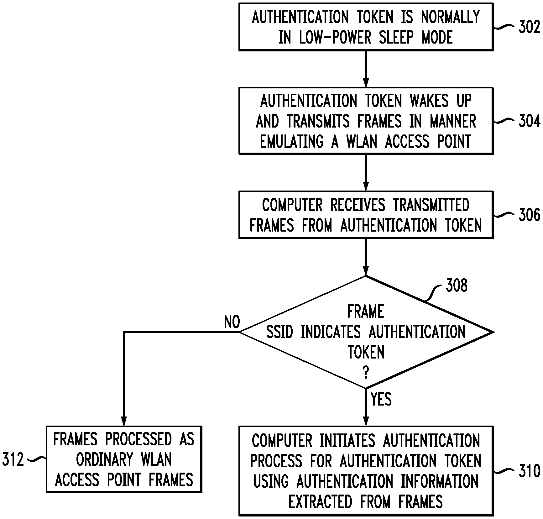 Regardless of which of the above-described methods is used to transport the authentication information, a format is needed by which the authentication information consumer, such as a computer, may recognize and interpret the information properly. The user may be situated in an environment with any number of other access points. In fact, network security tools exist which cause a computer to emit a large number of bogus beacon frames in an attempt to confuse a would-be attacker. The wireless token should remain functional in this challenging environment. At the same time, we need to remain mindful of privacy concerns. For example, a wireless token generally should not enable surreptitious tracking of users. The potential for this abuse of RFID technology has resulted in considerable strife and the beginnings of legislation concerning retail supply chain applications. For these reasons, the wireless token in this illustrative embodiment may be implemented so as to not broadcast a fixed identifier that corresponds with a token holder's claimed identity. In particular, the wireless token could emit only a non-predictable time-varying value. It is then up to the verifier or the computer in this case to determine which identity the token holder is claiming. Recall that the authentication information in this embodiment comprises what are essentially random-looking bits. For a computer to support multiple users, it must be able to determine from which token it received authentication information. But taking the approach of sending a fixed identifier would compromise privacy. For this reason, we encrypt the authentication information under a symmetric key of the type described previously herein. The computer may maintain a table of symmetric keys corresponding with those tokens it can authenticate. In order to determine from which token authentication information originated, the computer may simply perform trial decryption using each key in the table until a successful decryption occurs. Modern symmetric ciphers like AES are extremely efficient on today's processors. Especially given the trend toward multicore processors, many thousands or millions of trial AES decryptions can be performed every second. So that the computer can detect a successful trial decryption, a fixed identifier is prepended to the authentication information before it is encrypted. This fixed identifier could also include a version number to allow for future extensibility. For example, the phrase “RSABBR1.0” or simply “RSA10” would ensure that with very high probability a successful trial decryption indicates authentication information meant for the consumer. Of course, a phrase like this serves only to provide redundancy, and an error detecting or correcting code could be used instead. This approach introduces the possibility of a timing attack on the computer. For this reason, an implementation of the computer should either reorder the table of possible tokens after every successful initial identification or simply perform the remaining trial decryptions even after a token has been identified. After initial identification, a token's decryption key may be kept in a cache to improve performance. As with the full table, care should be taken to avoid timing attacks once again by either reordering the cache or simply performing the remaining trial decryptions. In addition, a token that sends its beacon frames at a precisely predetermined interval may lend itself to surreptitious identification based on this property alone. To avoid this sort of timing attack, the wireless token in this illustrative embodiment can produce its output not at a strictly predetermined interval, but rather at a randomly determined moment within a predetermined interval. In practice, this approach could be implemented by including a random or pseudorandom factor in the determination of output time. Given the relatively coarse granularity of today's Windows XP access point detection time, this requirement should not degrade performance. Regardless of whether the verifier that protects access to a particular resource is local or remote, some local device must be consuming the authentication information. Often, the verifier will allow a user to continue accessing a particular resource while authentication information has been recently received, revoking this access if the authentication information has not been recently received or if it was received at particularly low signal strength. Although this device might be a mobile telephone, PDA, or other processing device, many applications today will likely use a computer running Windows. For this reason, we focus on the design issues relevant to this platform, although other platforms such as Linux can of course be used. As is well known, Windows has evolved a layered approach to support network protocols and peripherals such as network interface cards. In the present illustrative embodiment, authentication software running on the computer gains access to the authentication information sent by the token by opening a socket to a Network Driver Interface Specification (NDIS) protocol driver. See “Introduction to the Win32 NDIS API,” Rawether.net, Printing Communications Associates, Inc. In contrast to a complex protocol driver like that implementing the TCP/IP protocol, a protocol driver suitable for use in this embodiment simply reports beacon frames to the authentication software. To do this, it requests that the NDIS Miniport Driver provide notification of only beacon frames received over the 802.11 interface. It further asks the driver to scan for access points by setting the OID_802_11_BSSID_LIST_SCAN. Once this is done, six seconds later, it can ask for the updated list by setting the OID_802_11_BSSID_LIST. Again, the particular details of the illustrative embodiments described in this Appendix should not be construed as limitations of the present invention.RELATED APPLICATION(S)