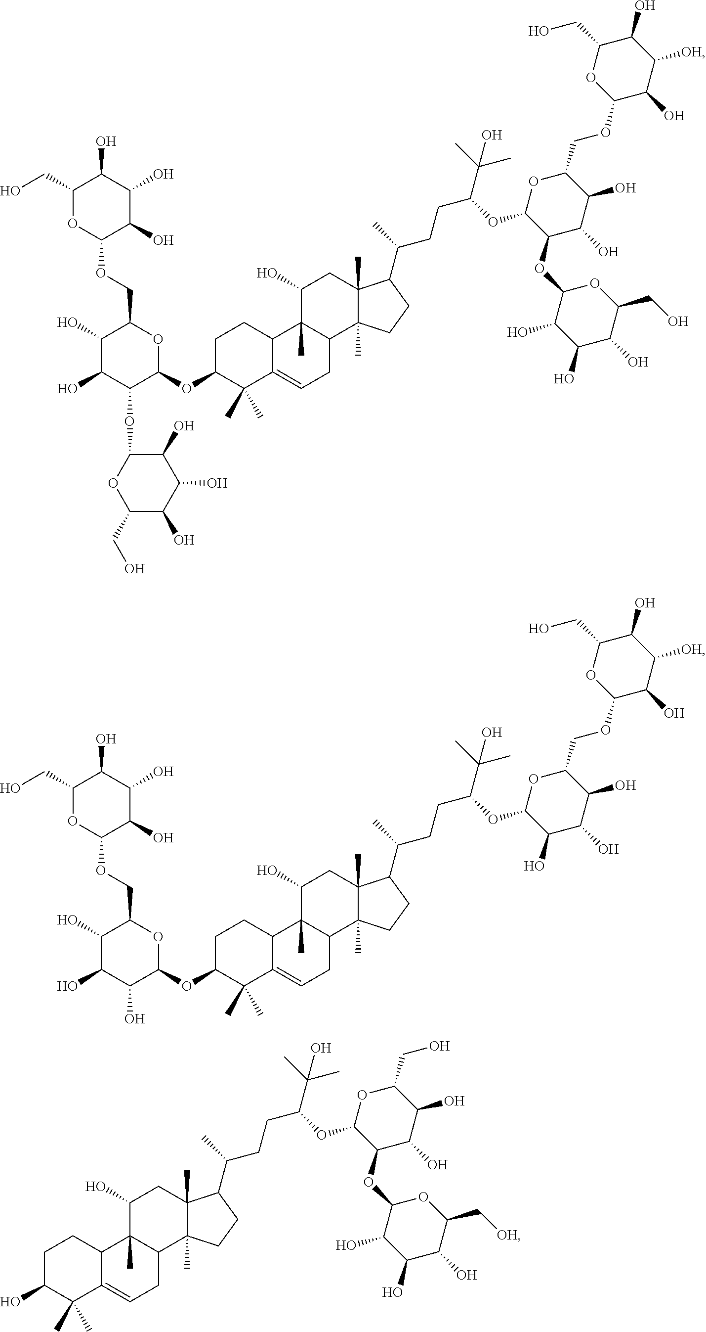 Compound 34:1H NMR (400 MHz, Pyridine-d5+D2O), selected signals: δ 5.62 (d, J=6.0 Hz, 1H), 5.24 (d, J=7.8 Hz, 1H), 5.01 (d, J=7.8, Hz, 2H), 3.85 (dt, J=6.3, 3.4 Hz, 1H), 3.70 (d, J=2.9 Hz, 1H), 1.44 (s, 3H), 1.39 (brs, 6H), 1.33 (s, 3H), 1.17 (s, 3H), 1.02 (d, J=6.4 Hz, 3H), 0.89 (s, 3H), 0.84 (s, 3H);13C NMR (101 MHz, Pyridine-d5+D2O) δ 144.14, 119.11, 105.71, 105.64, 101.83, 87.86, 83.58, 82.68, 78.40, 78.06, 77.89, 77.19, 76.49, 76.22, 76.16, 75.55, 74.95, 72.41, 72.28, 71.13, 69.78, 62.45, 62.26, 61.81, 50.80, 49.71, 47.40, 43.57, 42.27, 40.85, 40.15, 36.73, 34.54, 33.96, 30.64, 28.69, 28.53, 27.31, 26.71, 26.65, 26.21, 25.89, 25.55, 24.60, 19.37, 19.03, 17.01; ESI-MS, 963.84 (MH)+, 961.85 (M−H); Molecular formula, C48H82O19.