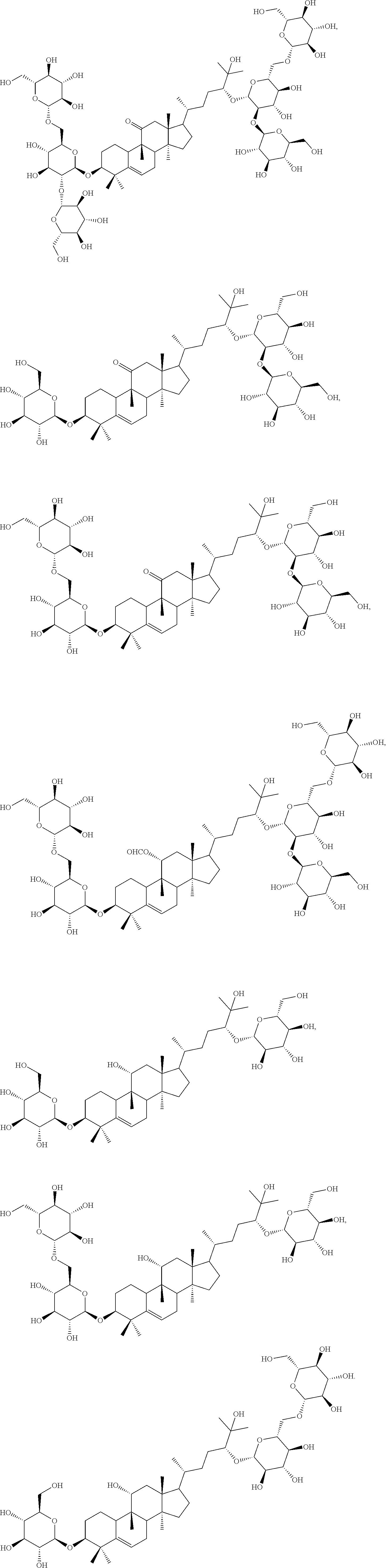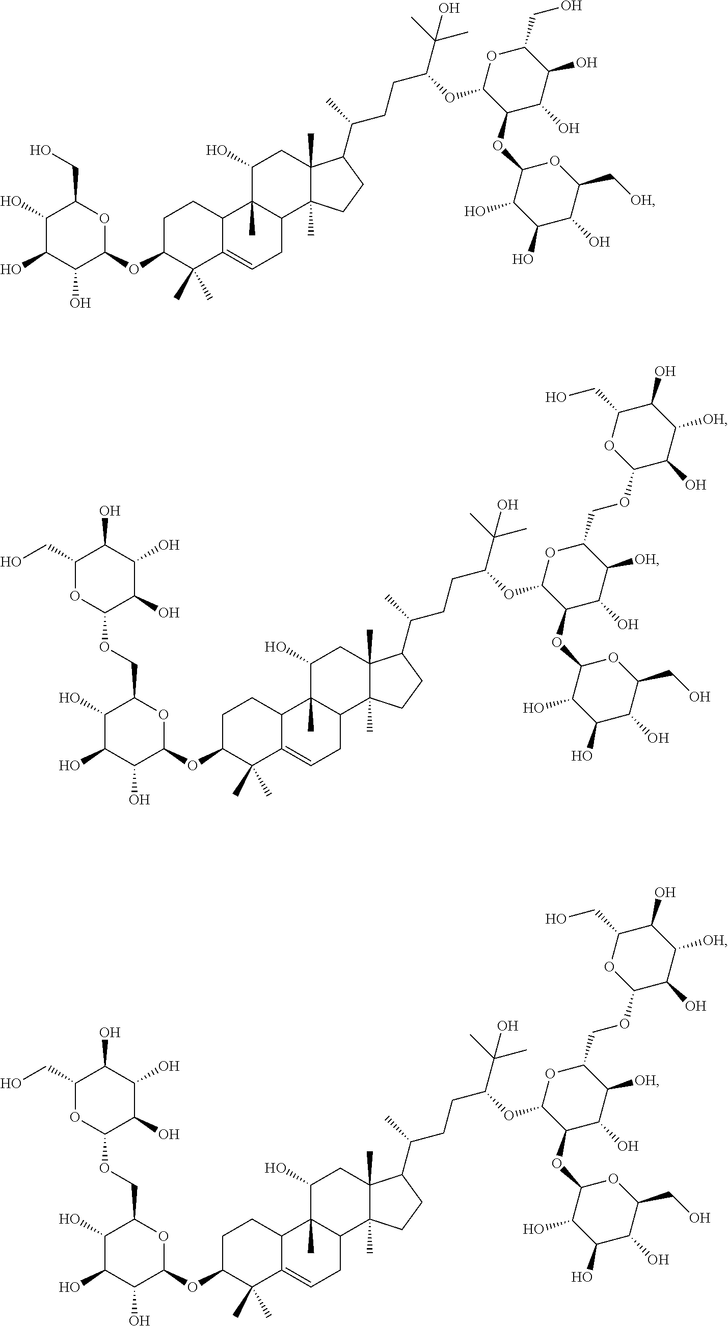 Mogroside III:1H NMR (400 MHz, Pyridine-d5+D2O), selected signals: δ 5.45 (m, 1H, 6-H, merged with HDO), 5.11 (d, J=7.8 Hz, 1H, G3-1H), 4.95 (d, J=7.8 Hz, 1H, G1-1H), 4.78 (d, J=7.8 Hz, 1H, G2-1H), 3.85 (1H, m, 24-H), 3.68 (d, J=2.8 Hz, 1H, 3-H), 1.47 (s, 3H, 28-Me), 1.41 (s, 3H, 26-Me), 1.37 (s, 3H, 27-Me), 1.29 (s, 3H, 19-Me), 1.08 (s, 3H, 29-Me), 0.93 (d, J=6.3 Hz, 3H, 21-Me), 0.84 (s, 2H, 30-Me), 0.77 (s, 3H, 18-Me); ESI-MS, 963.84 (MH)+, 961.92 (M−H); Molecular formula, C48H82O19.