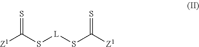 In some embodiments, the dithioester compounds may comprise molecules of the Formula (II): wherein