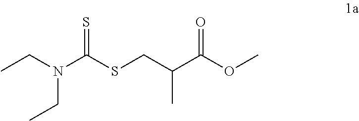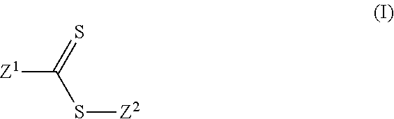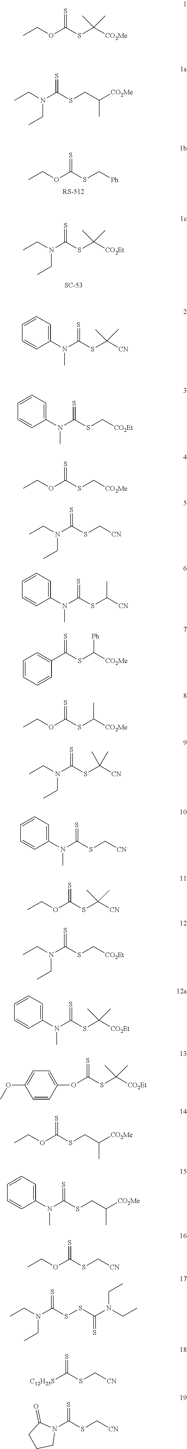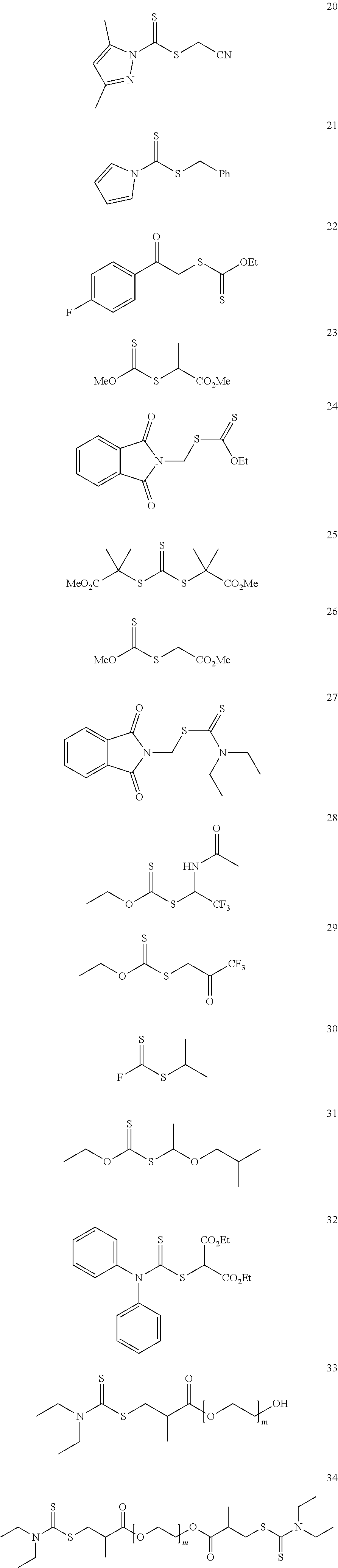 In certain embodiments, Z2 may be a carbon chain, e.g., alkyl, haloalkyl, aryl, alkenyl, alkynyl, a polymeric moiety having a carbon chain or an oligomeric moiety having a carbon chain. In certain embodiments, Z1 may be an electron donating group, e.g., heteroaryl, heteroalicyclic, hydroxyl, alkoxy, aryloxy, heteroaryloxy, NR1R2, thiol, arylthiol, alkylthiol, heteroarylthiol, a polymeric moiety with an electron donating group or an oligomeric moiety with an electron donating group. In some embodiments, the dithioester compounds may comprise molecules of the Formula (Ia), (Iai), (Ic) or any combination thereof: wherein