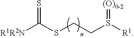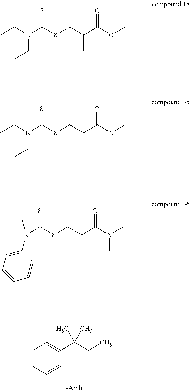 In some embodiments, non-limiting examples of dithioester compounds include the following: wherein