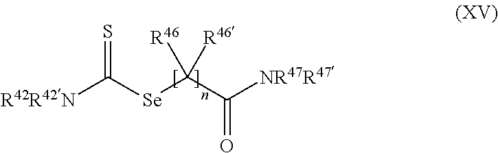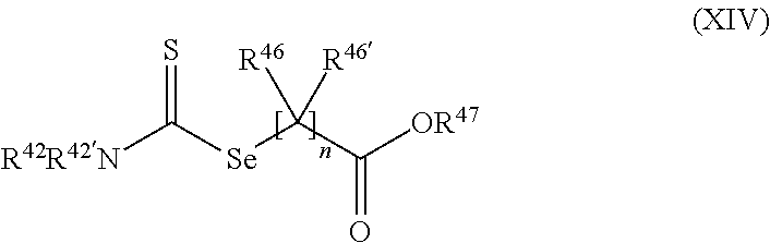 In certain embodiments, Z4 may be alkyl, haloalkyl, aryl, alkenyl, alkynyl, a polymeric moiety having a carbon chain or an oligomeric moiety having a carbon chain. In certain embodiments, Z4 may be heteroaryl, heteroalicyclic, hydroxyl, alkoxy, aryloxy, heteroaryloxy, NR1R2, thiol, arylthiol, alkylthiol, heteroarylthiol, a polymeric moiety with an electron donating group or an oligomeric moiety with an electron donating group. In certain embodiments, Z4 may be NR44R44′. In certain embodiments, Z5 may be alkyl, haloalkyl, benzyl, aryl, cycloalkyl, alkenyl, alkynyl, a polymeric moiety having a carbon chain or an oligomeric moiety having a carbon chain. In some embodiments, the dithioester, selenothioester and/or thioselenoester compounds as described hereinabove may be added or replaced by molecules of the Formula (XIV): wherein