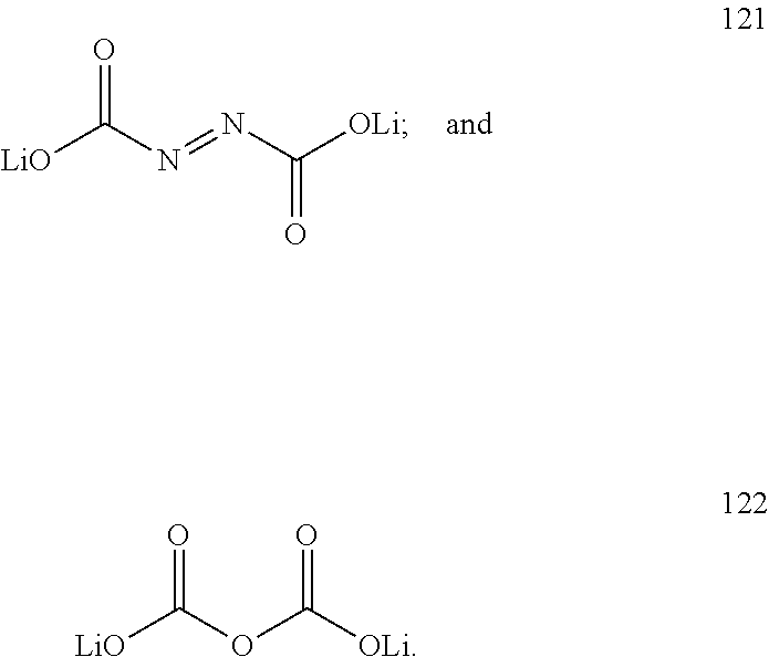 Comparison of performance with different additives Electrolyte Average Cycle life Baseline 171 With additive 12a 302 With additive 1b 265 With additive 9 234 With additive 11 215 With additive 2 274 With additive 3 218 With additive 57 217 With additive 15 215 With additive 18 260 With additive 35 320 With additive 59 290 With both additives, 35 and 59 339 Wherein
