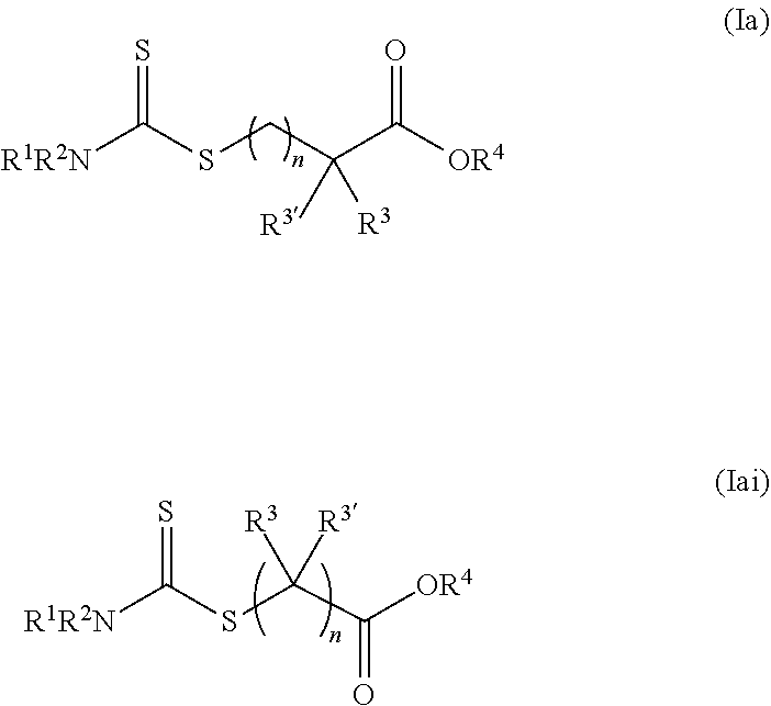 In some embodiments, the dithioester compounds may comprise molecules of the Formula (IIa): wherein