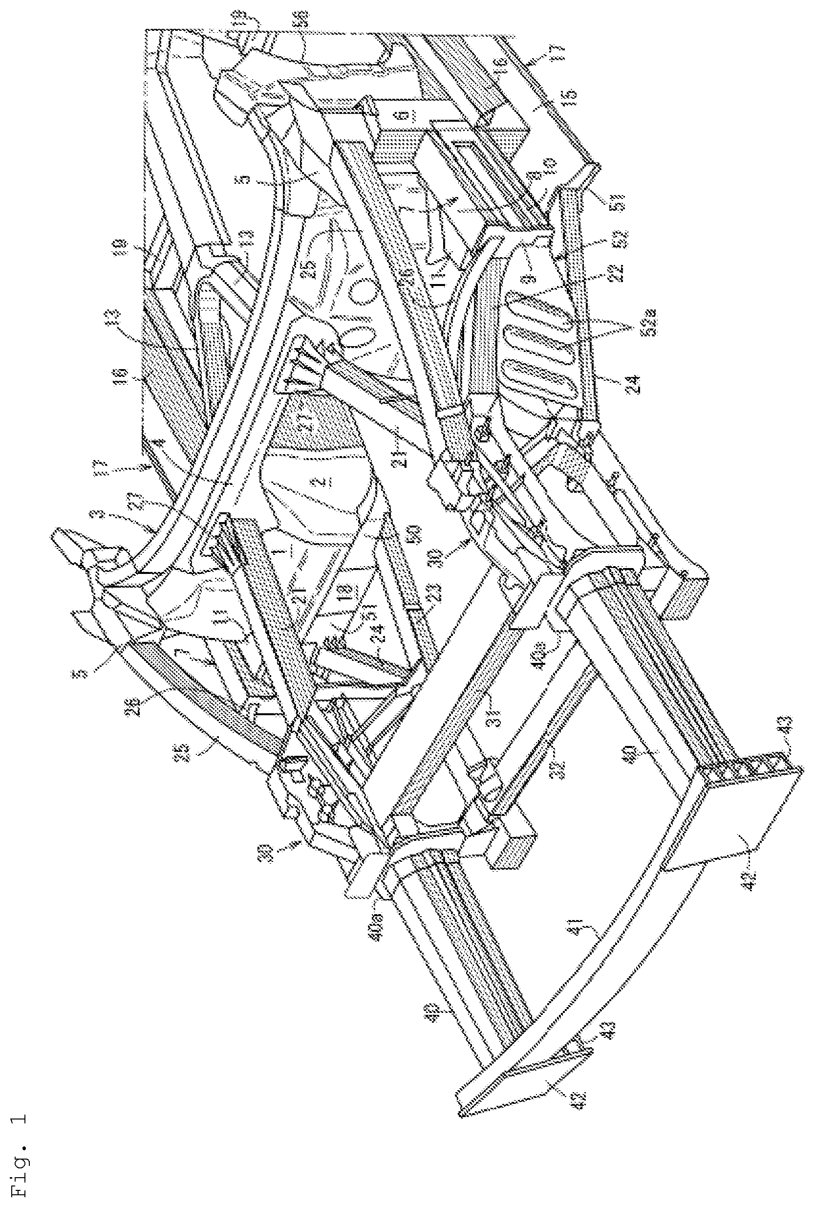 As shown in FIGS. 7 and 8, the upper inner frame 21, the upper outer frame 22, the lower inner frame 23, and the lower outer frame 24 are each formed of an aluminum alloy extruded member and shaped into a hollow rectangular pipe. This configuration reduces weight of the frames 21-24 while ensuring effective load transmission by the upper and lower truss structures.