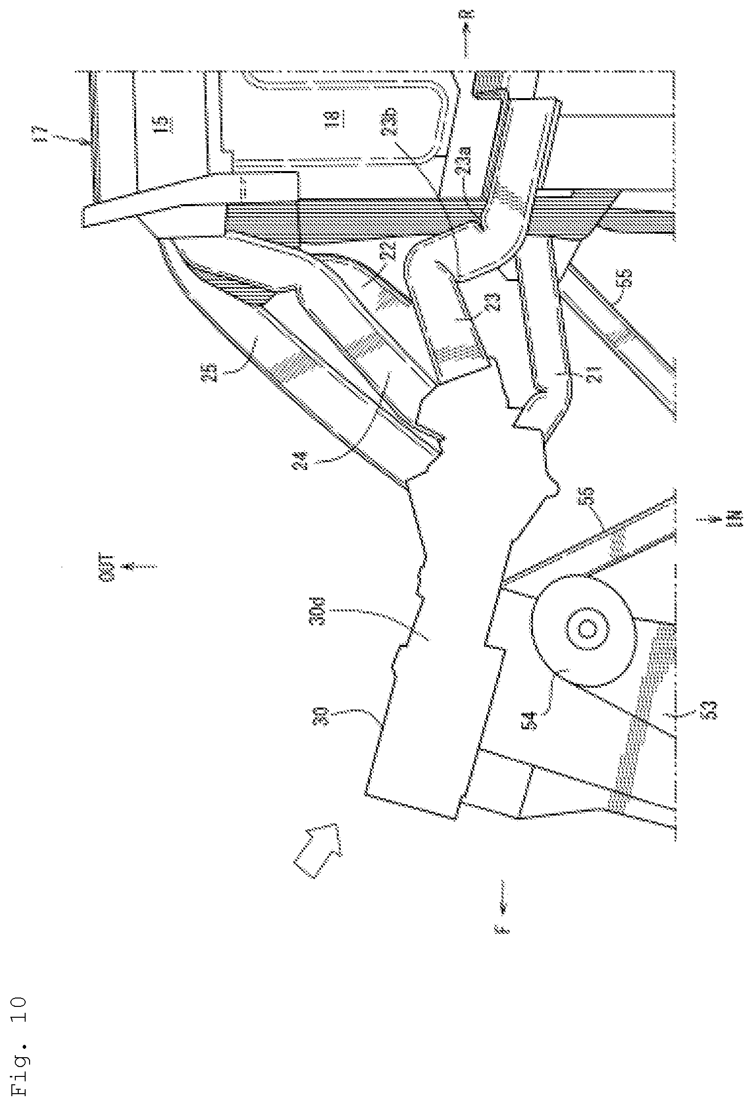 FIG. 10 is a bottom view showing a breakage state of each frame in the event of an oblique collision.