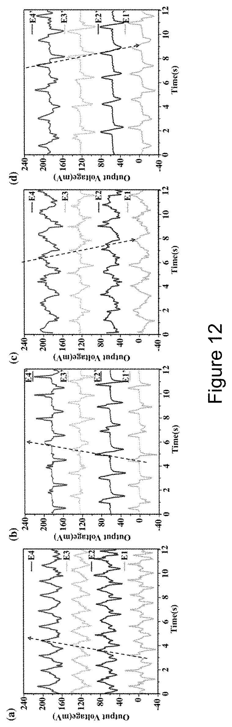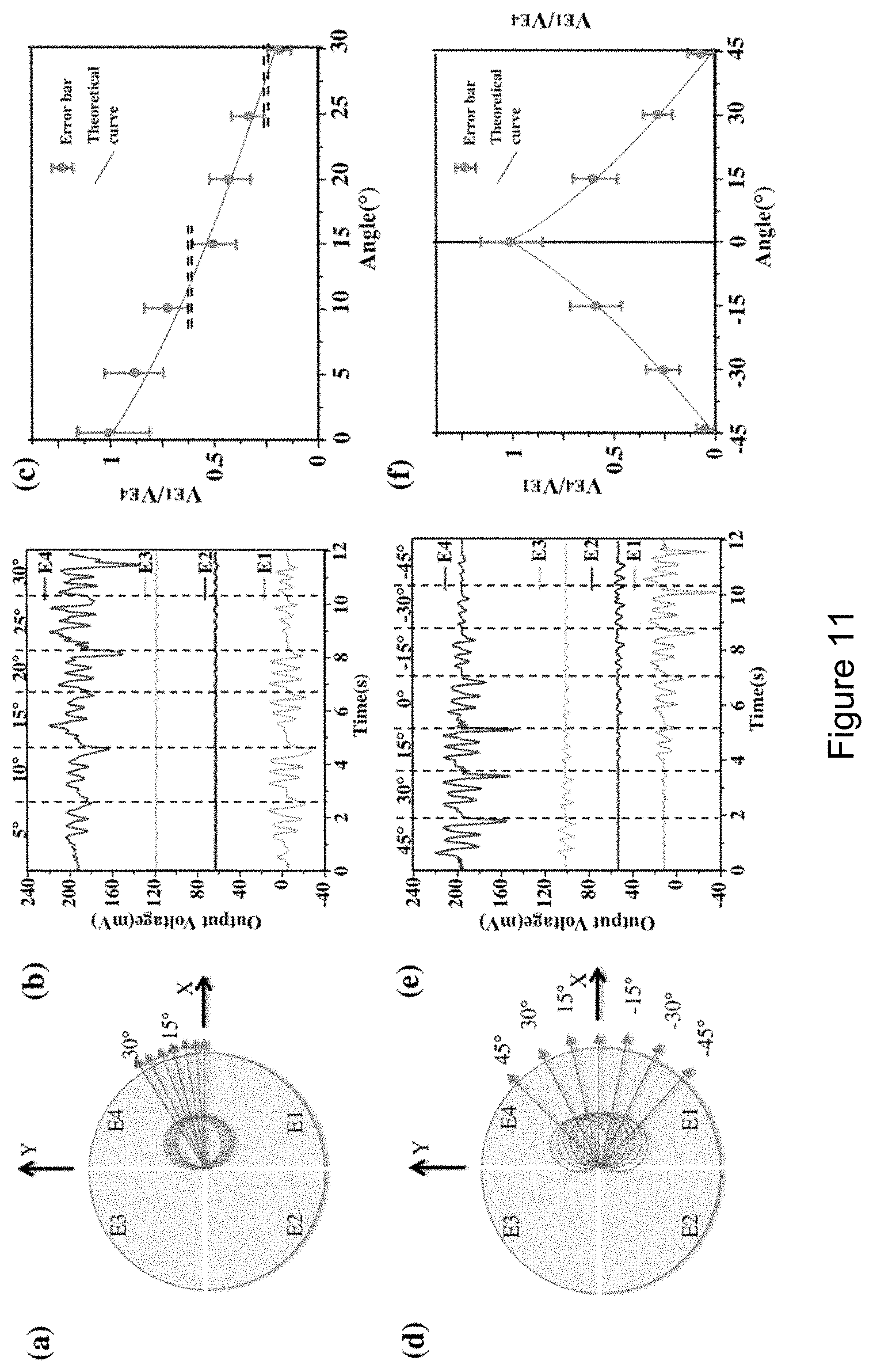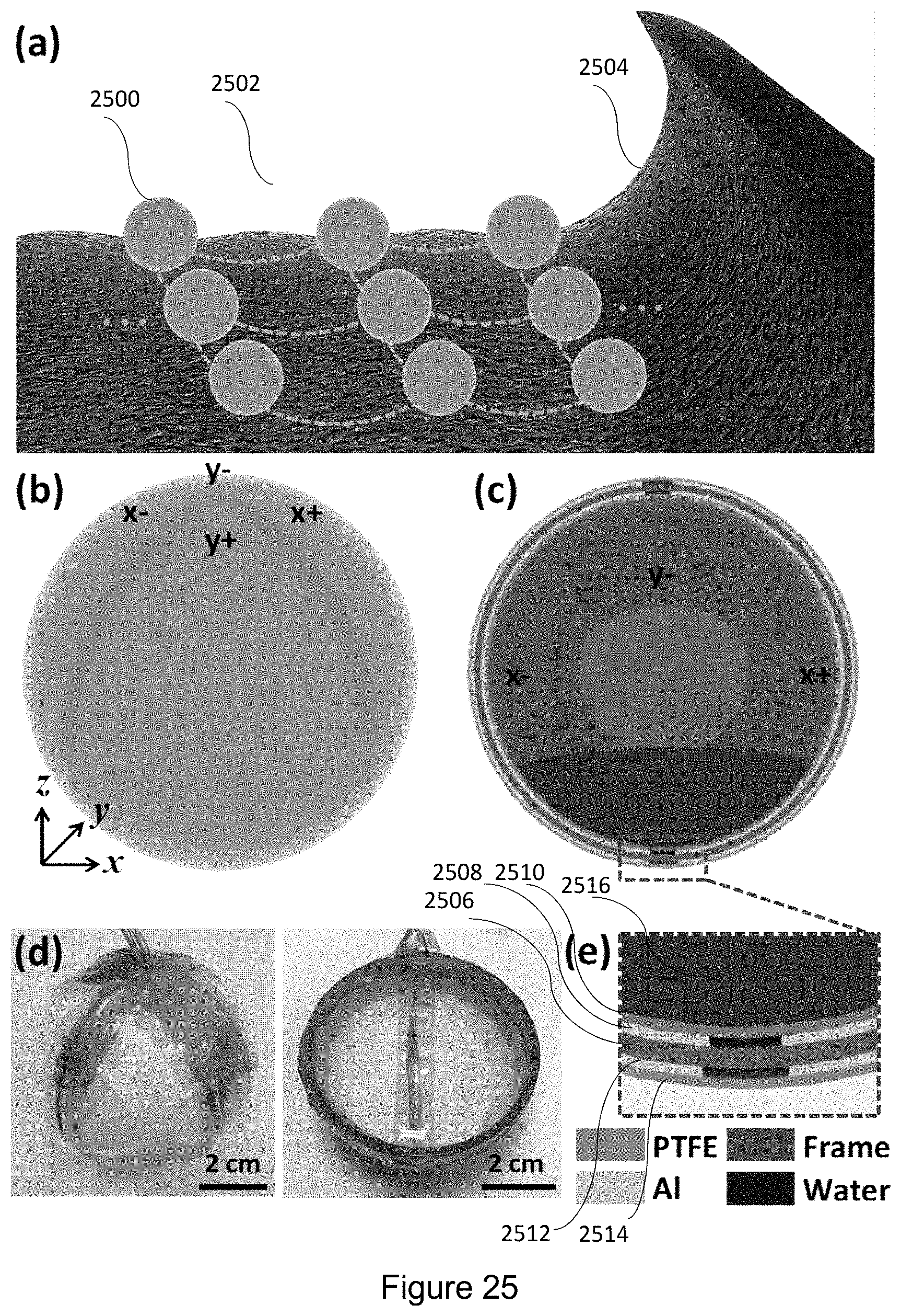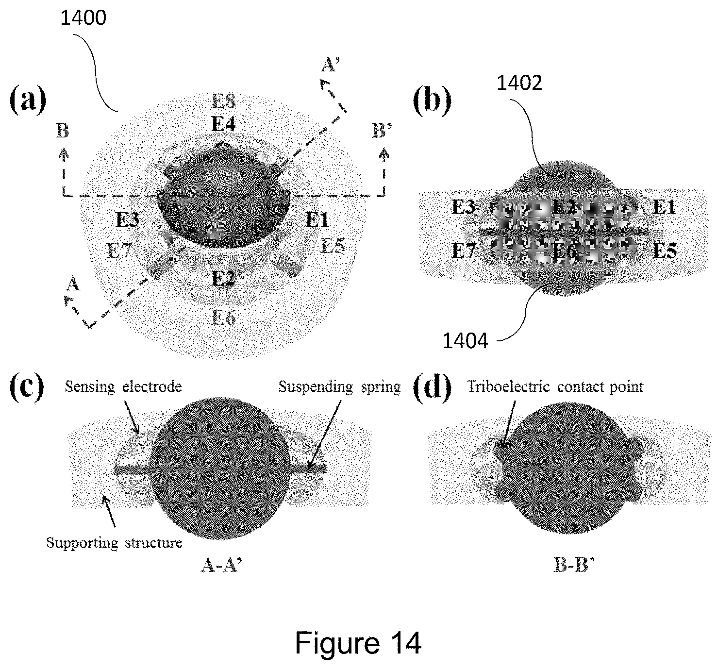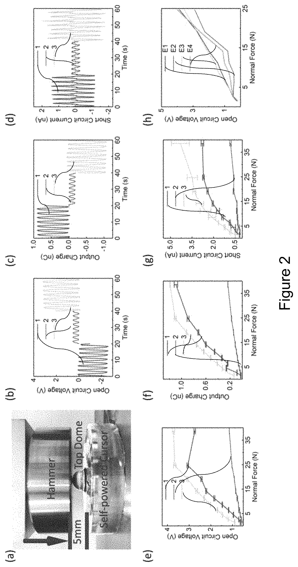 In accordance with a third aspect of the present invention there is provided a user interface comprising the device of the first or second aspects. In accordance with a fourth aspect of the present invention there is provided a method of providing user input using the device of the first or second aspects. In accordance with a fifth aspect of the present invention there is provided a energy harvesting device comprising the device of the second aspect. In accordance with a sixth aspect of the present invention there is provided a method of harvesting energy using the device of the second aspect. In accordance with a seventh aspect of the present invention there is provided a submersion-detecting device comprising the device of the second aspect. In accordance with an eighth aspect of the present invention there is provided a method of submersion-detecting using the device of the second aspect. Some embodiments of the present invention provide a 2D sensor with detail analysis on working mechanism according to the electric field theory and characterization of the device for normal force and shear force detecting. The self-powered 2D sensor according to example embodiments has the capability of detecting not only the normal force but also the shear force directions. For normal force sensing, it has a linear range of 0-25 N according to an example embodiment. The open circuit voltage, output charge and short circuit current sensitivity is 0.131 V N−1, 0.048 nC N−1 and 0.175 nA N−1, respectively, according to an example embodiment. Some embodiments of the present invention provide a 3D sensor for collecting force and displacement information. The 3D sensor according to example embodiments can significantly extend the usage scenarios and applications, such as augmented reality force sensor and motion controller of object movements in 3D free space, game control and smart control, etc. Because the theoretical model is limited in 1D or 2D in previous works [A13,A16-A19], the shear force part is not able to be revealed by TENG. In example embodiments described herein, from the electric field perspective, the 3D force information is able to be characterized by the electric field variations due to force applied on the device. Besides, the flexibility of liquid metal and 3D printing structure preferably ensure that the device has a robust force detecting capability. In the aspect of shear force detection, embodiments of the present invention can resolve the shear force direction with step resolution of at least 15°. Additionally, the self-powered cursor according to an example embodiment is also able to detect the rotation motions applied on the touch point. This self-powered cursor shows significant potential in the batteryless and energy saving IoT sensor applications. Generally, some embodiments of the present invention provide a self-powered 2D and a 3D sensor based on triboelectric nanogenerator (TENG) for collecting force and displacement information. Based on the theoretical modeling, simulation and experimental characterization of the 2D sensor, a more novel 3D sensor is then proposed for 3D control. The self-powered 2D sensor according to an example embodiment is made of liquid-metal mixed with PDMS which deforms under applying force and contacts with PTFE generating the triboelectric signal to denote the force amplitude. The self-powered 2D sensor according to an example embodiment has the capability of simultaneously detecting normal force in the range of 0-25 N and shear force direction (0°-360°) for the first time. The normal force sensing is characterized by open-circuit voltage, charge and current with the sensitivity of 0.131 V N−1, 0.048 nC N−1 and 0.175 nA N−1, respectively, according to an example embodiment. The shear force direction detecting can achieve a resolution of 15°. Because of the positive output voltage and low internal impedance, the self-powered sensor according to an example embodiment is readily compatible with commercial portable circuits without the requirement of specified bulky high-impedance instruments to detect the output voltage. Demonstration of the self-powered sensor as triggering signal to drive a small vehicle is successfully realized by directly detecting the output voltage without any periphery signal processing circuits. The 2D sensor according to an example embodiment can be used to control the in-plane movement of an object. In an example embodiment, a 3D sensor is provided that can be used to control the movement of an object in free space, not limited to only in-plane space. This 3D sensor according to an example embodiment significantly widens the application to ever large area, such as augmented reality control, game control, smart control, etc. Based on the electrical field theory of TENG, the working mechanism of the self-powered cursor according to an example embodiment under normal force is explained in As shown in the sketch, the self-powered cursor 100 consists of top semisphere touch point 102, bottom functional semisphere 104, polytetrafluoroethylene (PTFE) thin film 106, aluminum electrode 108, and supporting structure (not shown). The bottom semisphere 104 is made by mixing galinstan (eutectic alloy of 68.5% gallium, 21.5% indium, and 10% tin by weight) with PDMS in one non-limiting example embodiment. The galinstan-PDMS mixture functions as one triboelectric layer and conductive material during the pressing period as Fassler and Majidi uncovered [A25]. Because of the work function difference between galinstan and PTFE [A26,A27], negative charges will transfer from galinstan surface to PTFE when they contact with each other. Then, galinstan holds net positive charge and PTFE surface carries net negative charge, as illustrated in where e is the charge of an electron, Ds is the number of surface states per unit area and unit energy, Wm and Wp are the work functions for the metal gallium and PTFE, E1 and E2 are the modulu