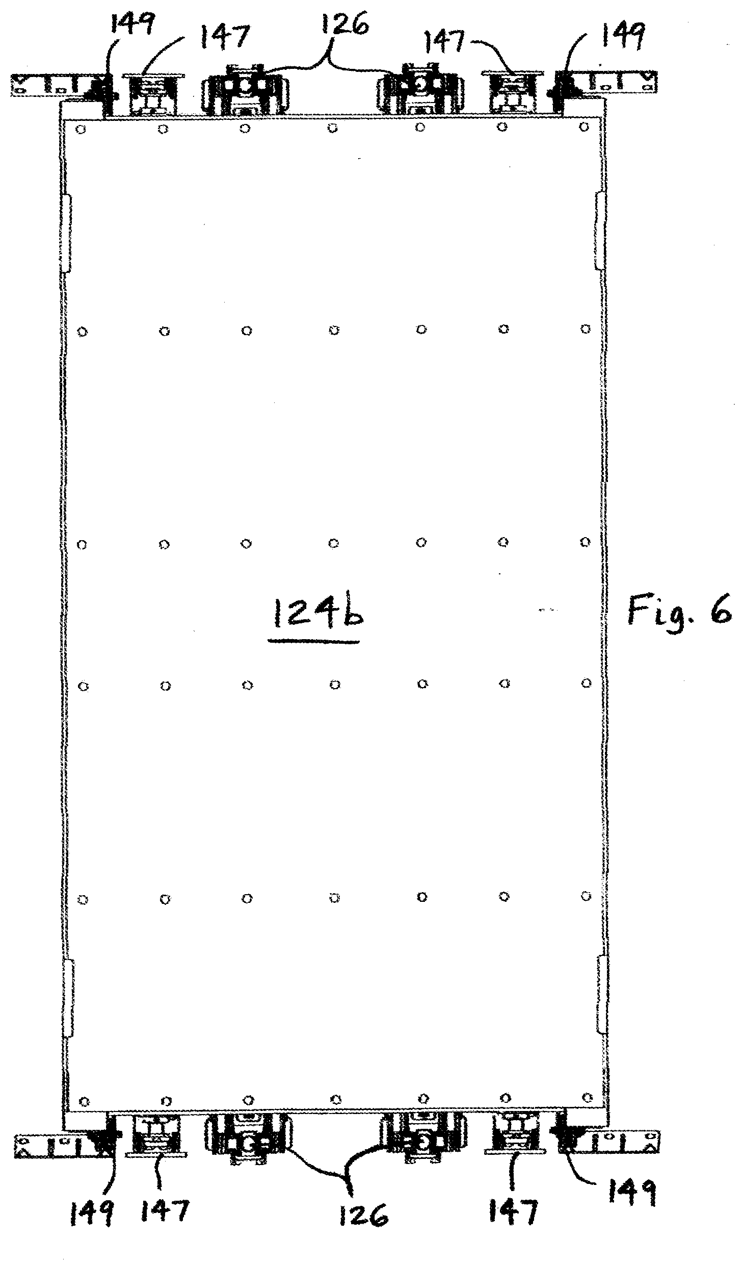 FIG. 7 illustrates the righthand side of the middle platform 124b and associated lifting mechanisms 126 of FIG. 6. Also visible in FIG. 7 are platform locking mechanisms 147 and platform guide roller mechanisms 149.