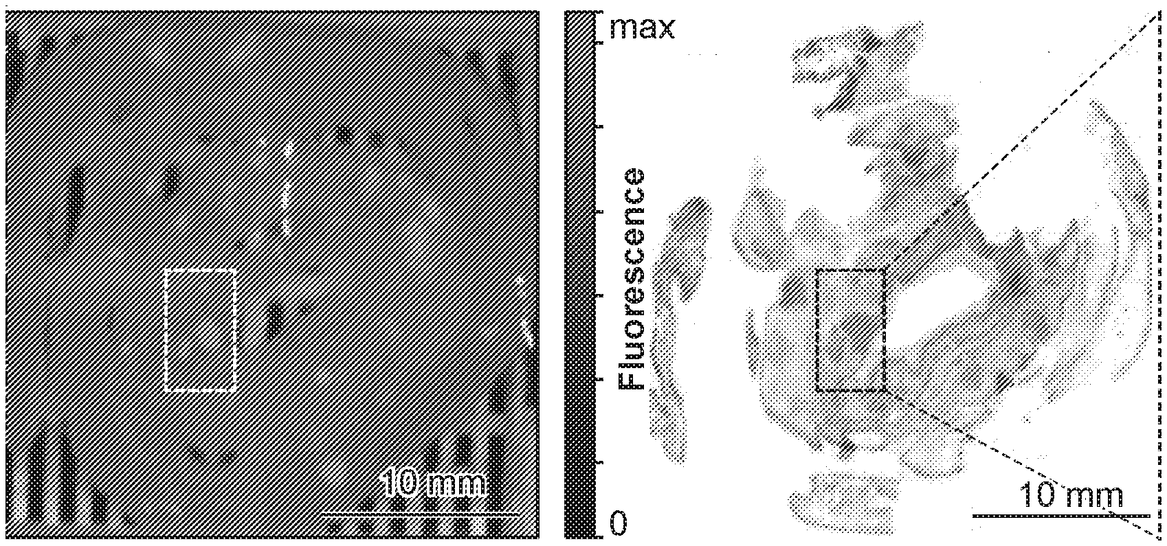 Endoscopic detection of adenomas in APC1311/+ pigs. All experiments involving the APC1311/+ pigs were performed in Germany. Sedated male APC1311/+ pigs (18-21 months old; n=2) were injected intravenously with the FSNs (30 pmol/kg) via a preplaced catheter into ear vein. The next day, the pigs were anesthetized by intramuscular (i.m.). injection of ketamine (20 mg/kg body weight) and azaperone (2 mg/kg body weight) and fluorescence-guided endoscopy was performed using a custom-built combined NIRF/WL endoscopy system equipped with a 670-nm laser and a ViZaar fiberscope (A250L2000; For detailed information see FIG. 5). The animals that were euthanized were first sedated by i.m. administration of ketamine (20 mg/kg body weight) and azaperone (2 mg/kg body weight), rendered unconscious by a nonpenetrating captive bolt gun applied to the forehead and then immediately exsanguinated. Liver, spleen, kidney, colorectal tissues and muscle were harvested. The freshly resected colorectal tissues were randomly cut in sections of approximately 15 cm in length. All tissues were fixed in 10% neutral-buffered formalin. The fixed tissue sections were imaged on a Pearl Trilogy NIRF imaging system and processed for paraffin-embedding and H&E staining.