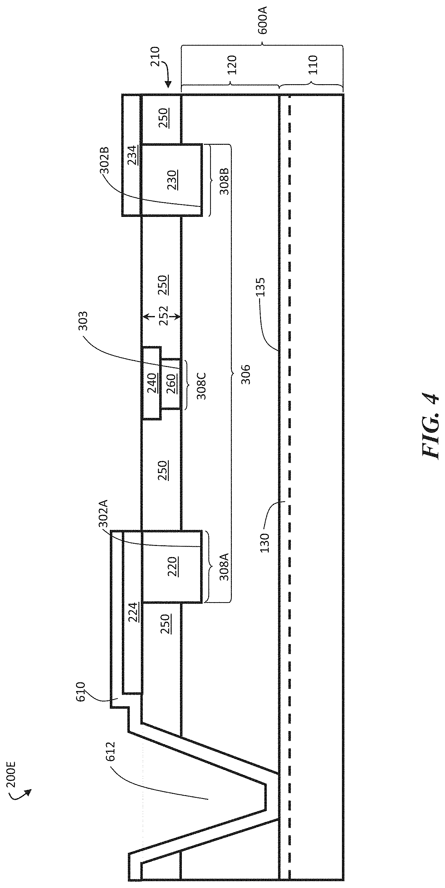 FIG. 4 is a cross-sectional schematic illustration of a semiconductor device comprising an electronically conductive material coupled to a contact pad and a substrate, according to certain embodiments. As shown in FIG. 4, semiconductor structure 600A comprises substrate 110 and III-nitride material region 120 over substrate 110. Also shown in FIG. 4 is electronically conductive material 610, which has been deposited within cavity 612 formed in the device.