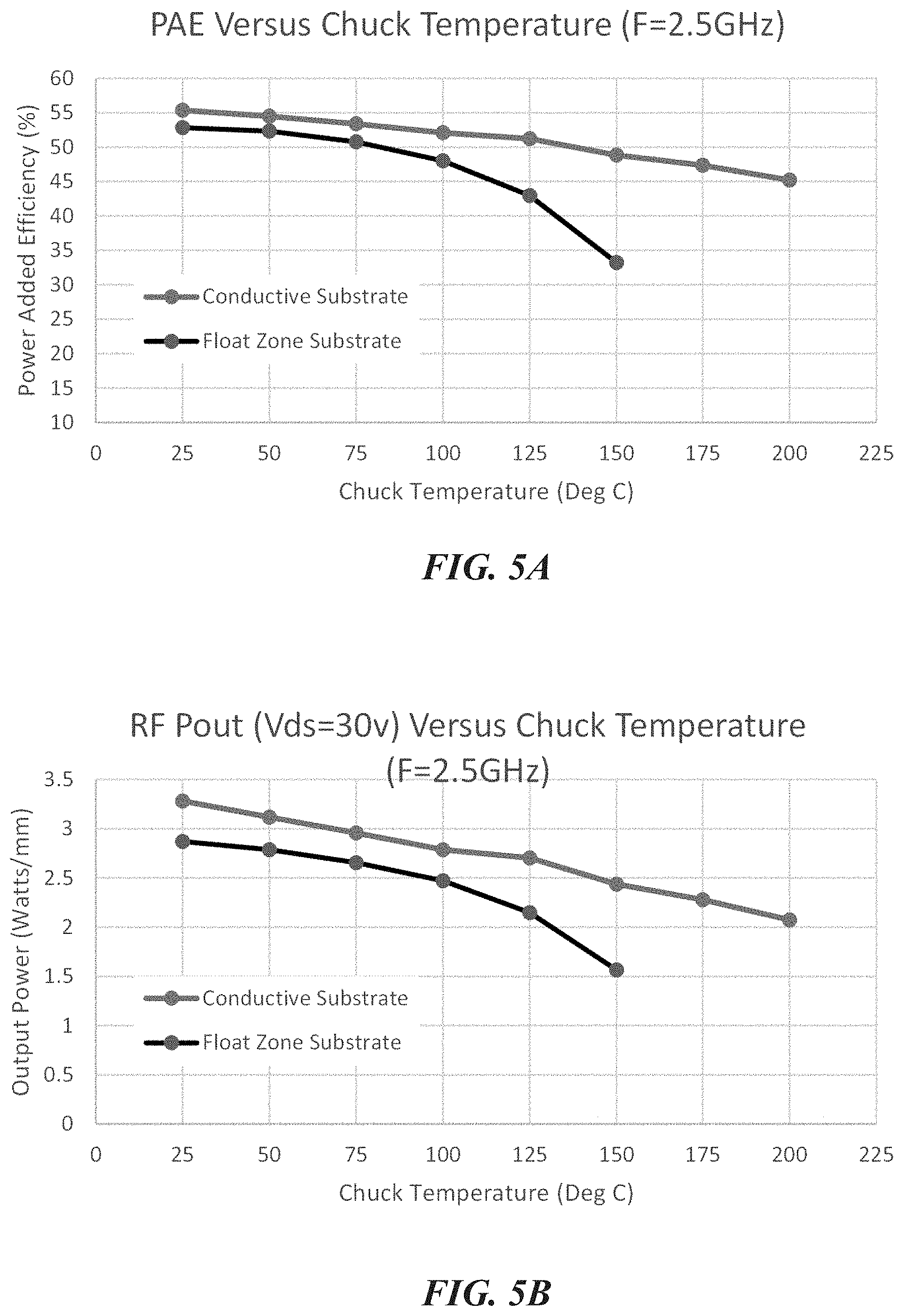 Example results from fabricated devices and simulations are described in this section. FIG. 5A shows measured power-added efficiency (PAE) at 2.5 GHz for two GaN-on-silicon high-electron mobility transistors (HEMTs) versus measured temperature of the silicon substrate. One GaN HEMT transistor was manufactured on a 625 μm thick highly conductive (0.02 Ω-cm i.e. conductive) silicon substrate and the other was manufactured on a 625 μm thick highly resistive (10,000 Ω-cm i.e. float-zone) silicon substrate. The transistor using a highly conductive substrate (upper trace) shows improved power added efficiency at all temperatures and particularly at elevated substrate temperatures compared to the HEMT formed on the highly resistive substrate.