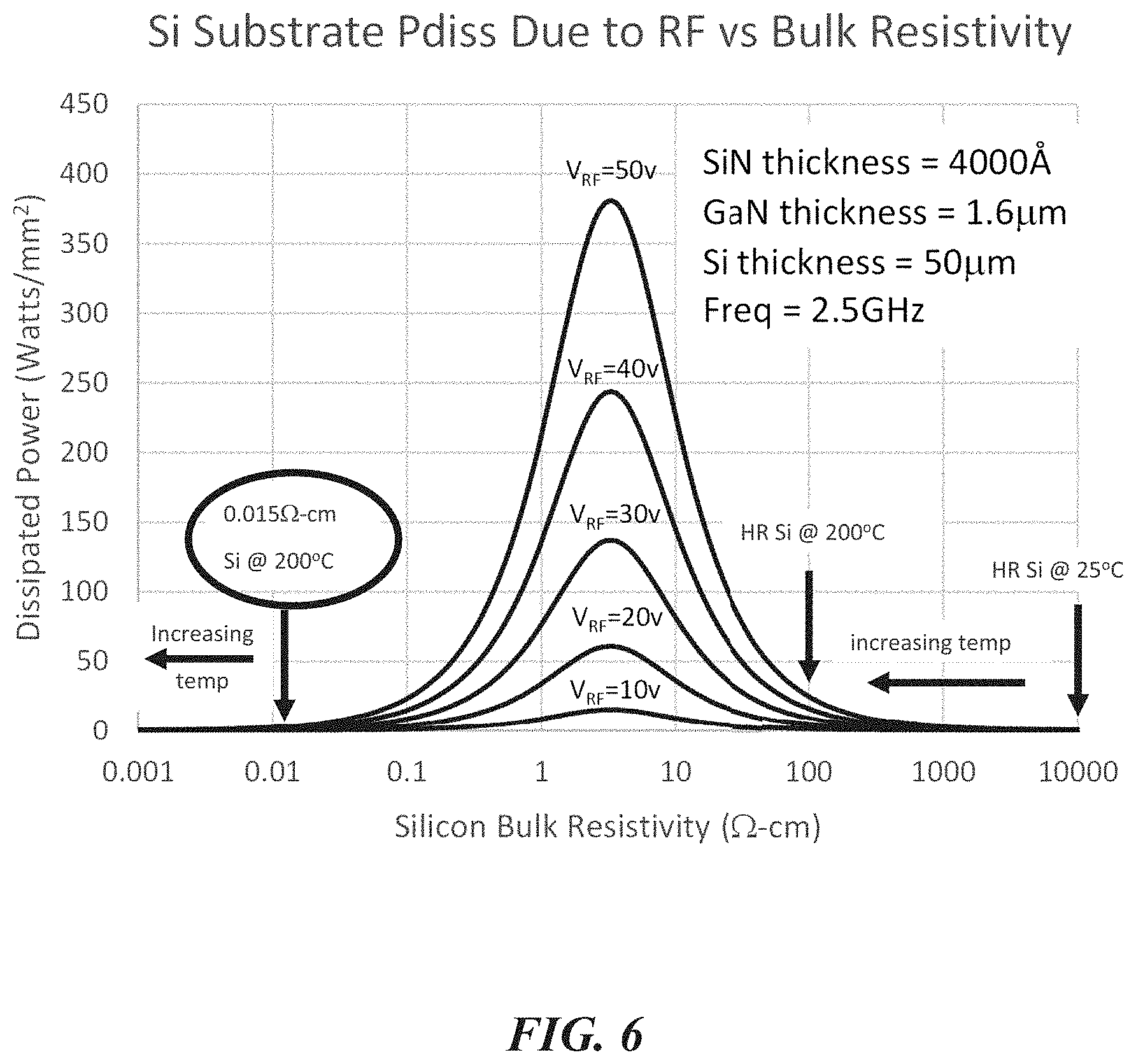 As can be seen, for a 50 volt signal, the power dissipated in the highly resistive silicon at 180° C. substrate temperature is about 1.0 Watt/mm and essentially zero for the highly conductive silicon substrate. In embodiments, a GaN-on-silicon HEMT transistor can output about 7.0 Watts/mm (gate peripheral length) RF output power at 2.5 GHz with a drain-to-source bias VDS of 50 volts. Accordingly, 1.0 Watt/mm dissipation into the substrate will dramatically degrade both output power capability of the transistor (e.g., reduced to about 6.0 Watts/mm) as well as degrade device efficiency and increase the transistor junction temperature due to substrate heating.