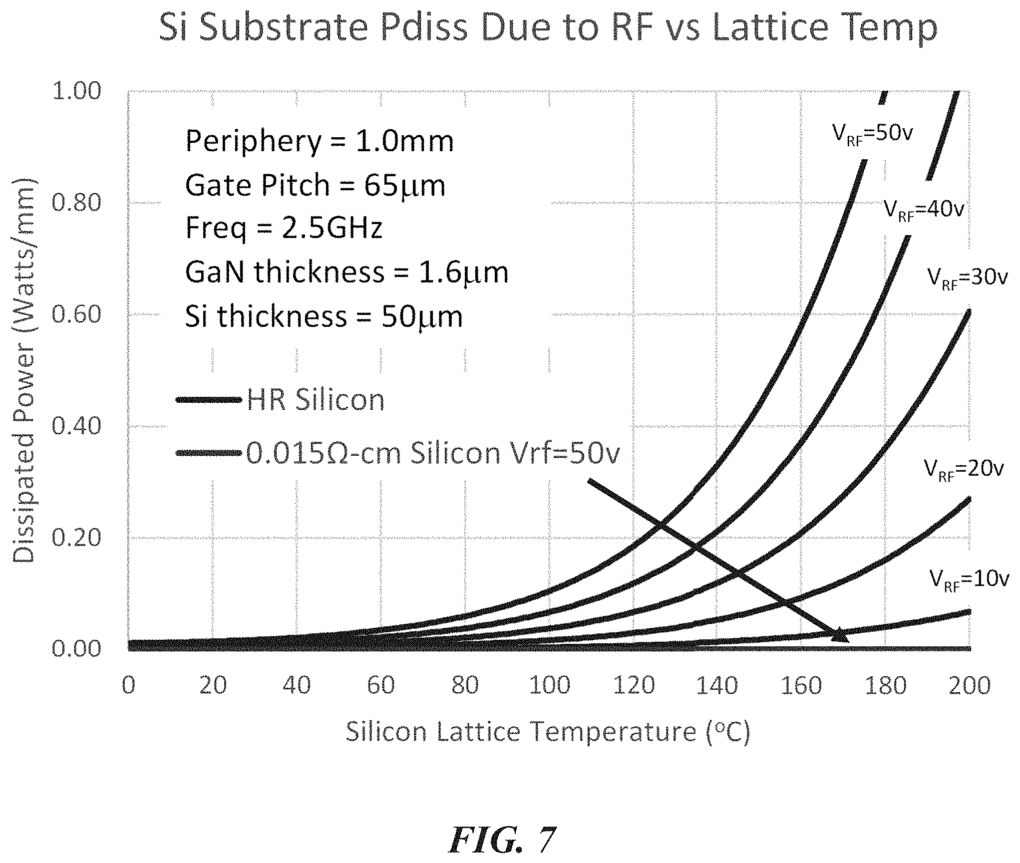 FIG. 7 plots simulated power dissipation in a silicon substrate for a 1 mm gate peripheral length GaN-on-silicon HEMT transistor versus the silicon substrate temperature for five 2.5 GHz sinusoidal RF signals (ranging from 10 volts to 50 volts peak-to-peak) that are applied between the transistor's drain and source contacts. The simulation uses a silicon substrate thickness of 50 μm (10,000 Ω-cm bulk resistivity), gate-to-gate pitch of 65 μm, and total GaN layer thickness of 1.6 μm for the transistor to calculate capacitive coupling to the substrate. Also plotted on the same graph are simulation results at 50 volts peak-to-peak for a same structure that instead has a highly conductive substrate (0.015 Ω-cm bulk resistivity).