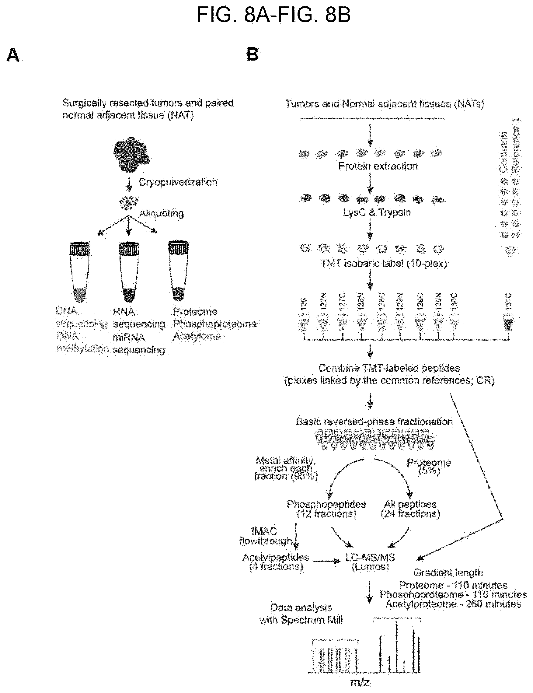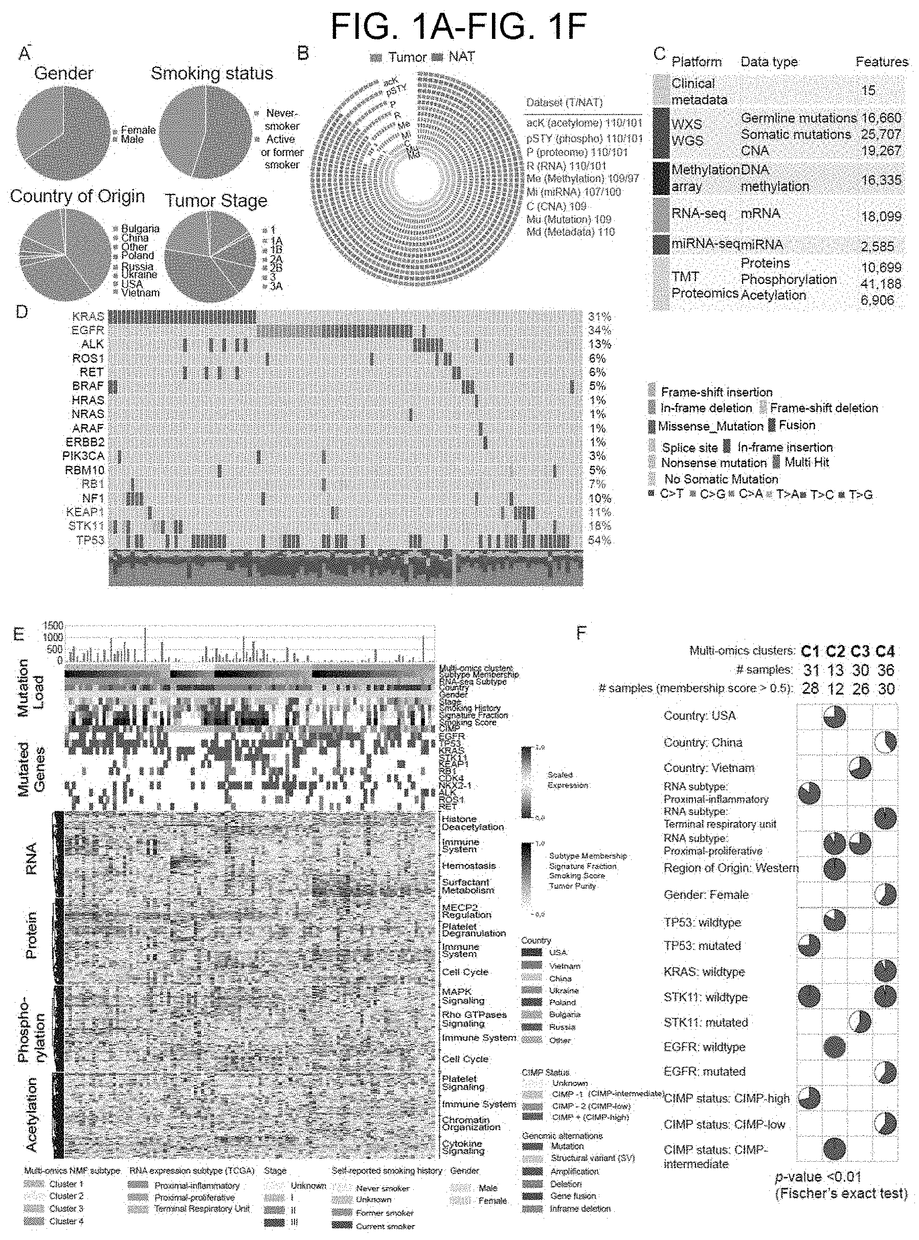 Each gene of every sample is assigned a thresholded copy number level that reflects the magnitude of its deletion or amplification. These are integer values ranging from −2 to 2, where 0 means no amplification or deletion of magnitude greater than the threshold parameters described above. Amplifications are represented by positive numbers: 1 means amplification above the amplification threshold; 2 means amplification larger than the arm level amplifications observed in the sample. Deletions are represented by negative numbers: −1 means deletion beyond the threshold; −2 means deletions greater than the minimum arm-level copy number observed in the sample. The somatic variants were filtered through a panel of normals to remove potential sequencing artifacts and undetected germline variants. MutSig2CV (Lawrence et al. 2014) was run on these filtered results to evaluate the significance of mutated genes and estimate mutation densities of samples. These results were constrained to genes in the Cancer Gene Census (Sondka et al. 2018), with false discovery rates (q values) recalculated. Genes of q value <0.1 were declared significant. RNA Quantification and Analysis RNA Quantification Transcriptome data have been analyzed as described previously (Robinson et al., 2017), using the Clinical RNA-seq Pipeline (CRISP) developed at the University of Michigan (https://github.com/mcieslik-mctp/crisp-build). Briefly, raw sequencing data was trimmed, merged using BBMap, and aligned to GRCh38 using STAR. The resulting BAM files were analyzed for expression using feature counts against a transcriptomic reference based on Gencode 26. The resulting gene-level counts for protein-coding genes were upper-quartile normalized and transformed into RPKMs using edgeR and further log 2 transformed. Genes quantified in fewer than 30% of all samples were removed from the data matrix. Data rows of redundant gene symbols were aggregated by calculating the average log 2(RPKM). For integrative multi-omics subtyping we normalized each gene by the median log 2(RPKM) across all tumors (gene-centering) and applied the same per-sample normalization strategy used to normalize proteomics data tables (see below: Two-component normalization of TMT ratio distributions). miRNA-Seq Data Analysis and Unsupervised Clustering miRNA-seq FASTQ files were downloaded from CPTAC GDC API (https://docs.gdc.cancer.gov). TPM (Transcripts per million) values of mature miRNA and precursor miRNA were reported after adapter trimming, quality check, alignment, annotation, reads counting. (https://github.com/ding-lab/CPTAC_miRNA/blob/master/cptac_mima_analysis.md). The mature miRNA expression was calculated irrespective of its gene of origin by summing the expression from its precursor miRNAs. Unsupervised miRNA expression subtype identification was performed on mature miRNAs expression (log 2 TPM) from 106 LUAD patients using Louvain clustering. (https://doi.org/10.5281/zenodo.595481). The expression of top 50 differentially expressed miRNAs from each miRNA-based subtype was shown in the heatmap. For consistency, miRNA expression, RNA expression and protein expression were scaled to 0-1. Proteomics Data Analysis: Protein-Peptide Identification, Phosphosite/Acetyl Site Localization, and Quantification Spectrum Quality Filtering and Database Searching All MS data were interpreted using the Spectrum Mill software package v7.0 pre-release (Agilent Technologies, Santa Clara, Calif.) co-developed by Karl Clauser of the Carr laboratory (https://www.broadinstitute.org/proteomics). Similar MS/MS spectra acquired on the same precursor m/z within +/−45 sec were merged. MS/MS spectra were excluded from searching if they failed the quality filter by not having a sequence tag length >0 (i.e., minimum of two masses separated by the in-chain mass of an amino acid) or did not have a precursor MH+ in the range of 800-6000. MS/MS spectra were searched against a RefSeq-based sequence database containing 41,457 proteins mapped to the human reference genome (hg38) obtained via the UCSC Table Browser (https://genome.ucsc.edu/cgi-bin/hgTables) on Jun. 29, 2018, with the addition of 13 proteins encoded in the human mitochondrial genome, 264 common laboratory contaminant proteins, and 553 non-canonical small open reading frames. Scoring parameters were ESI-QEXACTIVE-HCD-v2, for whole proteome datasets, and ESI-QEXACTIVE-HCD-v3, for phosphoproteome datasets. All spectra were allowed +/−20 ppm mass tolerance for precursor and product ions, 30% minimum matched peak intensity, and “trypsin allow P” enzyme specificity with up to 4 missed cleavages. Allowed fixed modifications included carbamidomethylation of cysteine and selenocysteine. TMT labeling was required at lysine, but peptide N-termini were allowed to be either labeled or unlabeled. Allowed variable modifications for whole proteome datasets were acetylation of protein N-termini, oxidized methionine, deamidation of asparagine, hydroxylation of proline in PG motifs, pyro-glutamic acid at peptide N-terminal glutamine, and pyro-carbamidomethylation at peptide N-terminal cysteine with a precursor MH+ shift range of −18 to 97 Da. For the phosphoproteome dataset the allowed variable modifications were revised to allow phosphorylation of serine, threonine, and tyrosine, allow deamidation only in NG motifs, and disallow hydroxylation of proline with a precursor MH+ shift range of −18 to 272 Da. For the acetylome dataset the allowed variable modifications were revised to allow acetylation of lysine, allow deamidation only in NG motifs, and disallow hydroxylation of proline with a precursor MH+ shift range of −400 to 70 Da. PSM Quality Filtering, Protein Grouping, and Localization of Phosphosites and Acetylsites Identities interpreted for individual spectra were automatically designated as confidently assigned using the Spectrum Mill autovalidation module to use target-decoy based false discovery rate (FDR) estima