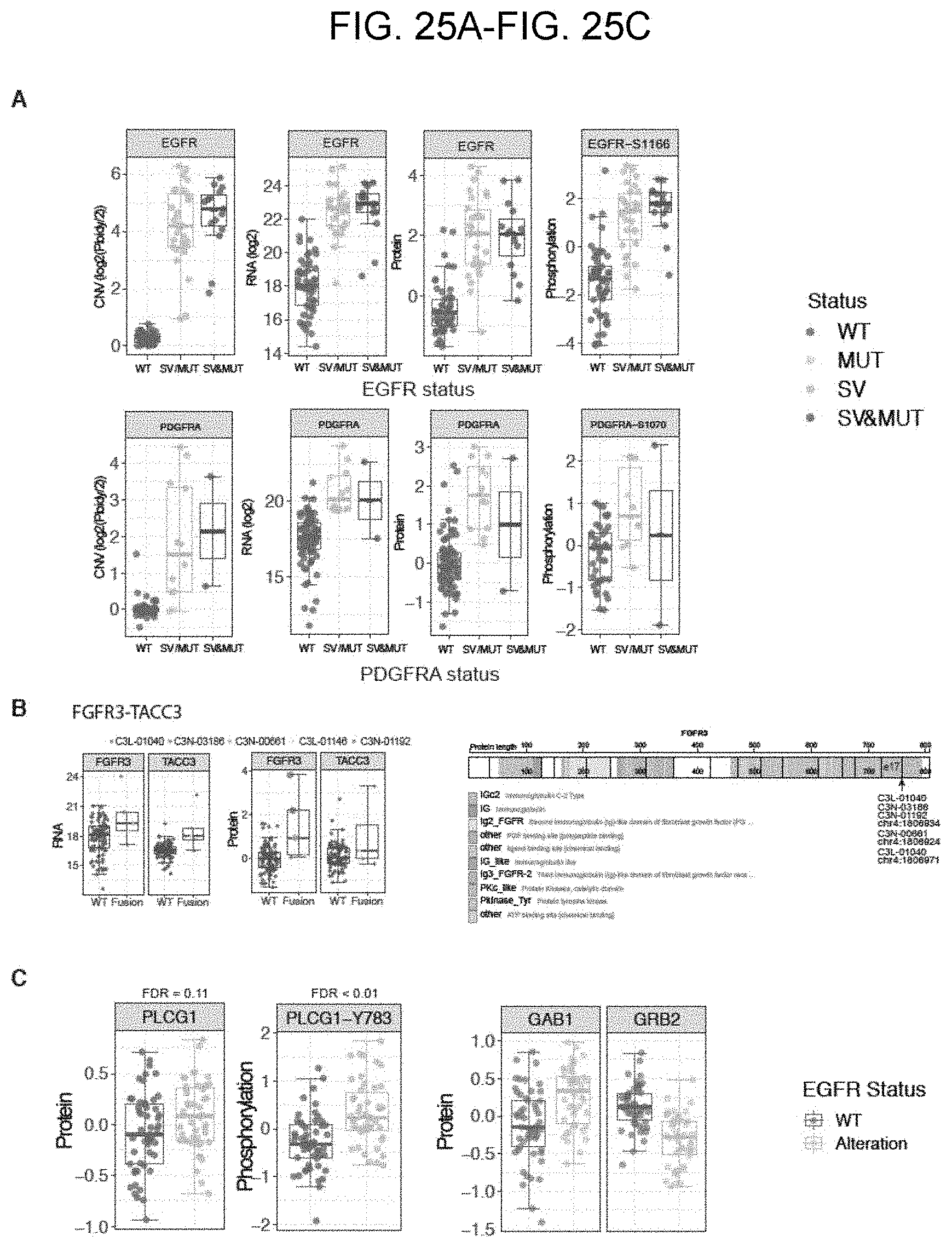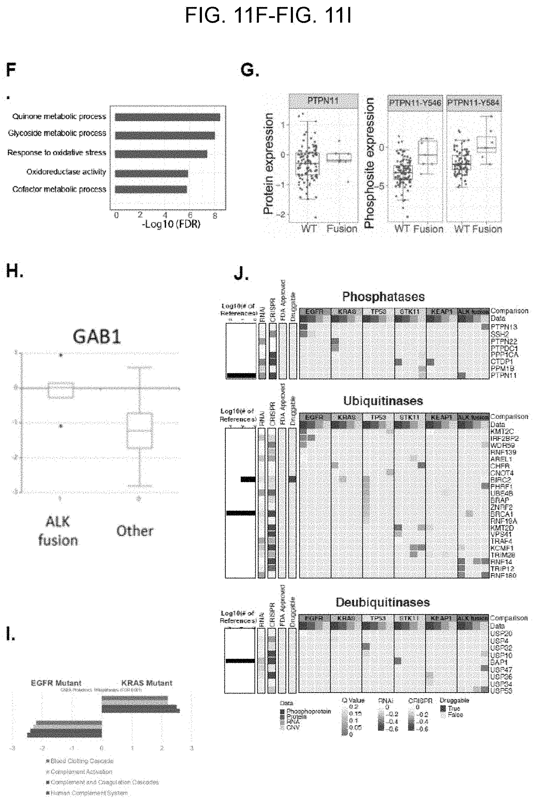 detecting upregulated PTPN11 in the tumor or tumor cell; and administering a PTPN11 inhibitor to the tumor or tumor cell in an amount effective to inhibit PTPN11. 2. The method of 3. The method of 4. The method of 5. The method of 6. The method of 7. The method of EGFR mutated- and ALK fusion-driven, a subject having a tumor comprising the tumor cell is treated with a Shp2 inhibitor, optionally selected from SHP099, TNO155, JAB-3068, RMC-4630, BBP 398, or RLY1971 and an ALK inhibitor, optionally selected from ceritinib; KRAS mutated, the subject or tumor cell is treated with SOS1 inhibition; KRAS and EGFR mutated, the subject or tumor cell is treated with SOS1 inhibition and PTPN11 (Shp2) inhibitor; EGFR mutated, the subject or tumor cell is treated with a PTPN11 (Shp2) inhibitor and an EGFR tyrosine kinase inhibitor; EGFR mutated, the subject or tumor cell is treated with a modulator or inhibitor of: PHLDA1, PHLDA3, SOX9, CTNND2 (δ-catenin), CDK6, or CDKN2C; EML4-ALK mutated, the subject or tumor cell is treated with a WEE1 inhibitor; immune hot, the subject or tumor cell is treated with a combination of PD-1/PD-L1 blockade and 001 inhibitor; KEAP mutated, the subject or tumor cell is treated with a modulator or inhibitor of: TXNRD1, SRXN1, NQO1, ARK1C1, ARK1C3, GPX2, AKR1C2, BAG2, UGHD, ARK1B10, ARK1C4, TALDO1, GCLC, GCLM, UCHL1, AKR1B10, RMND1, PGD, GSR, or CYP4E11; KEAP mutated, the subject or tumor cell is treated with a modulator or inhibitor of: NFE2L2, AKR1C1, AKR1C1, NQO1, NFE2L2, CWC22, or MAP2; KEAP mutated, the subject or tumor cell is treated with a KEAP1/NFE2L2 interaction inhibitor; cancer testis (CT) antigen or neoantigen positive the subject or tumor cell is treated with immunotherapy or an inhibitor or modulator of KIF2C, IGF2BP3, PBK, PIWIL, BRDT, TEX15, or AKAP4; TP53 mutated, the subject or tumor cell is treated with a BRAF inhibitor or a EZH2 inhibitor; Treg upregulated, the subject or tumor cell is treated with anti-CTLA4 therapy; EGFR phosphoprotein positive (enriched), the subject or tumor is treated with a modulator or inhibitor of: WNK1, EGFR, CDK18, CSNK1D, NEK1, PDPK1, RIPK2, PI4KB, STK3, PAK4, DCLK1, DAPK1, NEK4, or STK25; KRAS phosphoprotein positive (enriched), the subject or tumor is treated with a modulator or inhibitor of: SLK, PRKCD, PRKCA, PRKD2, MAP3K2, KIT, MAST3, RPS6KC1, NRBP1, PRKAB2, FN3K, AATK, or NME1; TP53 phosphoprotein positive (enriched), the subject or tumor is treated with a modulator or inhibitor of: EGFR, RIPK2, DCLK1, CDK12, BRD2, MELK, BRAF, PKN1, NRBP1, TRIO, TLK2, PRPF4B, or RIOK1; STK11 phosphoprotein positive (enriched), the subject or tumor is treated with a modulator or inhibitor of: SLK, PKN2, TGFBR1, DYRK1B, or PRPF4B; KEAP phosphoprotein positive (enriched), the subject or tumor is treated with a modulator or inhibitor of: PAK4, DCLK1, TRIO, TLK2, BRD2, TGFBR1, TRIM28, MAPKAPK5, MAP3K7, DYRK2, CDK7, PAK2, TRIO, TLK2, TRIM28, BUB1B, ITPK1, or TRPM7; or ALK phosphoprotein positive (enriched), the subject or tumor is treated with a modulator or inhibitor of: PTK7, PRKAG2, WEE1, LRRK2, NEK6, PTK7, PRKAG2, PKM, or RIPK3; or combinations thereof. 8. The method of 9. The method of 10. The method of RB1-altered, a subject having a tumor comprising the tumor cell is treated with an MCM inhibitor, optionally, ciprofloxacin; hypermethylated in MGMT promoter region, the subject or tumor cell is treated with temozolomide chemotherapy and radiotherapy; EGFR-altered having co-upregulation of CDK6 and EGFR, the subject or tumor cell is treated with CDK6 and EGFR inhibitors; BRAF V600E mutated having high H2B acetylation, the subject or tumor cell is treated with UBE2I inhibitors; CDK6 and UBE2I protein upregulated, the subject or tumor cell is treated with UBE2I inhibitors; RTK-altered, the subject is treated with anti-Shp2 therapy; ATRX and IDH1 mutated, the subject or tumor cell is treated with a TNIK inhibitor; immune cold (immune-low), the subject is treated with a modulator or inhibitor of: PTGR2, PDE4D, MAOA, MUC5B, or WFDC2 (HE4); immune hot (immune-high), the subject or tumor cell is treated with a CSF-1 or CSF-1R inhibitor, optionally, a CSF-1 receptor inhibitor, PLX3397; immune hot (immune-high), the subject or tumor cell is treated with a TAM infiltration inhibiting agent capable of targeting monocyte chemoattractant proteins (MCPs) family members in humans or an MCP inhibitor, wherein the MCPs targeted are optionally, CCL2, CCL7, CCL8, CCL13; immune hot (immune-high), the subject or tumor cell is treated with a combination of PD-1/PD-L1 blockade and 001 inhibitor; immune hot (immune-high), the subject or tumor cell is treated with a modulator or inhibitor of: IDO1 immune checkpoint proteins, optionally, CTLA-4, PD-1, or TIM-3; WARS; LCK; CD4, TYMP; or B2M; mesenchymal-like GBM, the subject or tumor cell is treated with anti-angiogenic agents, optionally, bevacizumab, and immunotherapy; mesenchymal GBM having elevated ALOX5 expression, the subject or tumor is treated with a GPX4 inhibitor, optionally, the GPX4 inhibitor is RSL3; hyperacetylation of H2B, the subject or tumor cell is treated with CREBBP/EP300 inhibitors; IDH mutated, the subject or tumor cell is treated with a GLUD1 inhibitor; IDH mutated or proneural tumor, having upregulated AKT3, the subject or tumor is treated with an AKT3 inhibitor; PTEN downregulated, the subject or tumor cell is treated with a modulator or inhibitor of: AKT1 or AKT2; proneural and IDH-mutated, having amplified PDGFRA, higher RNA, protein, and phosphosite abundance of PDGFRA, the subject or tumor is treated with a PDGFRA inhibitor; GSK3B, AKT1, or MAPK1 phosphorylation upregulated, the subject or tumor is treated with a GSK3B inhibitor, an AKT1 inhibitor, or a MAPK1 inhibitor, respectively; ERBB2 or SHC1 phosphorylation upregulated, the subject or tumor cell is treated with a ERBB2 inhibitor or SHC1 inhibitor, respectively; GSK3B, AKT1, MAPK1, MAPK3 and EGFR phosphorylation upregulated, the 