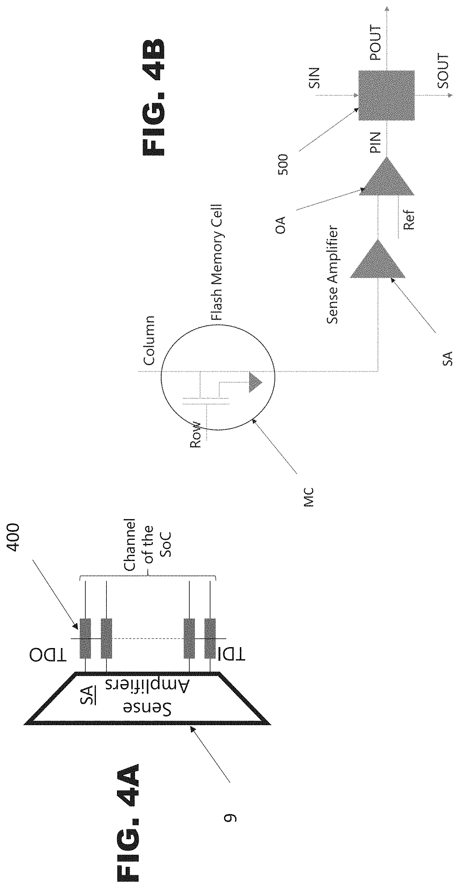 FIG. 4B is a schematic view of the connections between a generic memory cell and a corresponding sense amplifier with the inclusion of the modified JTAG cell according to the present disclosure;