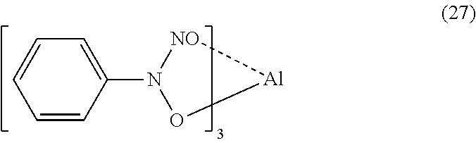 Evaluation result Experimental Experimental Chemicals Example 1 Example 2 p-Methoxyphenol Poor Poor Hydroquinone Fair Fair 2,5-Di-t-butylhydroquinone Fair Fair 2,5-Dihydroxybenzoquinone Excellent Excellent 2,3-Dihydroxynaphthalene Good Excellent Pyrogallol Excellent Excellent 1,2,4-Benzenetriol Excellent Excellent 2,2′,4,4′-Tetrahydroxybenzophenone Excellent Excellent N-Nitrosophenylhydroxylamine aluminum Poor Poor salt p-Toluenesulfonic acid Poor Poor Phenothiazine Poor Poor Benzoquinone Poor Poor Aluminum chloride Poor Poor o-Nitrotoluene Poor Poor Melamine Poor Poor (Materials Used in Examples)