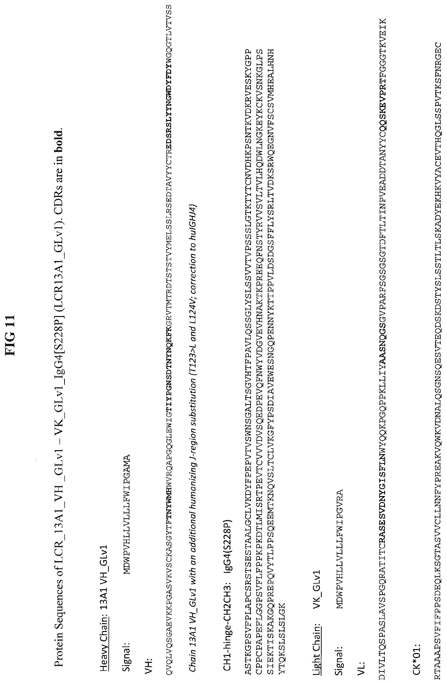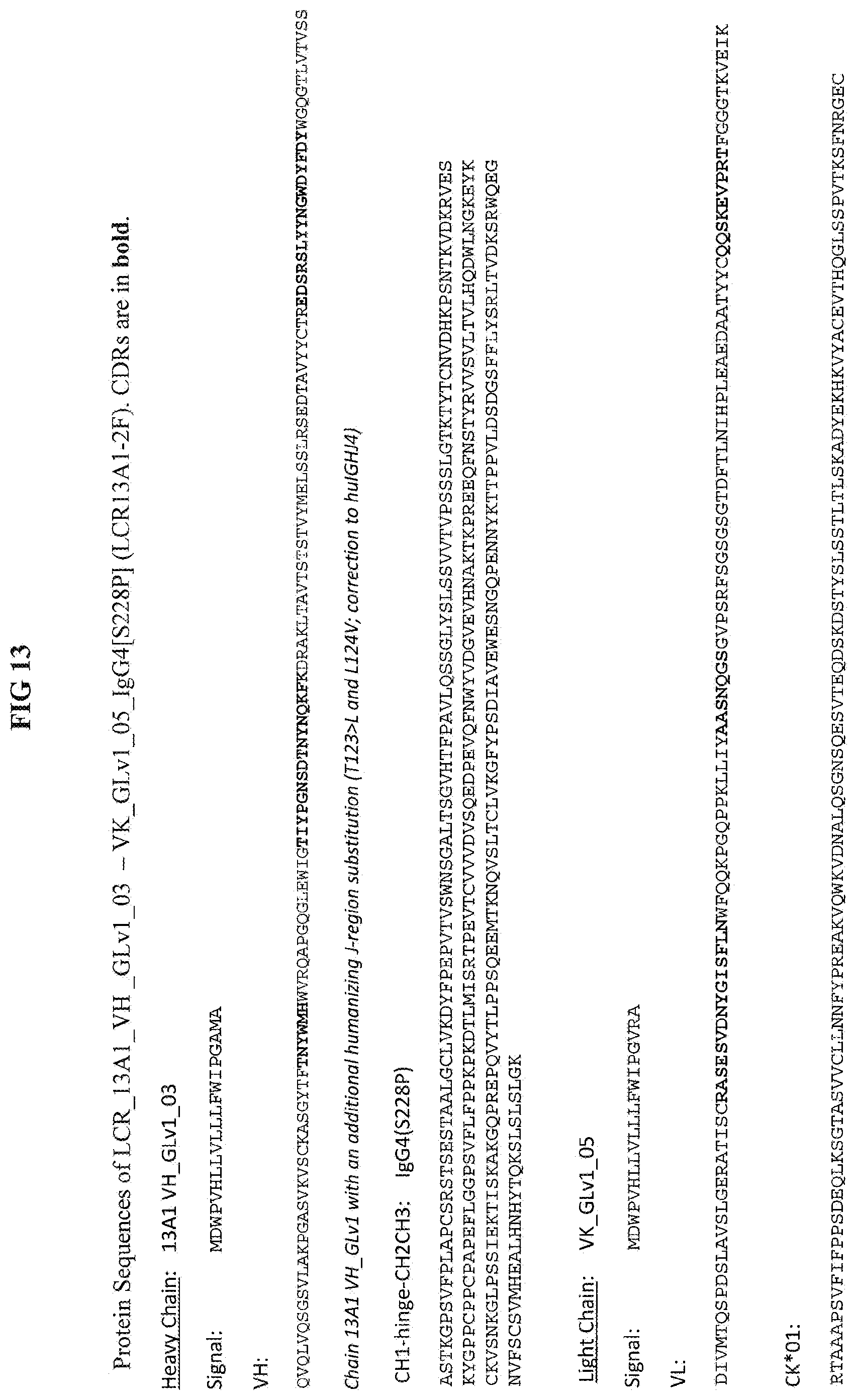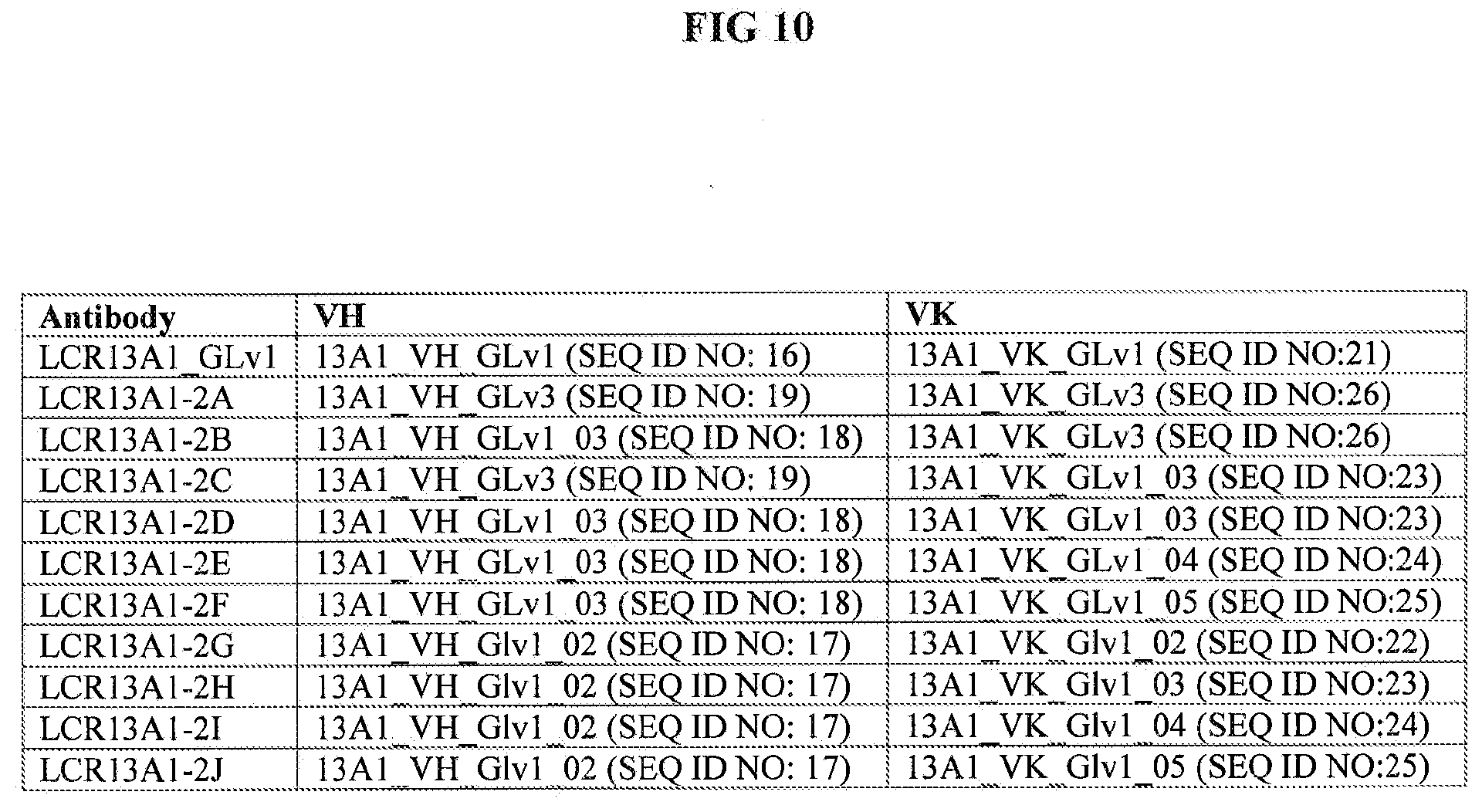 LCR13A1_VK_GLv3_02 (SEQ ID NO: 52) + 13A1_AF LCR13A1_VH_GLv1_04 (SEQ ID NO: 57) LCR13A1_VK_GLv3_02 (SEQ ID NO: 52) + 13A1_AG LCR13A1_VH_GLv1_05 (SEQ ID NO: 58) LCR13A1_VK_GLv3_02 (SEQ ID NO: 52) + 13A1_AH LCR13A1_VH_GLv1_06 (SEQ ID NO: 59) LCR13A1_VK_GLv1_06 (SEQ ID NO: 53) + 13A1_BF LCR13A1_VH_GLv1_04 (SEQ ID NO: 57) LCR13A1_VK_GLv1_06 (SEQ ID NO: 53) + 13A1_BG LCR13A1_VH_GLv1_05 (SEQ ID NO: 58) LCR13A1_VK_GLv1_06 (SEQ ID NO: 53) + 13A1_BH LCR13A1_VH_GLv1_06 (SEQ ID NO: 59) LCR13A1_VK_GLv1_07 (SEQ ID NO: 54) + 13A1_CF LCR13A1_VH_GLv1_04 (SEQ ID NO: 57) LCR13A1_VK_GLv1_07 (SEQ ID NO: 54) + 13A1_CG LCR13A1_VH_GLv1_05 (SEQ ID NO: 58) LCR13A1_VK_GLv1_07 (SEQ ID NO: 54) + 13A1_CH LCR13A1_VH_GLv1_06 (SEQ ID NO: 59) LCR13A1_VK_GLv1_08 (SEQ ID NO: 55) + 13A1_DF LCR13A1_VH_GLv1_04 (SEQ ID NO: 57) LCR13A1_VK_GLv1_08 (SEQ ID NO: 55) + 13A1_DG LCR13A1_VH_GLv1_05 (SEQ ID NO: 58) LCR13A1_VK_GLv1_08 (SEQ ID NO: 55) + 13A1_DH LCR13A1_VH_GLv1_06 (SEQ ID NO: 59) LCR13A1_VK_GLv1_09 (SEQ ID NO: 56) + 13A1_EF LCR13A1_VH_GLv1_04 (SEQ ID NO: 57) LCR13A1_VK_GLv1_09 (SEQ ID NO: 56) + 13A1_EG LCR13A1_VH_GLv1_05 (SEQ ID NO: 58) LCR13A1_VK_GLv1_09 (SEQ ID NO: 56) + 13A1_EH LCR13A1_VH_GLv1_06 (SEQ ID NO: 59) LCR13A1_VK(murine) + mu13A1 LCR13A1_VH(murine) LCR13A1_VK_GLv1_05 (SEQ ID NO: 25) + 13A1_2F LCR13A1_VH_GLv1_03 (SEQ ID NO: 18) VK Light Chain: